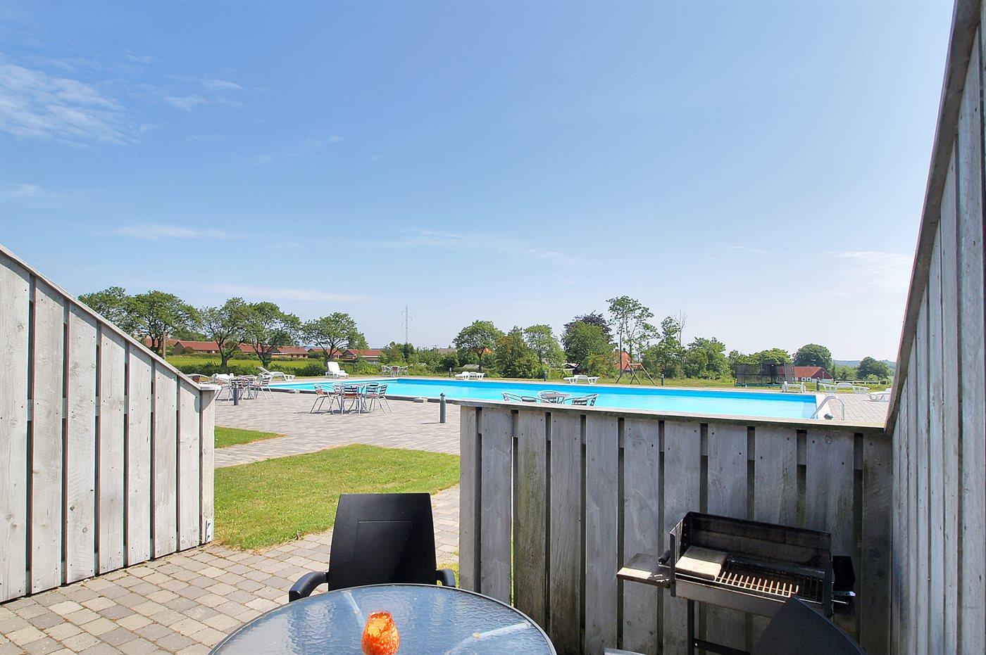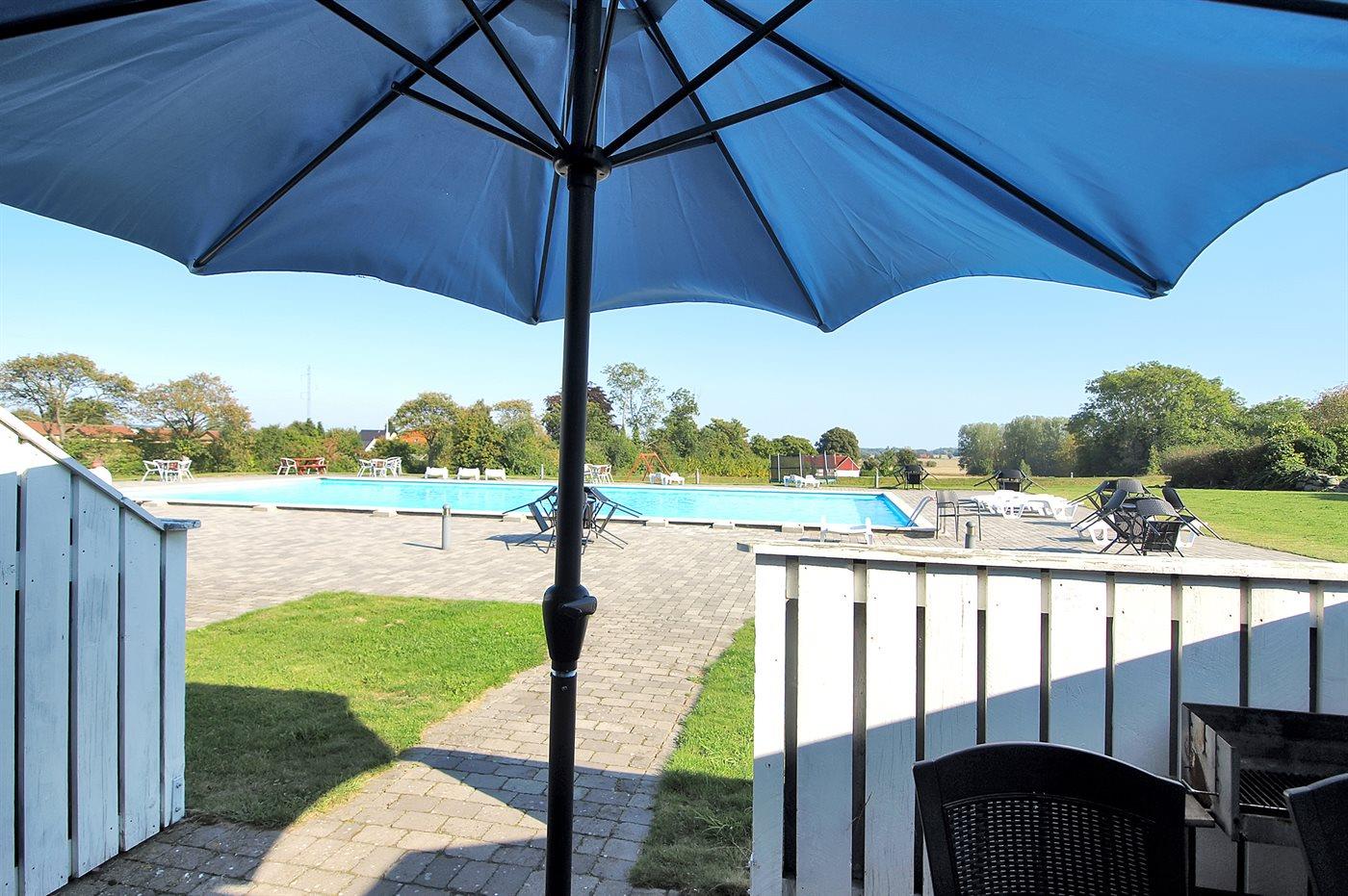 Lys ferielejlighed med egen afskærmet terrasse ud til swimmingpool. Lejligheden ligger på et fællesareal med bl.a. udendørs swimmingpool, som i perioden fra den 15/6 til 15/9 (fra kl. 8:00 til kl. 20:00) er opvarmet. På fællesarealet er der adgang til gynge, trampolin, fodboldbane og petanquebane.
