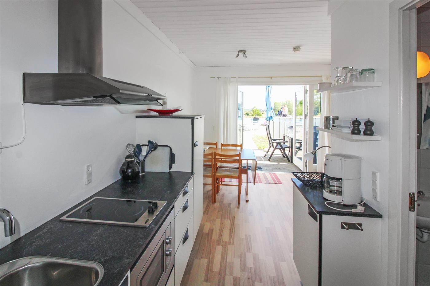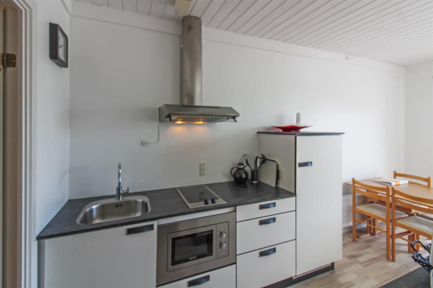 Køkkenet er udstyret med 1 køleskab. Der er 2 elkogeplader, miniovn, mikrobølgeovn.