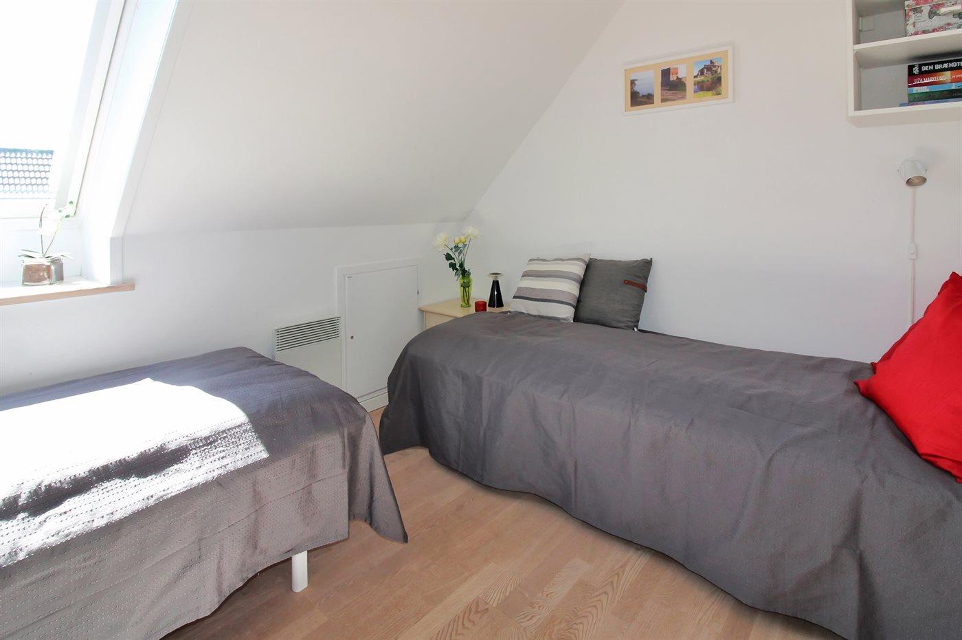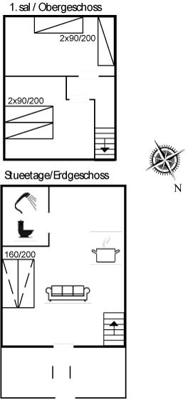 På 1. sal findes der 2 værelser i alt; 1 soveværelse med dobbeltseng, skabsplads, barnestol og weekendseng med madras samt 1 soveværelse med 2 enkeltsenge og skabsplads.