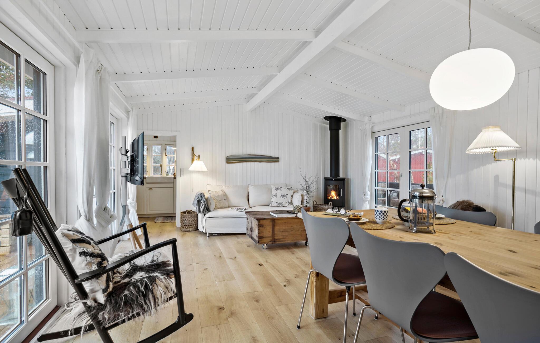 I kan tilbringe en afslappende ferie med hele familien i dette smukke sommerhus. Der venter jer et perfekt mix mellem klassisk sommerhushygge i en moderne indretning og med gode faciliteter. I den hyggelige stue er der ikke kun et dejligt opholdsområde med komfortable sofaer, men der er også spiseplads, hvor man kan nyde feriens måltider sammen. Det store rum oplyses dejligt udefra gennem gulv-til-loft-vinduerne der samtidig giver en fin udsigt til de grønne omgivelser.