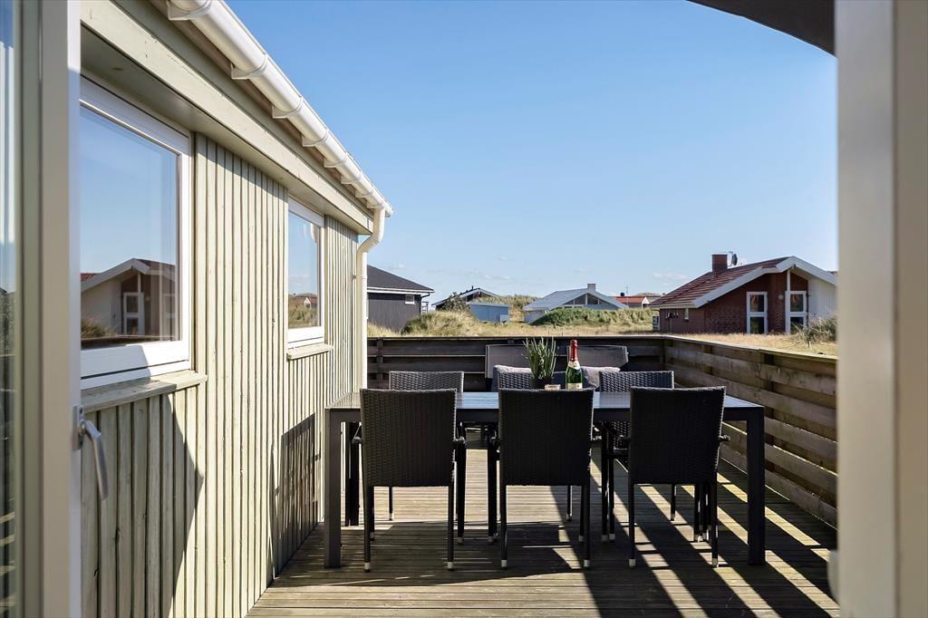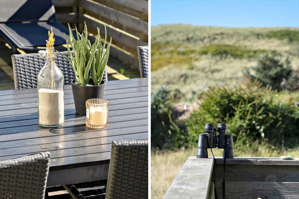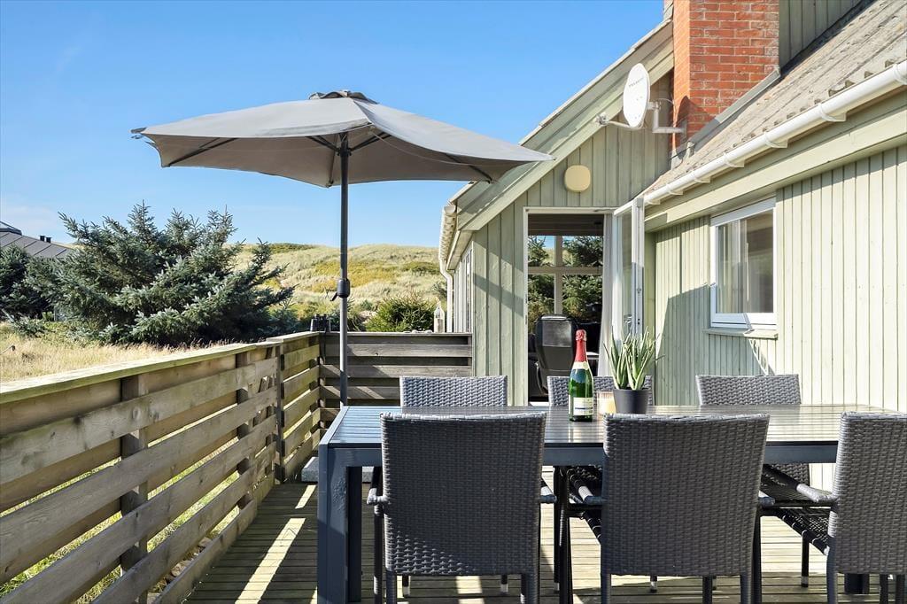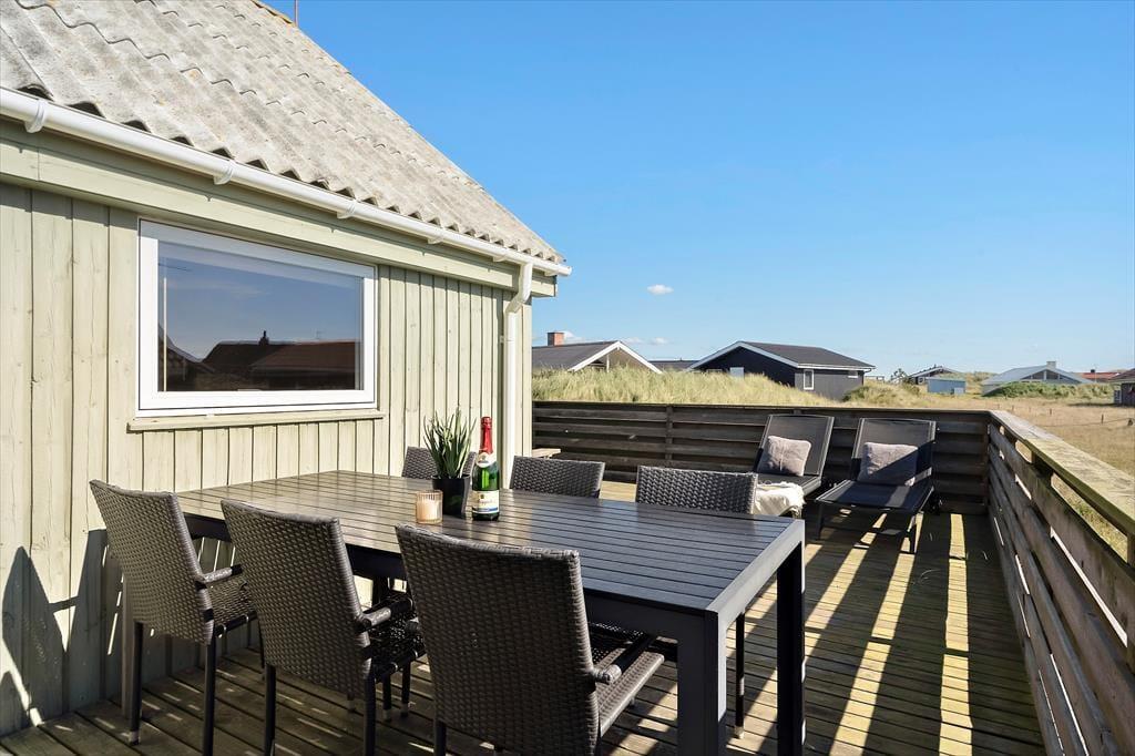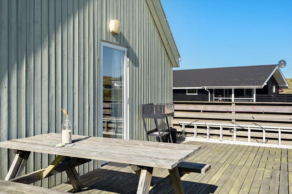 Sommerhusets lukkede terrasse er uden tvivl et af husets store trækplastre. For børnefamilier giver den en rolig tryghed – her kan børnene lege frit uden, at I behøver bekymre jer om, hvor de forsvinder hen. For de voksne er terrassen et naturligt samlingssted gennem hele dagen: start morgenen med kaffe og nybagte rundstykker i solen, nyd frokosten i læ for vinden og slut aftenen med grillmad og snak under stjernerne. Haven omkring huset er hyggelig og indrammer udelivet, så I altid finder en plet med læ og ro. Når I sidder herude, kan I høre havets brusen i baggrunden og måske endda ane duften af saltvand, som vinden bringer med sig. Vi i Søndervig ved, at netop disse øjeblikke – når tempoet falder, og I kan være sammen uden forstyrrelser – er noget af det, vores gæster husker allerbedst fra ferien.