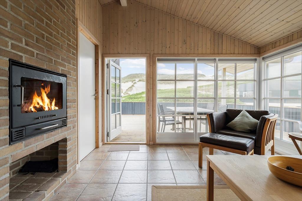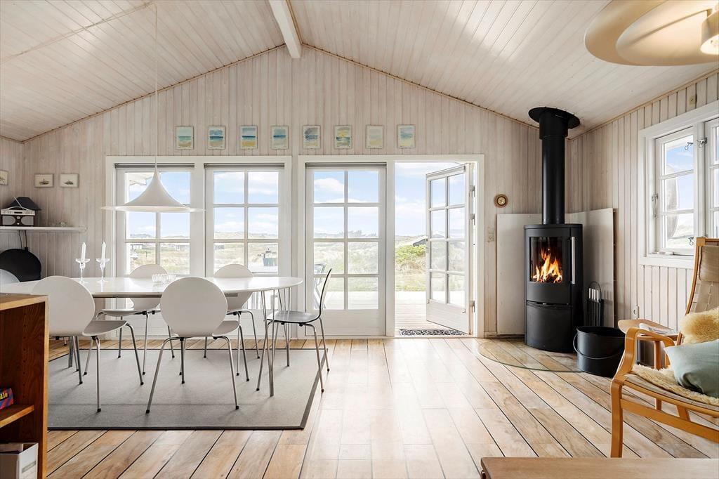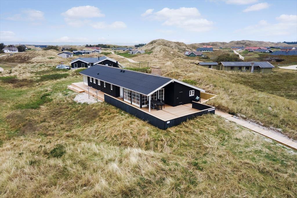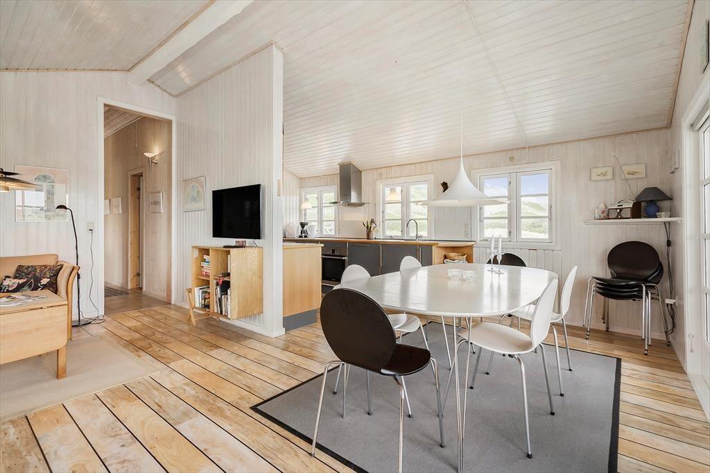 Sommerhuset blev moderniseret og tilbygget i 2008, så I har hele 120 flotte og velindrettede kvadratmeter at brede jer på. Atmosfæren er lys og skøn, og gennem vinduerne har I den flotteste udsigt til de høje klitter, der hæver sig over det naturskønne sommerhusområde. De tre soveværelser har gode bokssenge til i alt seks personer, og centralt i huset ligger to badeværelser, hvoraf det ene er med vaskesøjle og det andet med sauna. Husets skønne opholdsmiljø er også værd at bemærke. Ved entréen har I en lille kontorplads, mens et stort og indbydende køkken-alrum ligger i husets nordøstlige ende. Her er der brændeovn, fladskærms-tv og meget andet, der gør det til et perfekt sted at samles hele familien – og hvis I har mere lyst til en rolig stund med en god bog, kan I rykke ind i pejsestuen, hvor I kan sidde komfortabelt i skæret fra flammerne.