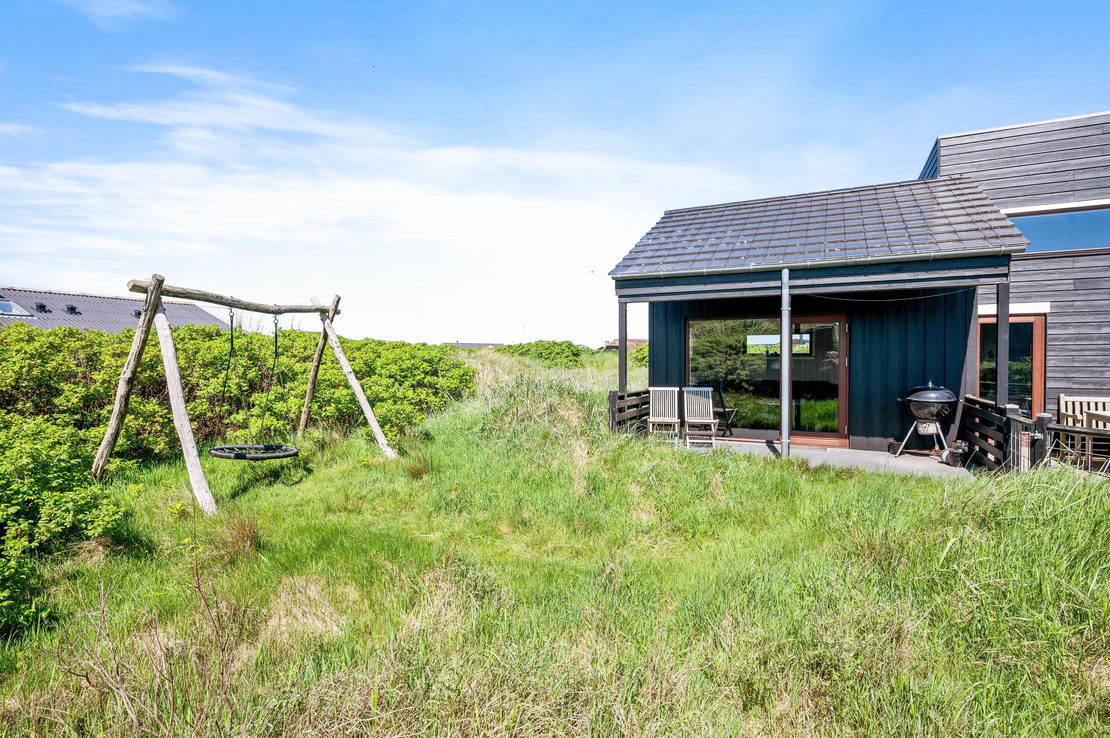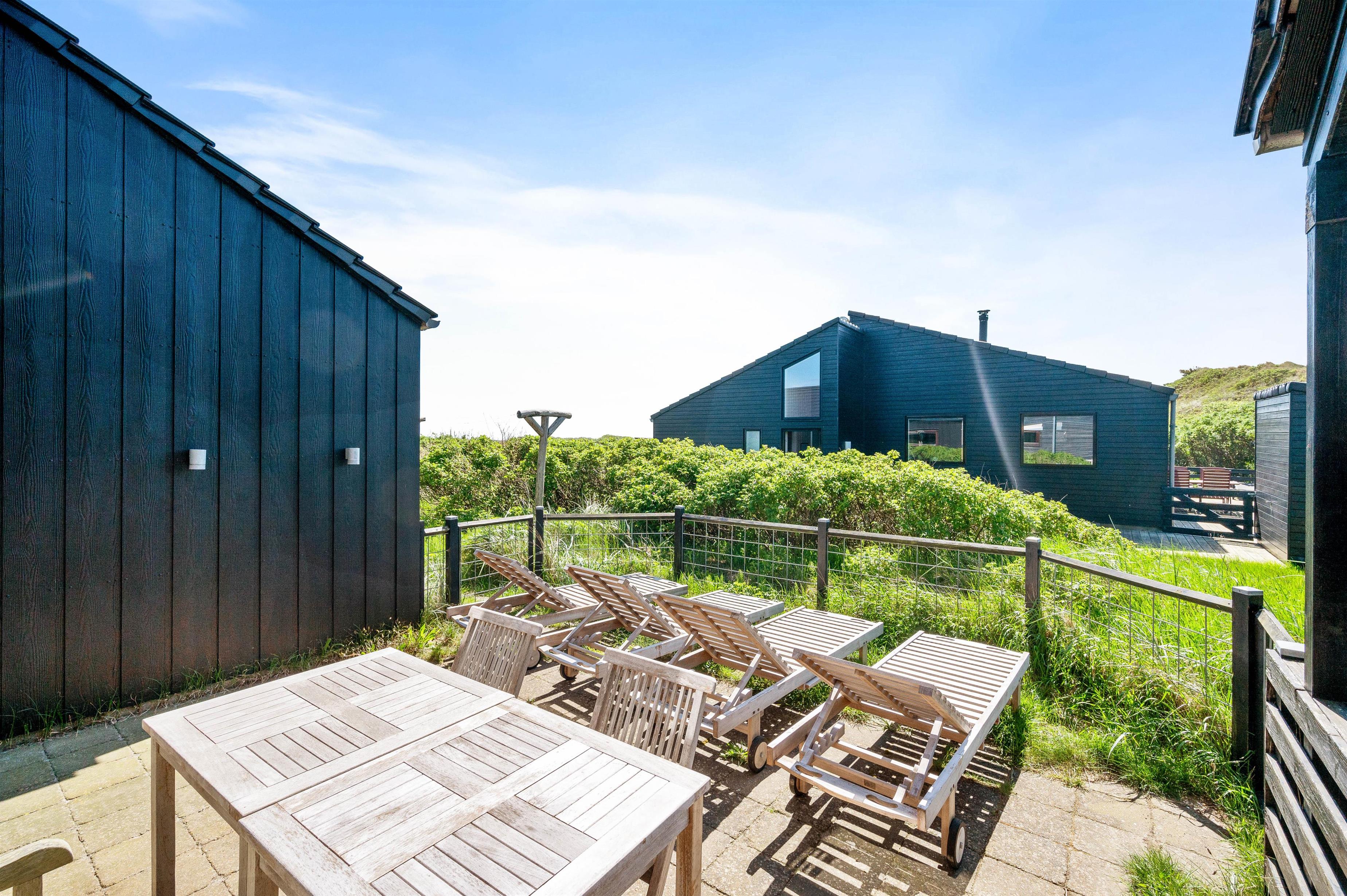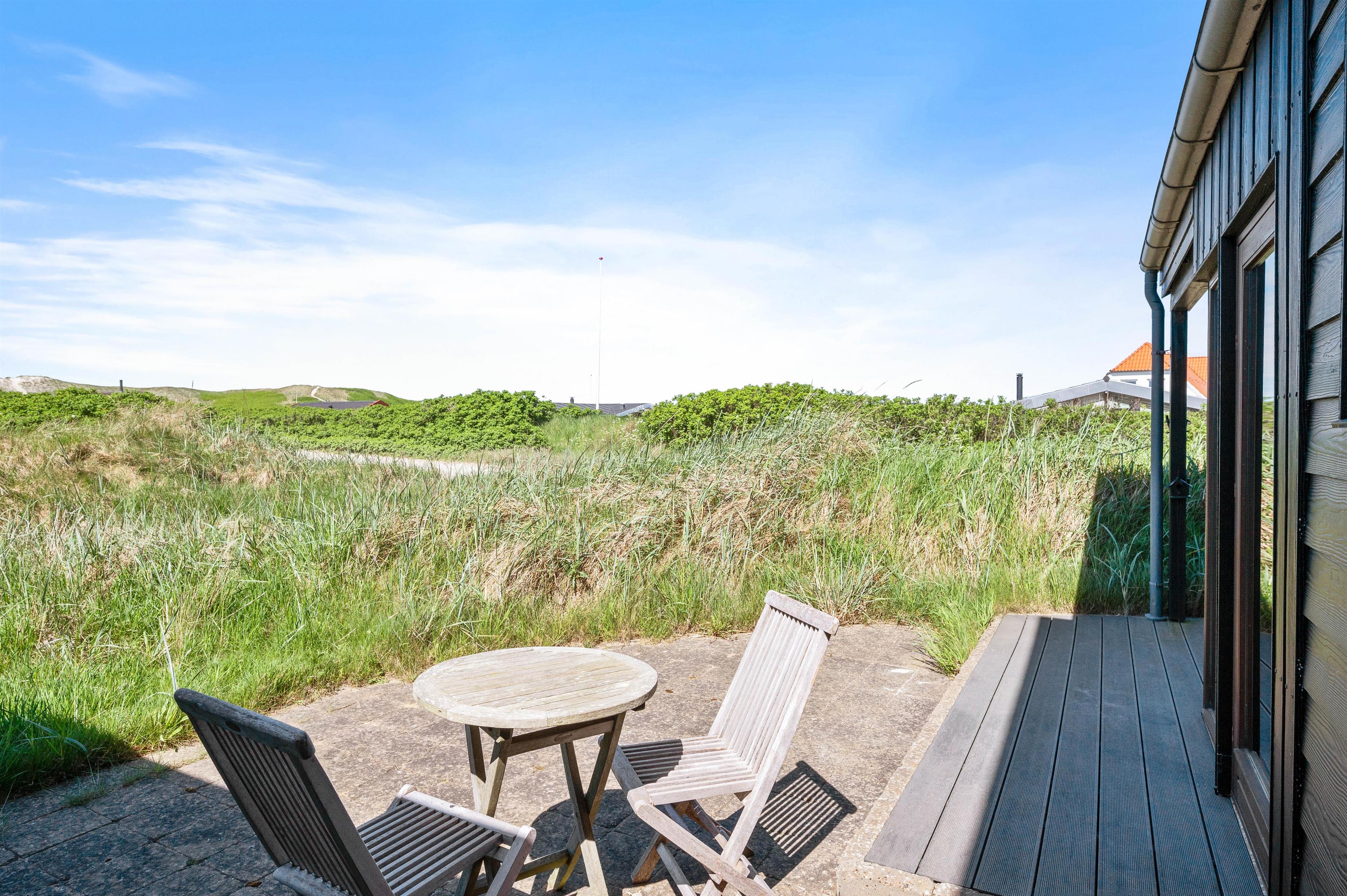 Udenfor venter jer en 1501m2 stor naturgrund, som I kan nyde fra husets både åbne, lukkede og overdækkede terrasse. Herfra kan I nyde udsigten over Ringkøbing Fjord og det frie udsyn til yderste klitrække mod havet uanset vejret. Den medfølgende grill og havemøbler er perfekte til sommerens lange grillfester.
