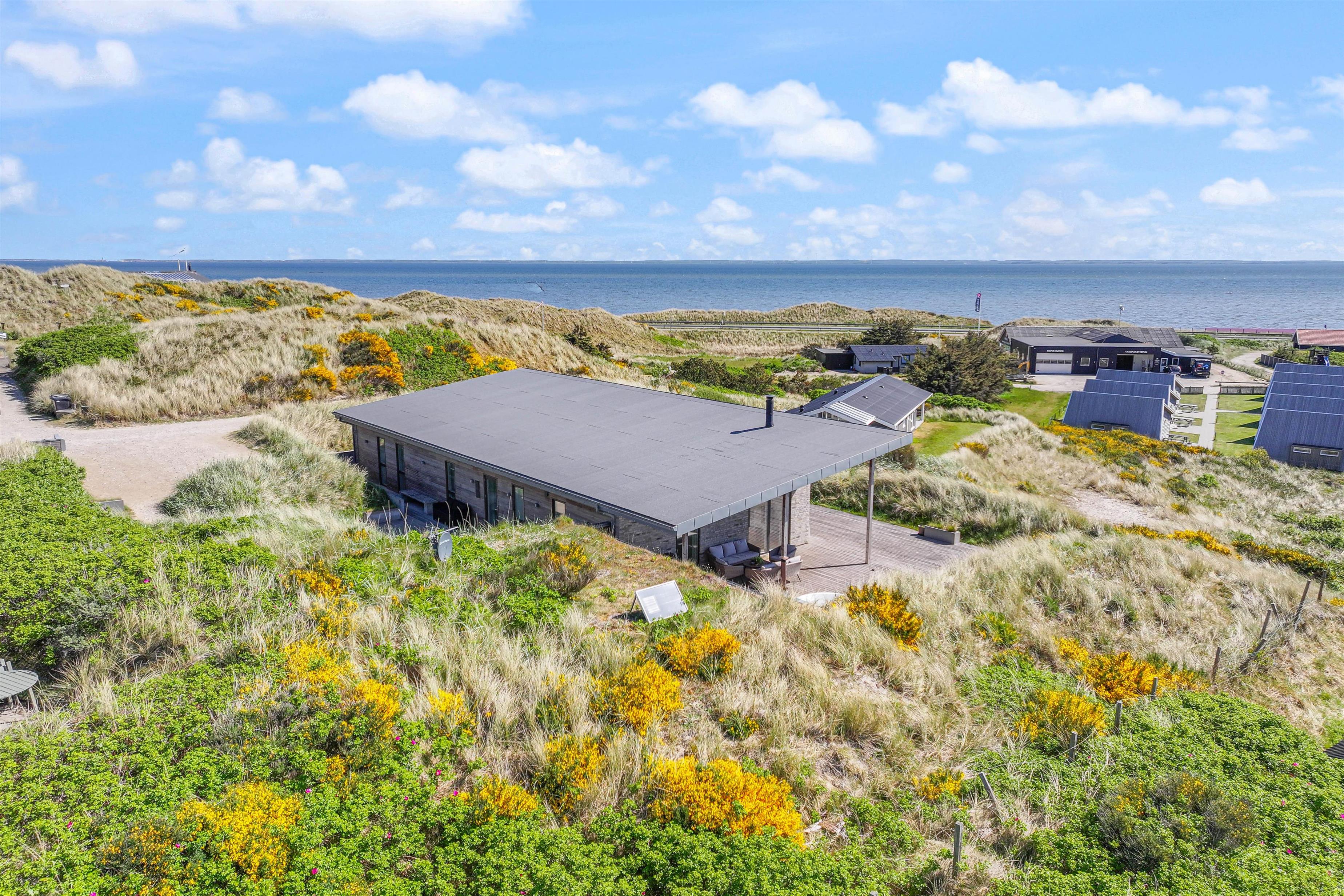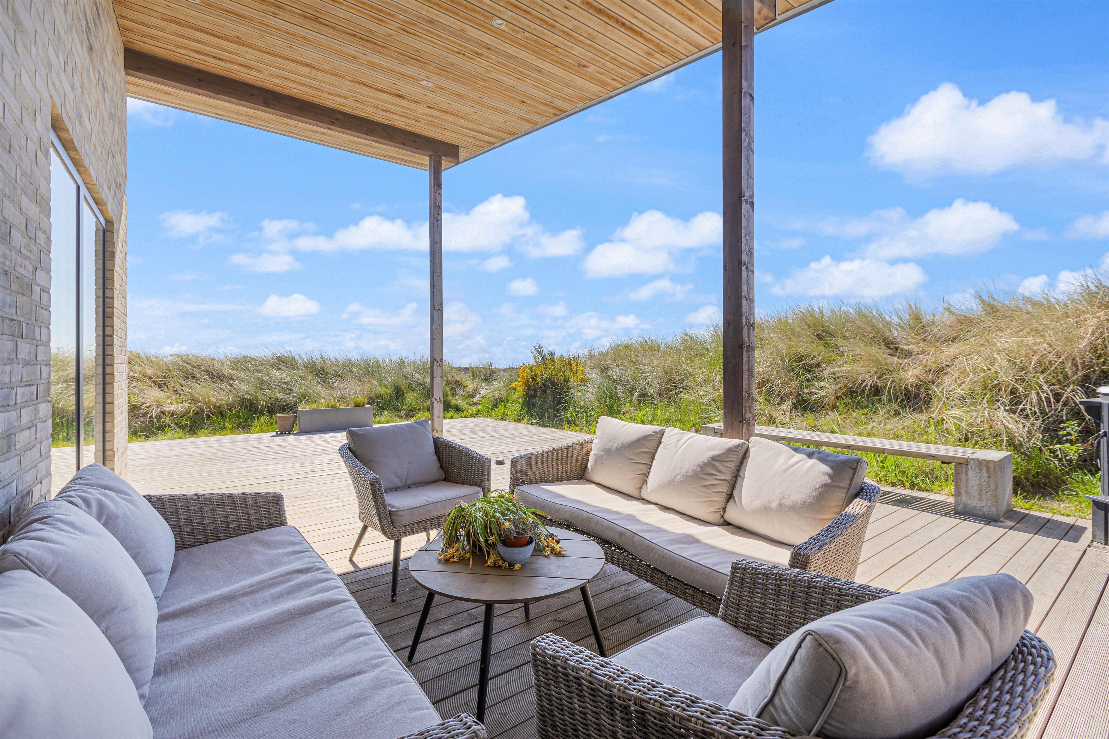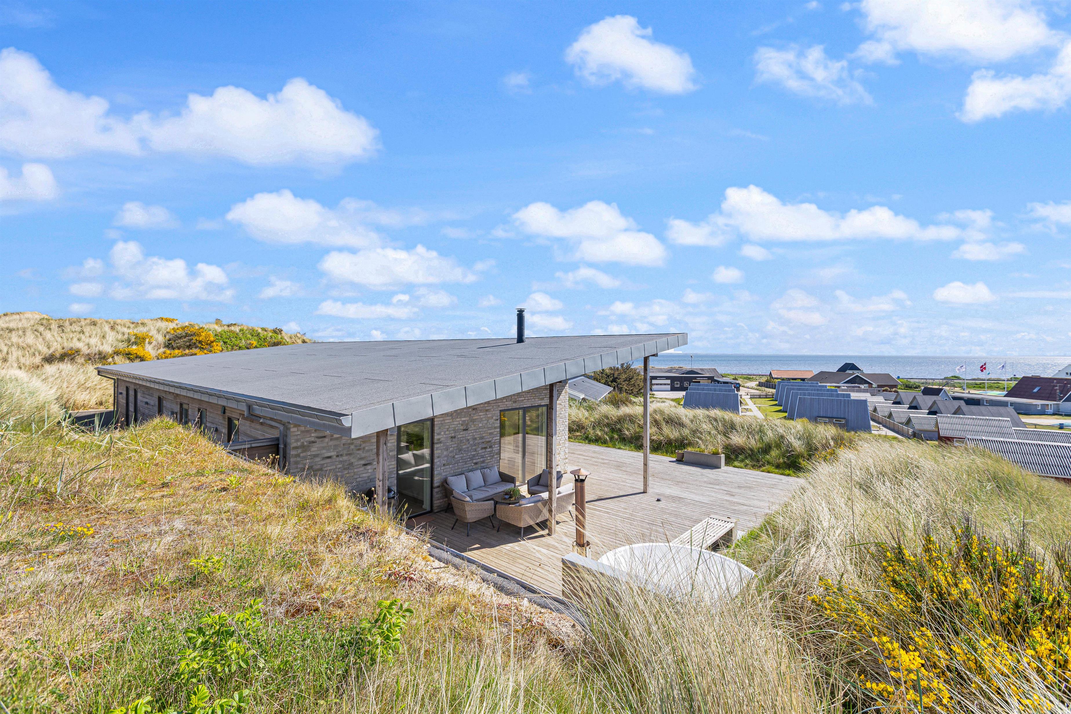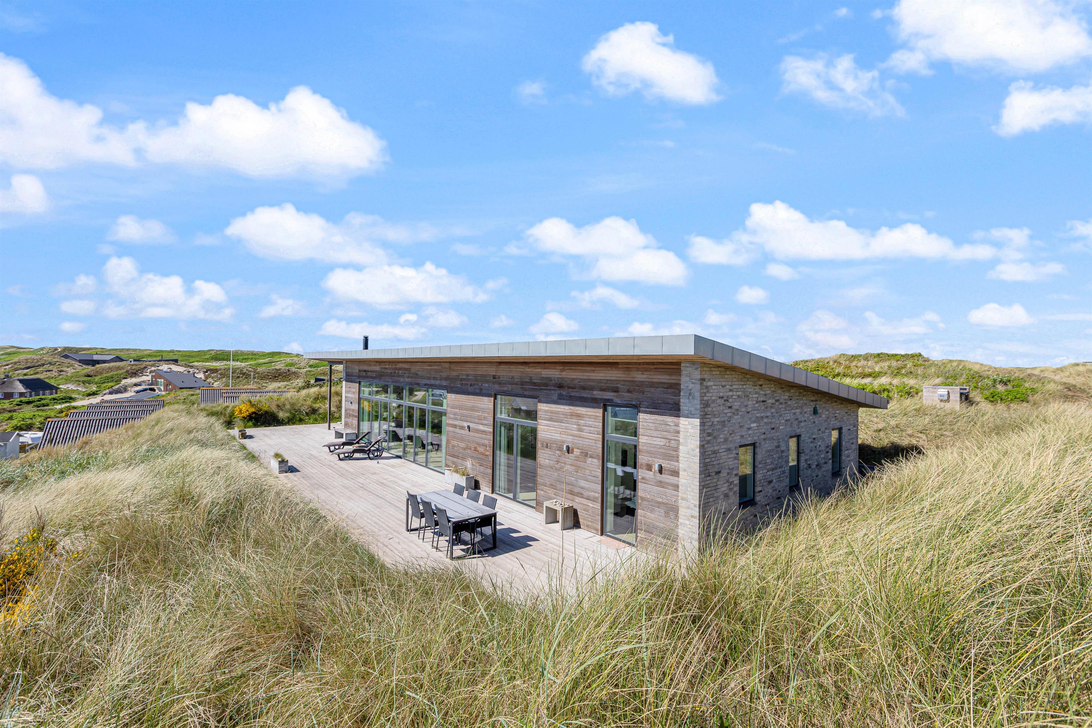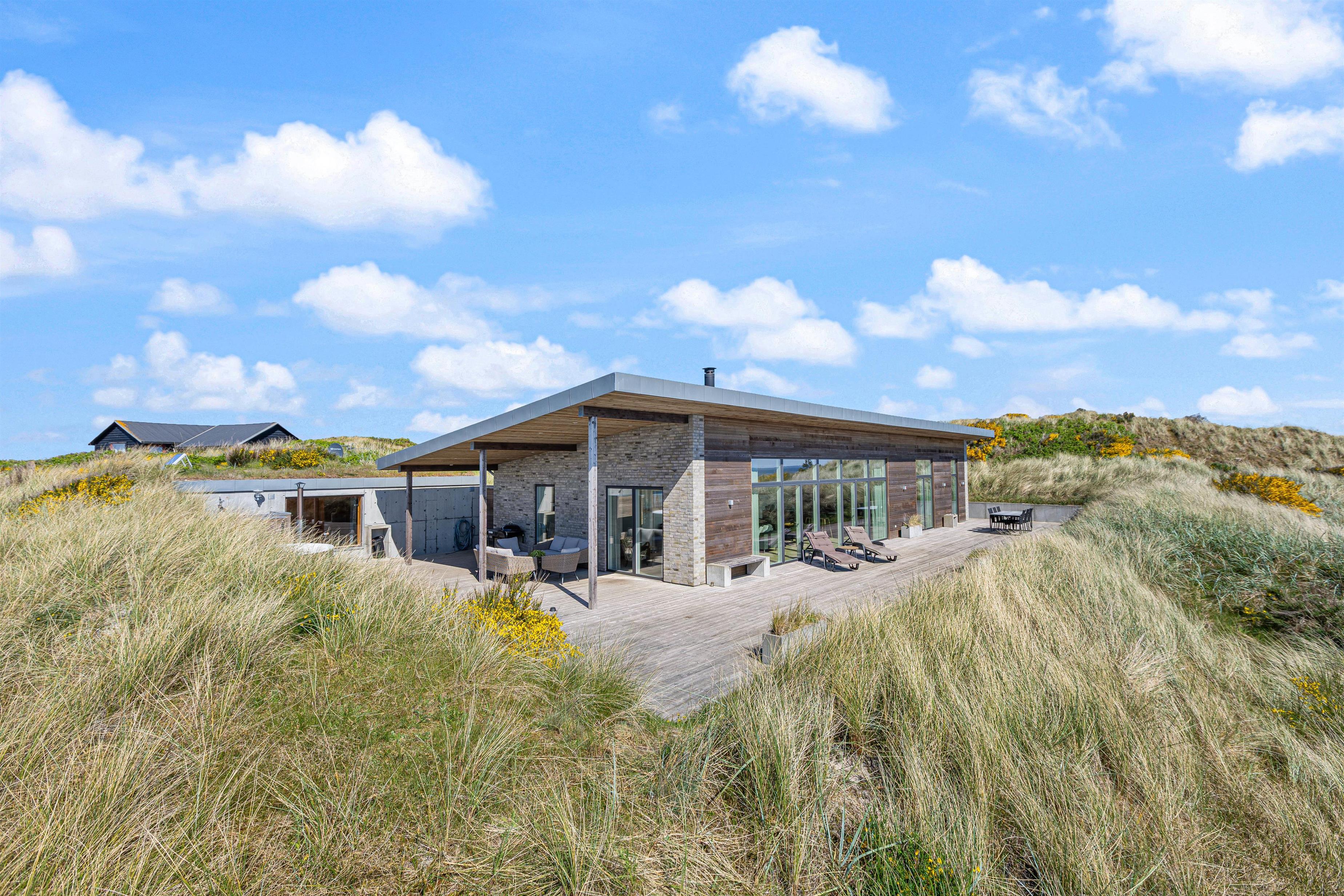 Flot, spændende og luksuriøst feriehus, opført 2019 i sten og træ, beliggende midt i en klit på Karen Brands Vej 60 i Årgab – og med en fantastisk panoramaudsigt udover over en del af sommerhusområdet og Ringkøbing Fjord.