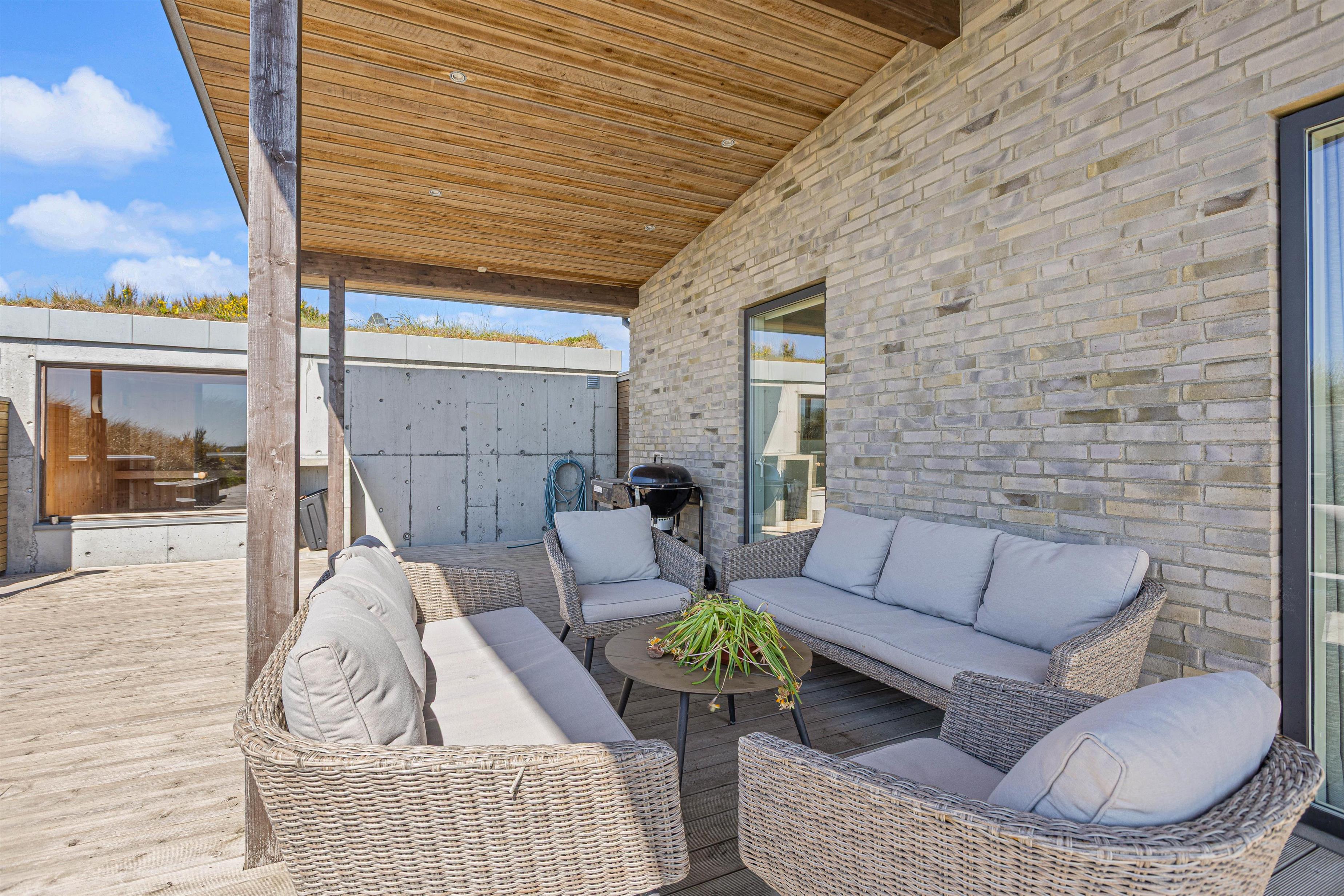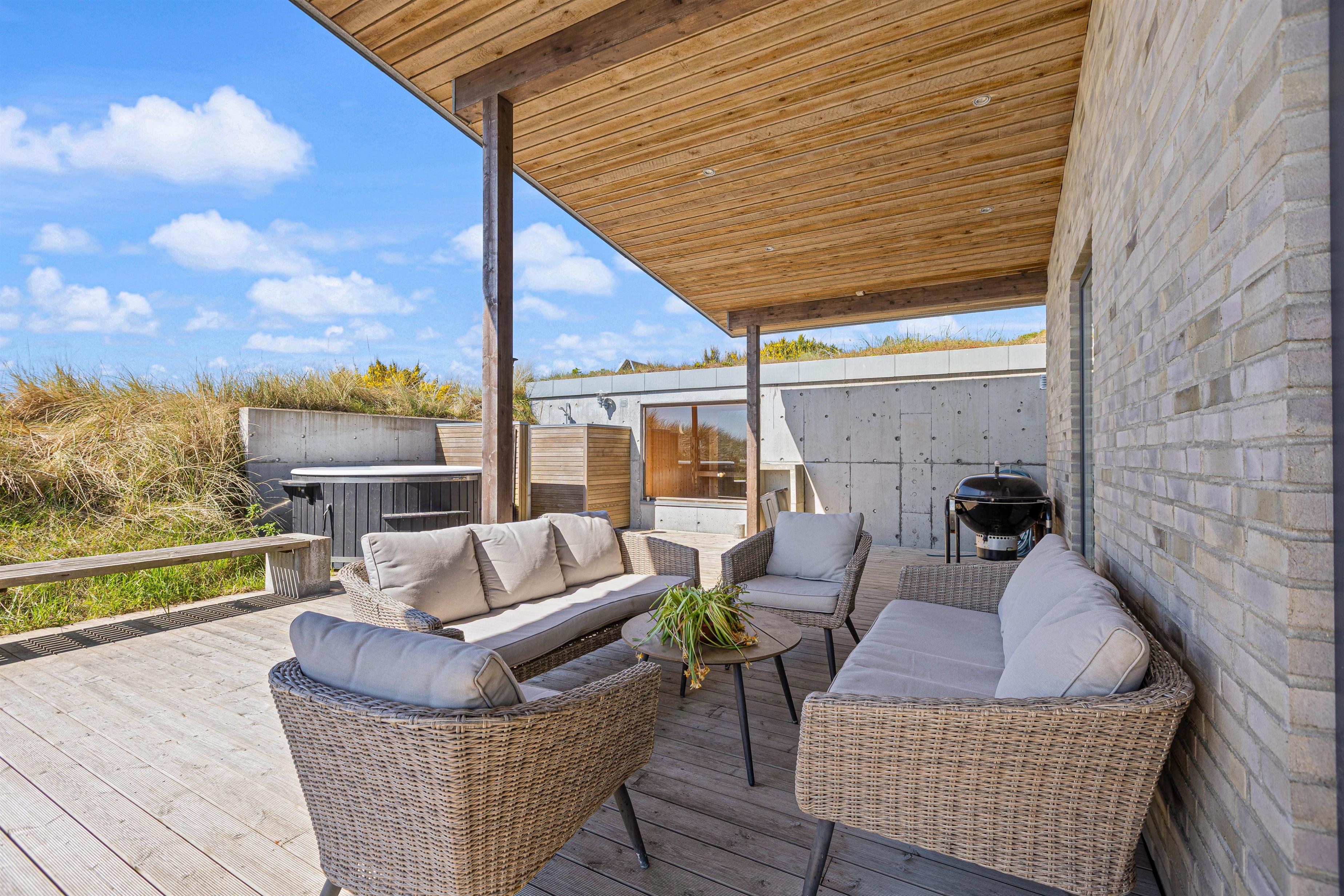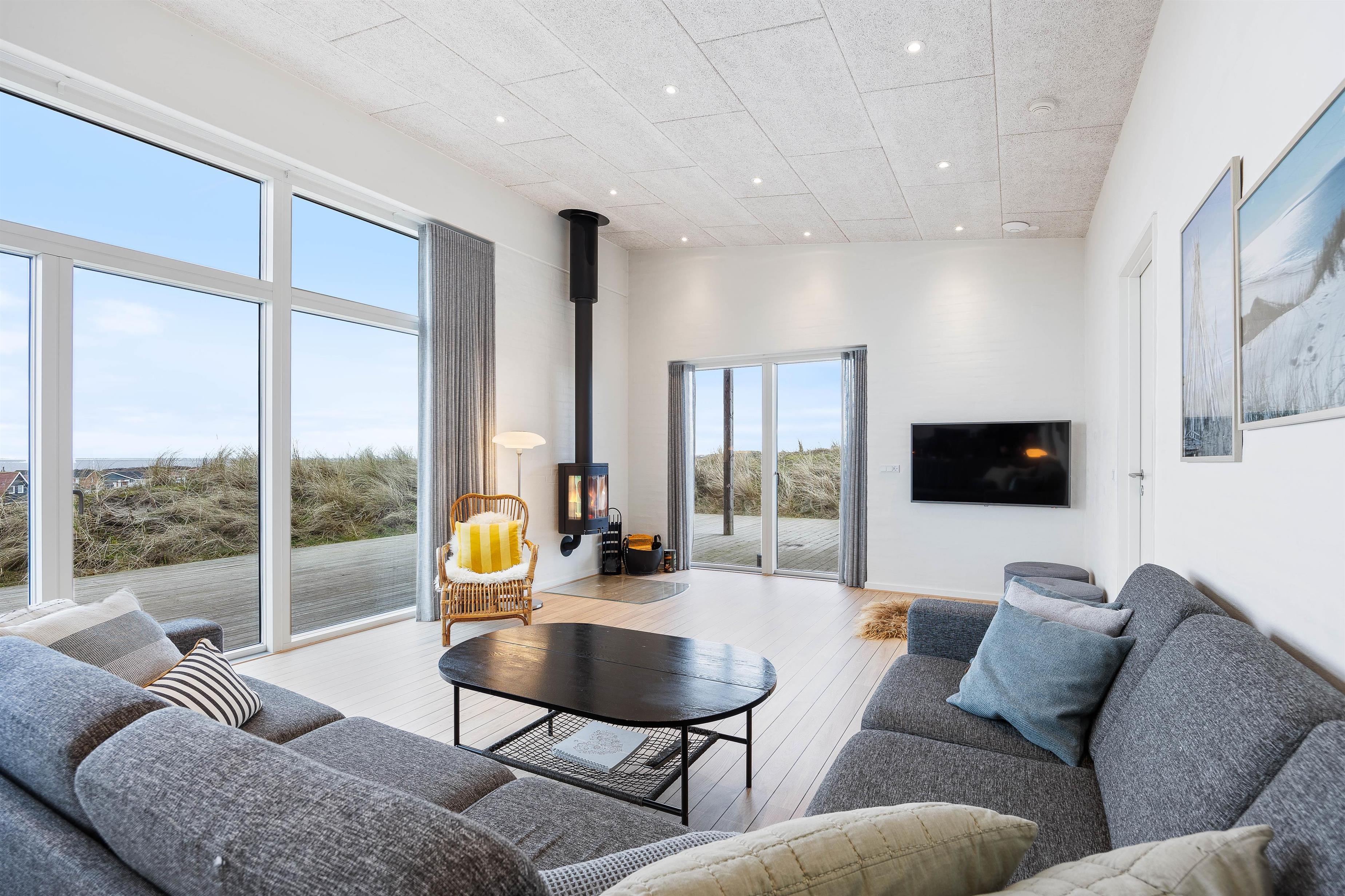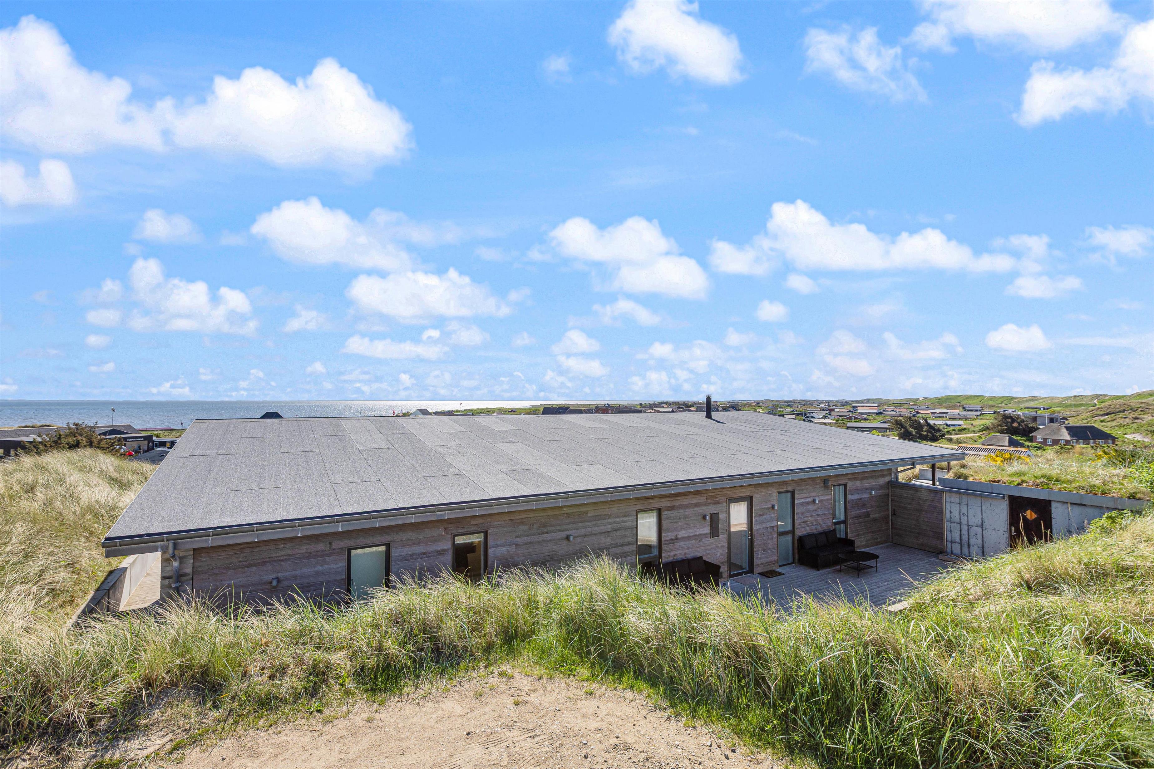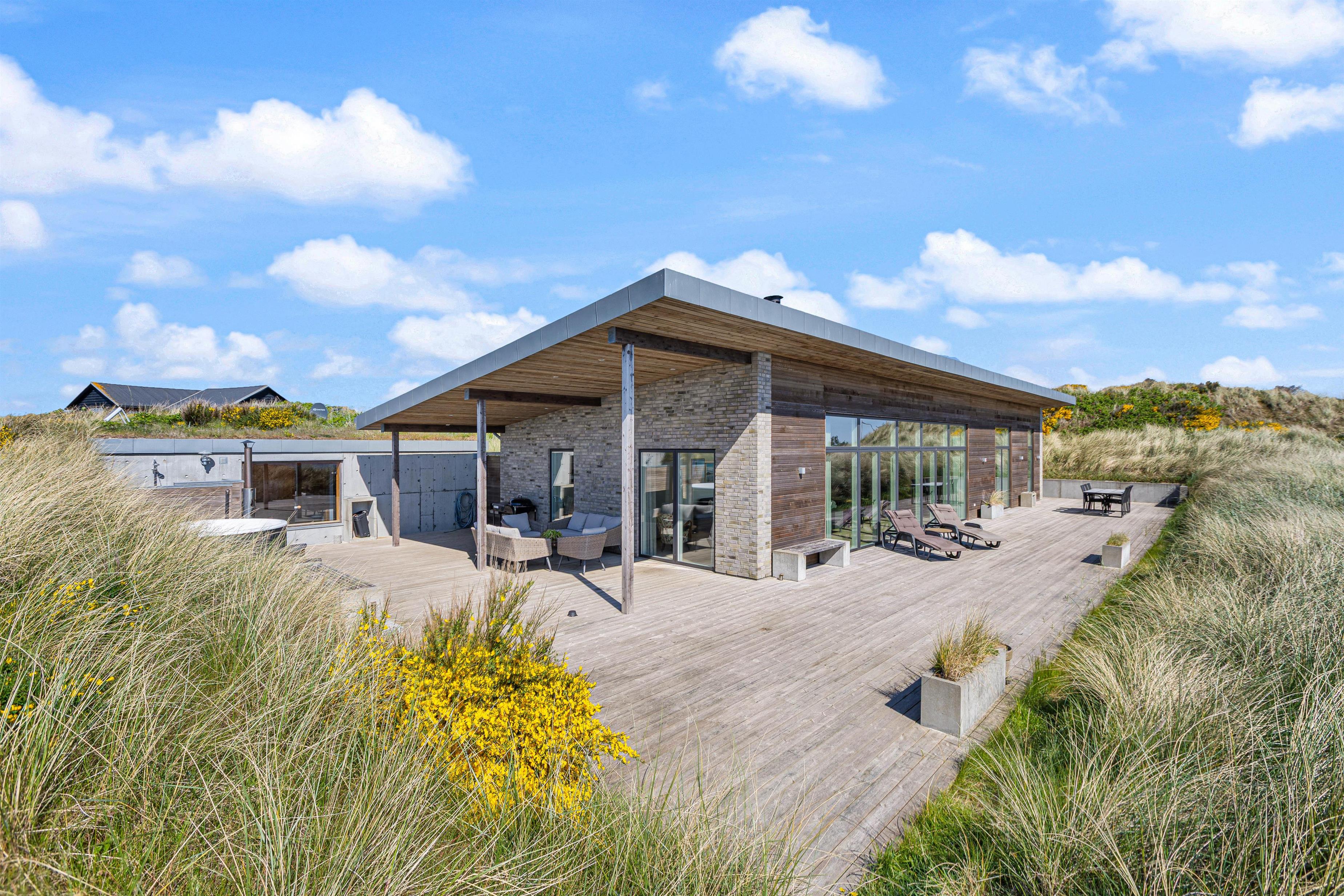Flot, spændende og luksuriøst feriehus, opført 2019 i sten og træ, beliggende midt i en klit på Karen Brands Vej 60 i Årgab – og med en fantastisk panoramaudsigt udover over en del af sommerhusområdet og Ringkøbing Fjord.