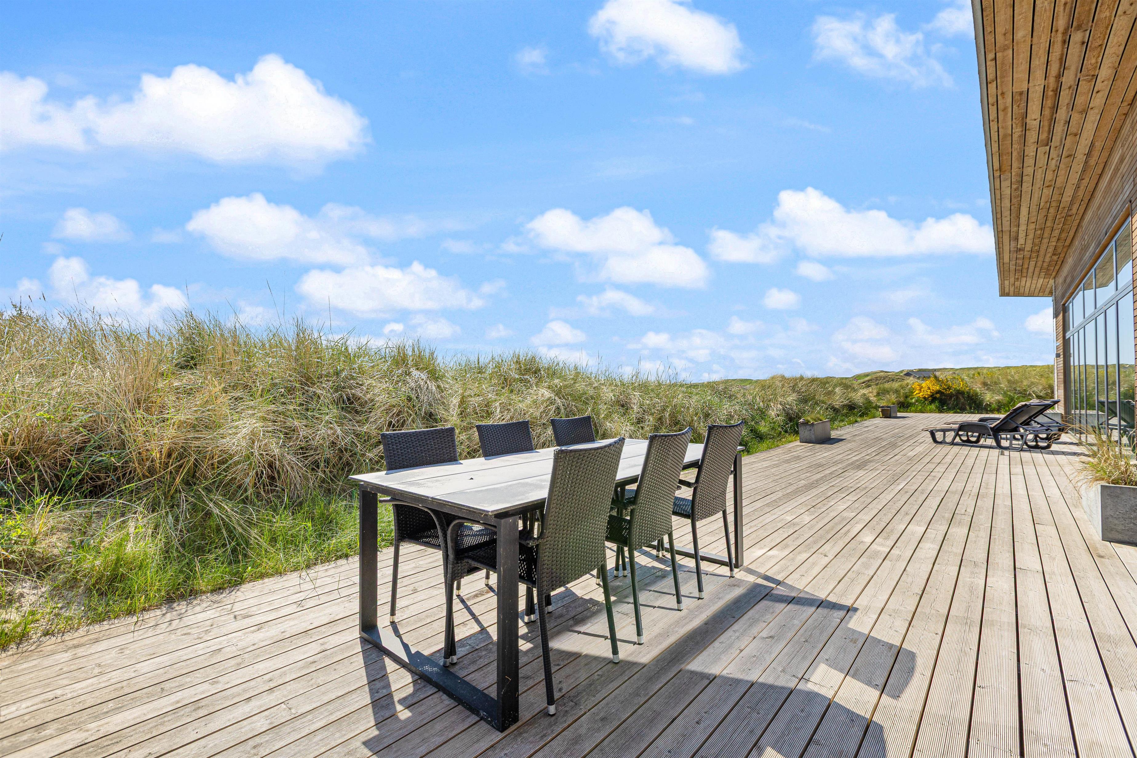 Der er skønne og store træterrasser hele vejen rundt om huset – og rig mulighed for at nyde den storslåede udsigt, samt finde læ og nyde solen. Man kan nyde morgenkaffen og solopgangen over fjorden mod øst – og eftermiddagen i solen mod syd.