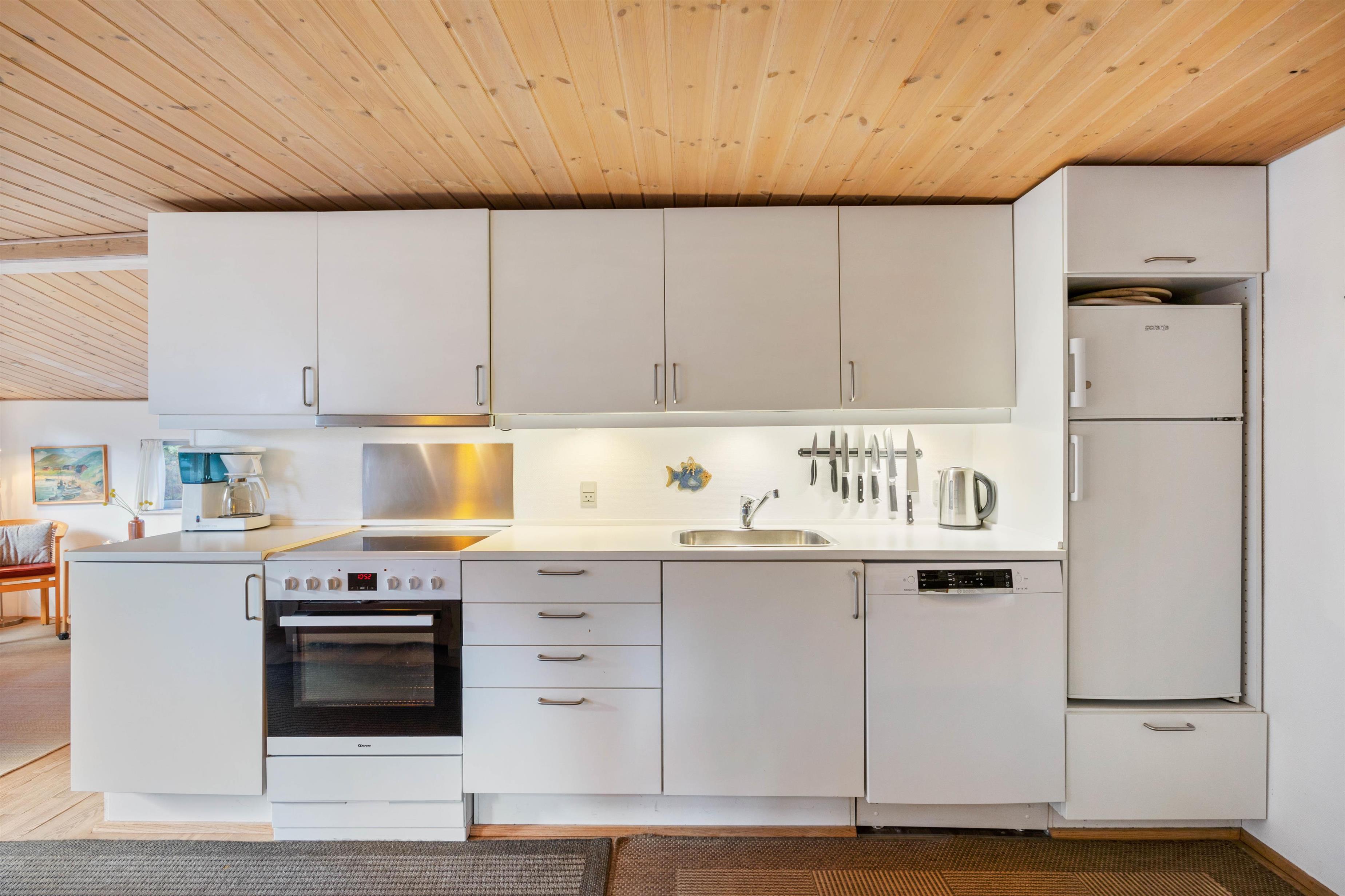I opholdsrummet er der plads til fælles hygge. I køkkenet finder I mange af hverdagens hjælpere såsom opvaskemaskinen, og sammen kan I her trylle lækre retter frem. Måske den står på burger-aften eller tapas? Efter maden kan I samles om sofabordet til hygge med alt fra ludo, yatzy eller fordybe jer i en god bog. På de køligere aftner kan I med fordel tænde op i brændeovnen, der både skaber varme og glæde i stuen.