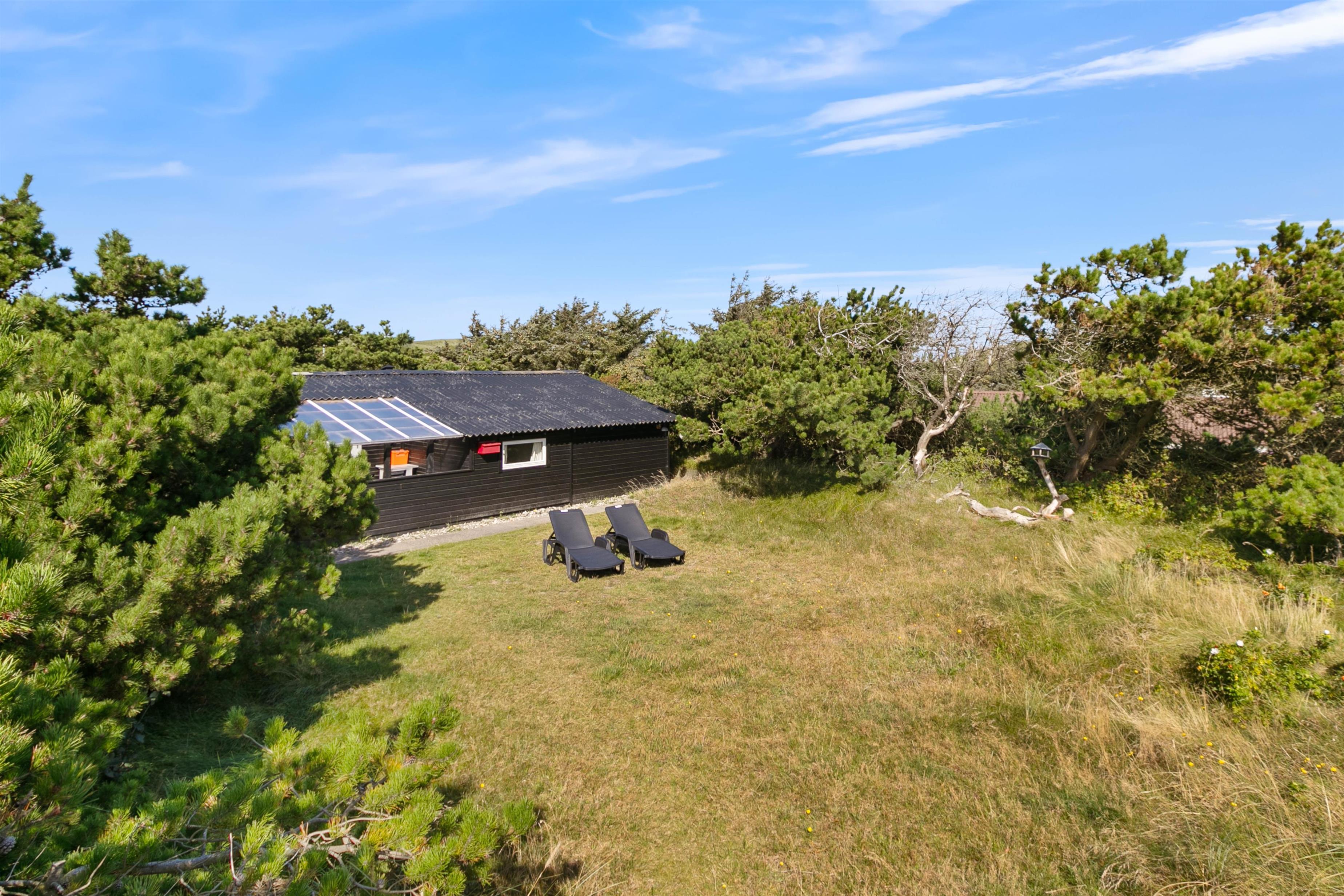 Bag træer og buske ligger dette fine sommerhus godt afskærmet fra naboerne. Her kan op mod fire gæster holde en dejlig ferie i rolige omgivelser nær Vesterhavet. Tænd op i brændeovnen og få slappet af på sofaen eller nyd livet på terrassen, der er lukket og delvist overdækket.