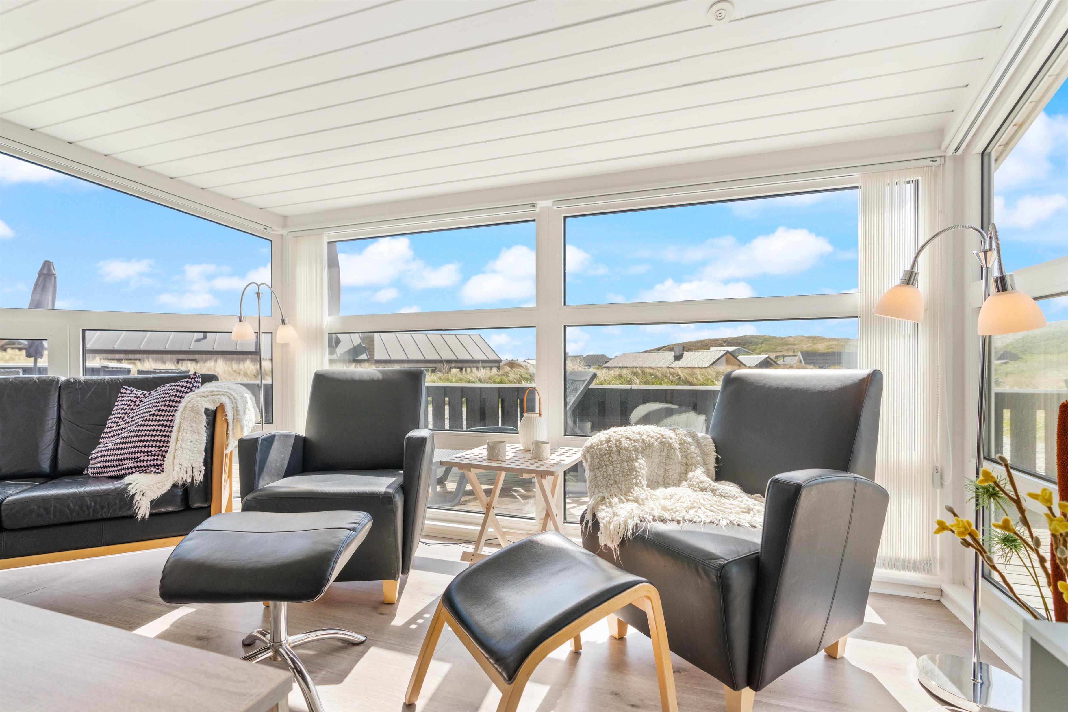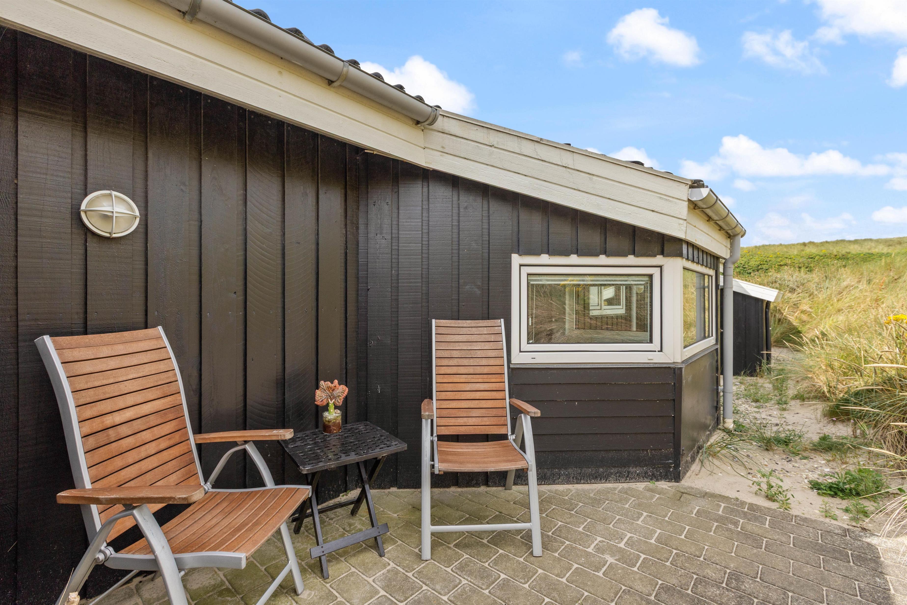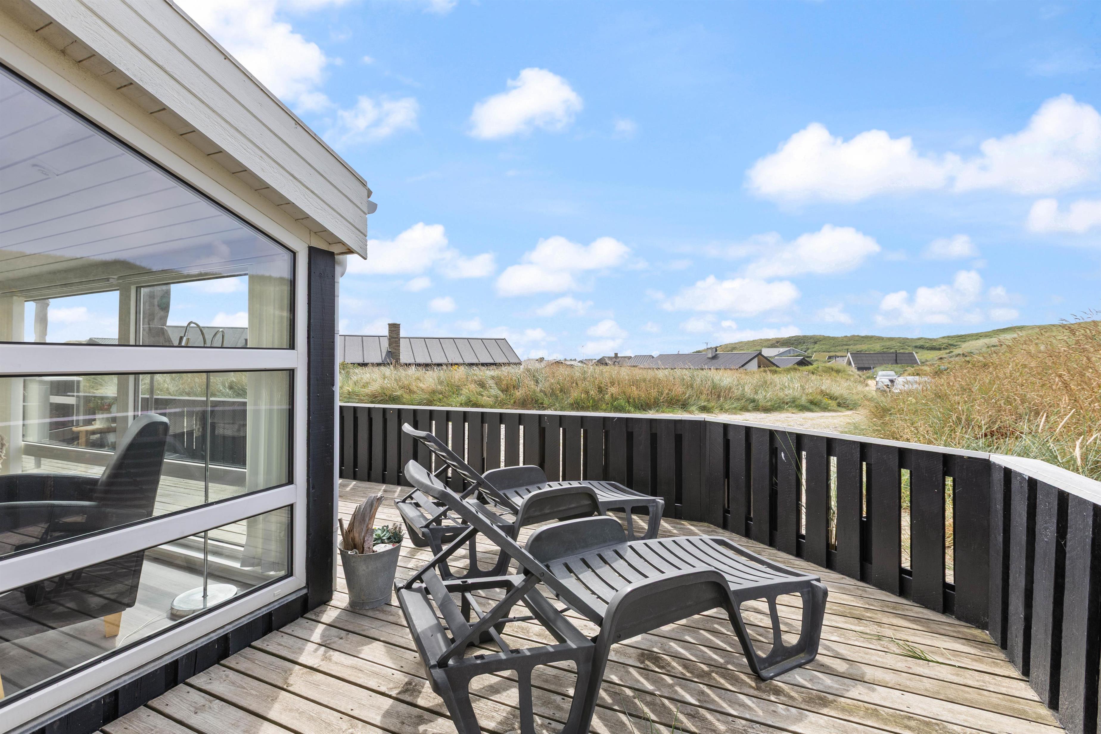 Feriehuset har en utrolig skøn, lukket og delvist overdækket terrasse mod syd og sydvest, som er anvendelig det meste af dagen. Her finder I naturligvis havemøbler, liggestole og en grill. Den skønne naturgrund er meget kuperet, og huset er placeret naturligt i læ af en klit.