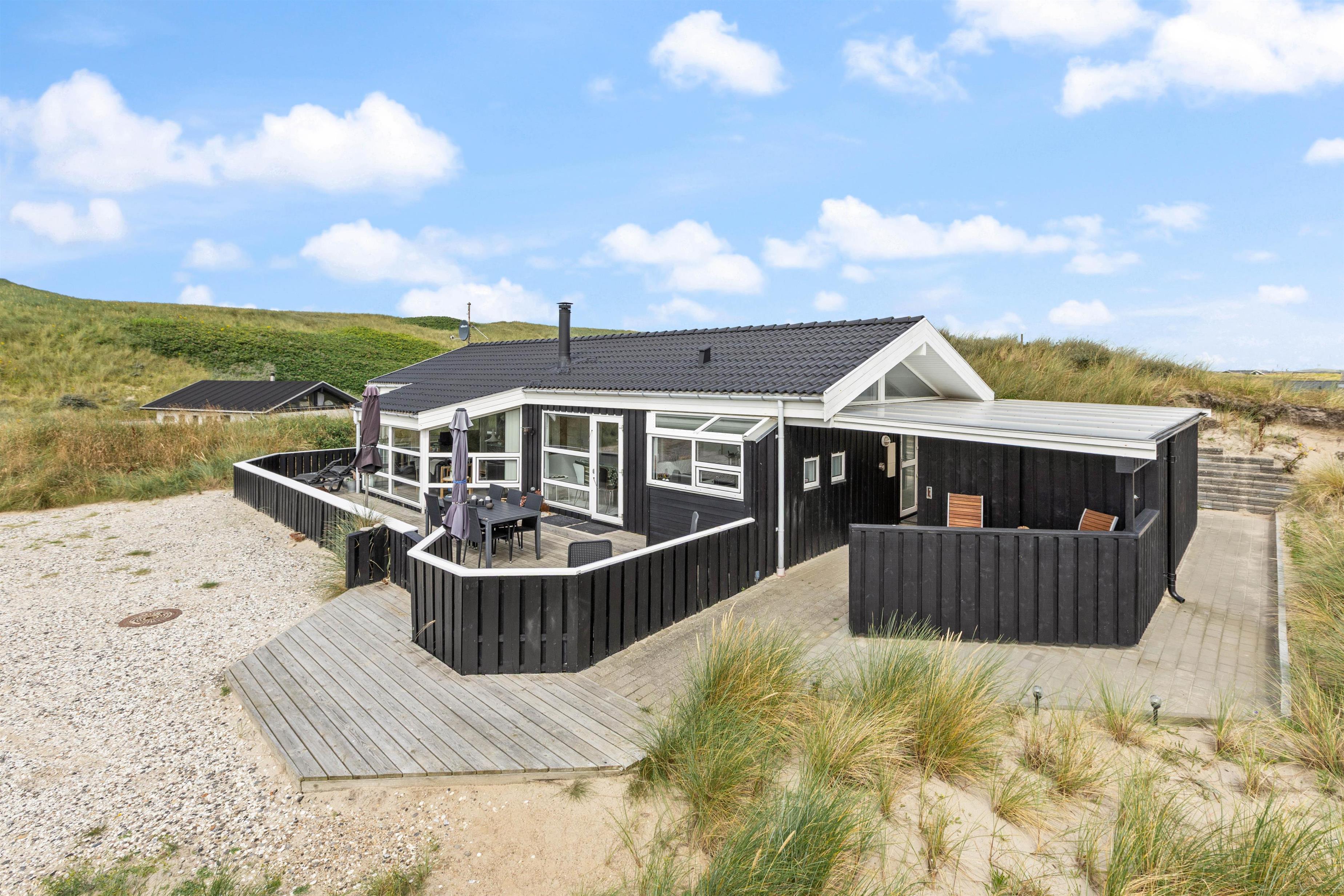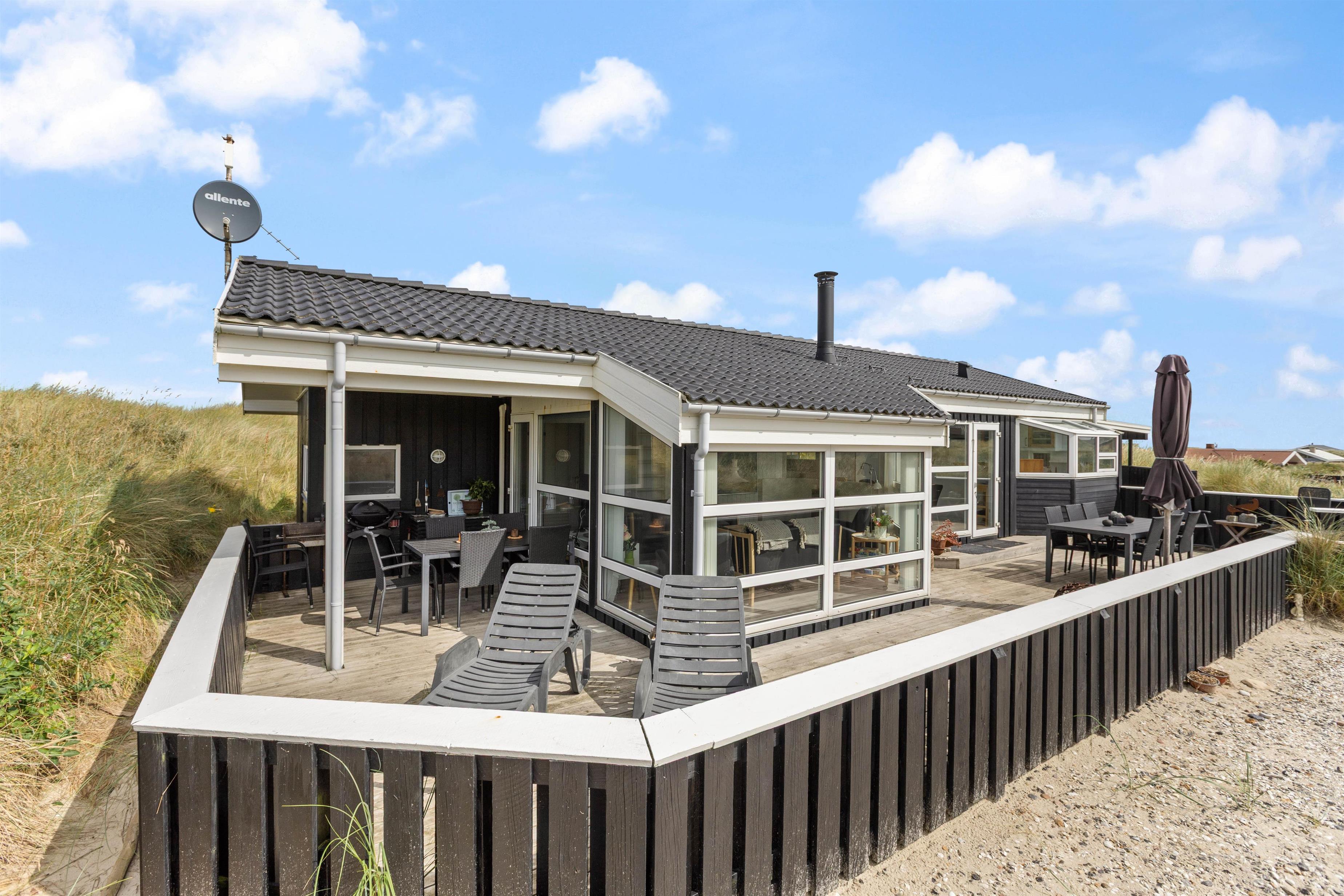 Utroligt dejligt sommerhus med førsteklasses beliggenhed på en dejlig, kuperet og ugeneret klitgrund kun 100 meter fra hav og strand. Sommerhuset er meget velindrettet og har både sauna og spa. Den skønne lukkede og overdækkede terrasse mod syd er perfekt for både børn, voksne og hunde. 2 hunde tilladt.
