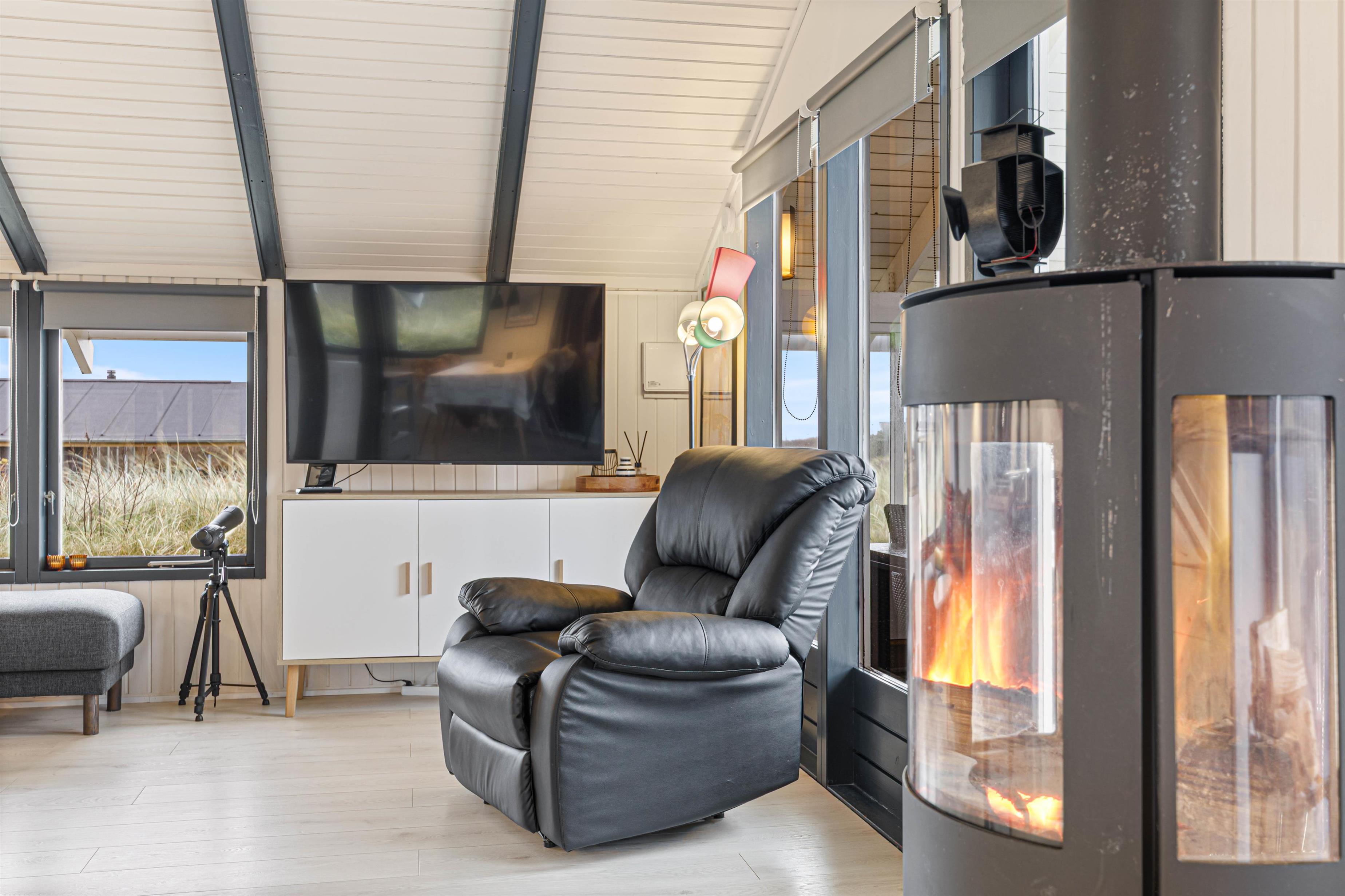 Udover brændeovnen, findes der en luft til luft-varmepumpe, som også bidrager til varmen i huset.