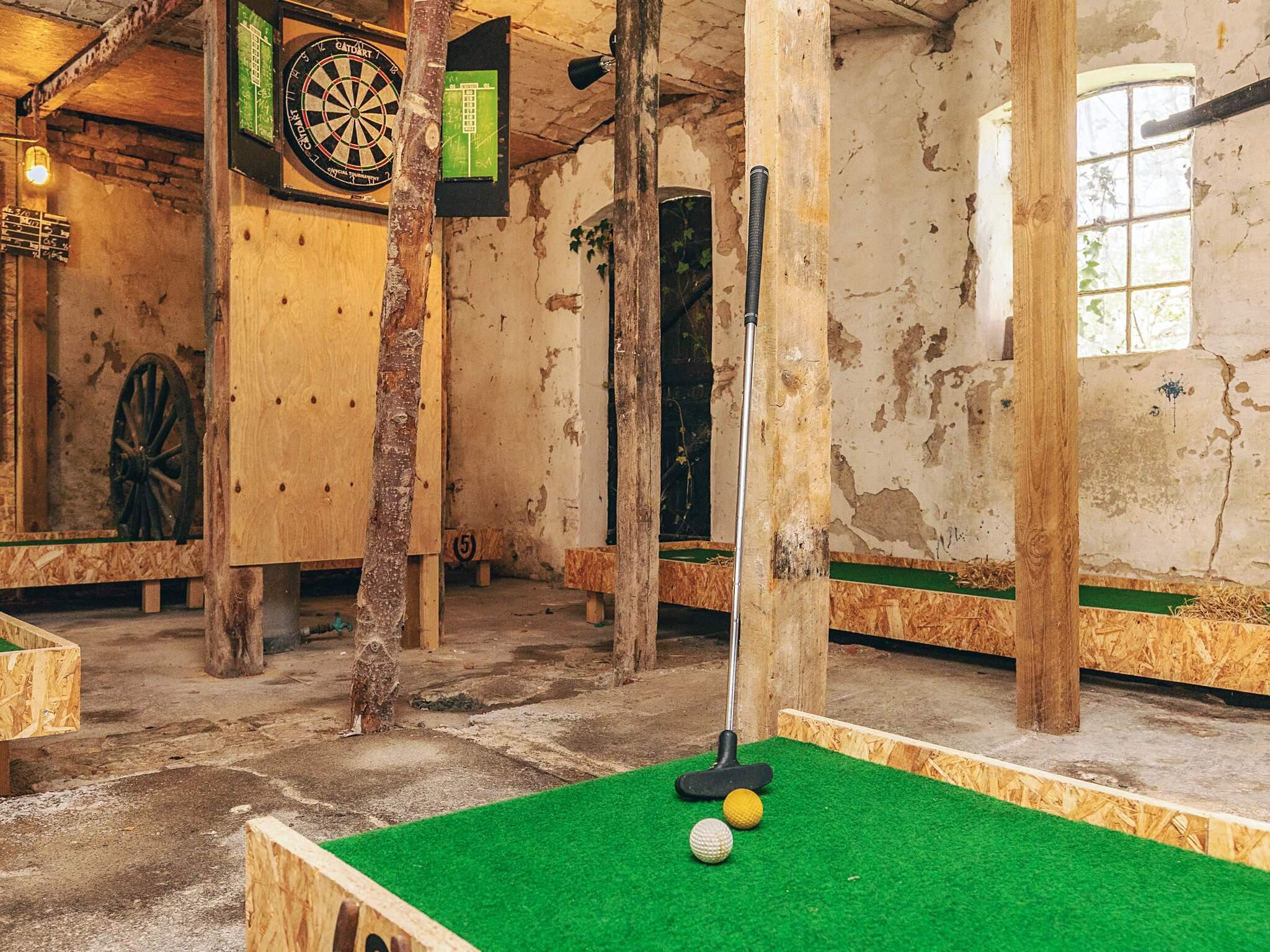 Ovenpå på hemsen finder gæsterne et stort soveværelse og et andet opholdsområde med udsigt over stuen nedenfor. For yderligere fritid er en tidligere stald blevet omdannet til en lille 9-hullers minigolfbane, hvilket giver sjov for alle aldre. Med sin blanding af indendørs komfort, udendørs plads og unikke faciliteter sikrer dette feriehus et afslappende og behageligt ophold. Udlejning er ikke tilladt til ungdomsgrupper, hvilket garanterer et fredeligt og familievenligt miljø under hele dit besøg.