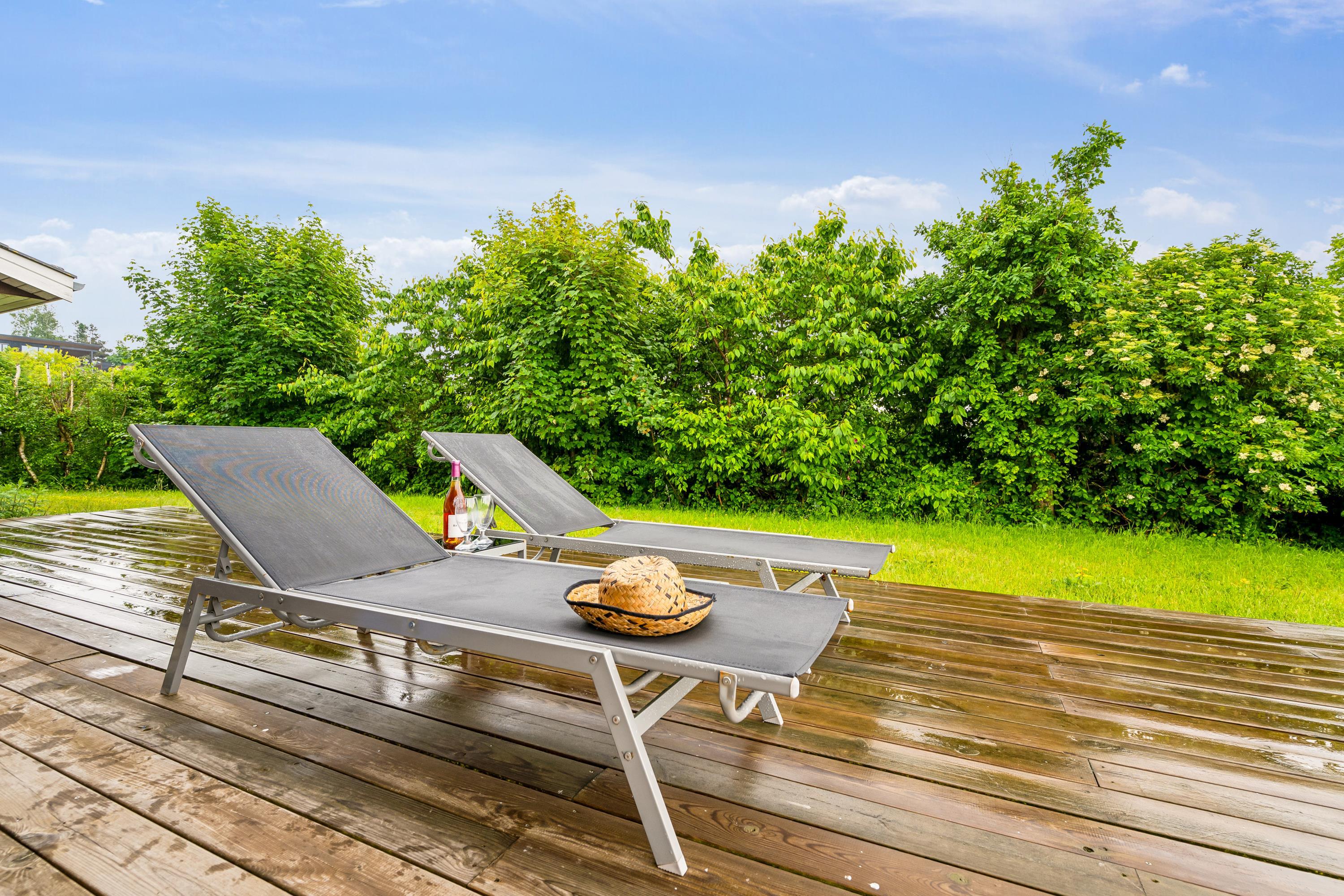 Dette rummelige og velindrettede feriehus med plads til 8 personer ligger på skrånende naturgrund med dejlig udsigt over Kattegat og landskabet ved Øer. Stor, vestvendt og delvist overdækket træterrasse med havemøbler, liggestole, parasol og grill.
