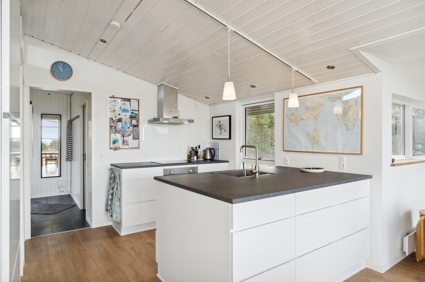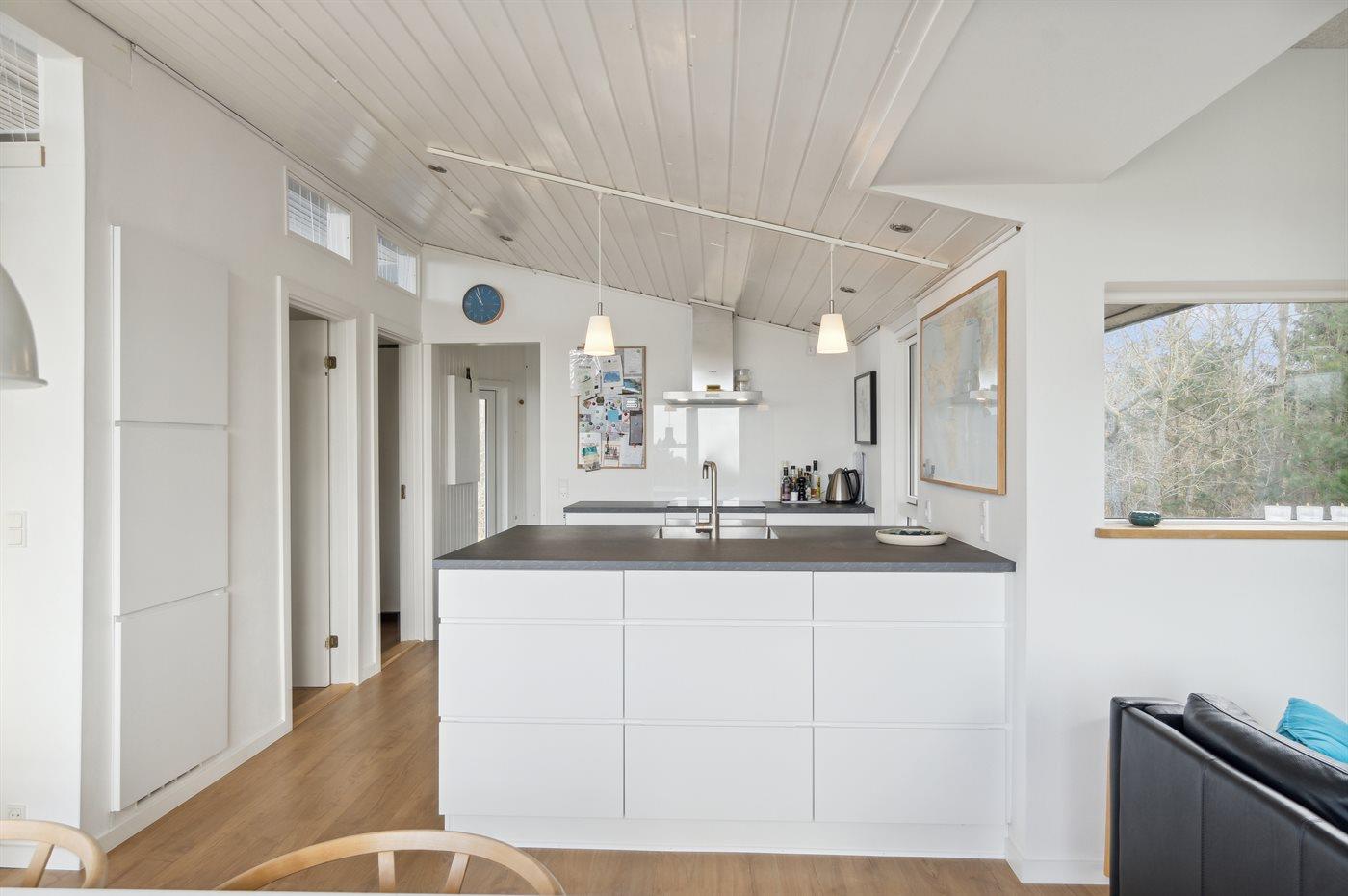 Sommerhuset er godt indrettet og med sine i alt 10 sovepladser passer det rigtig fint til f.eks. 2 familier. Husets hjerte er det meget flotte, store køkken/alrum og stue i ét, hvor den dejlige udsigt kan nydes over området og med havet i baggrunden. De store vinduespartier indrammer udsigten og lukker en masse lys ind.