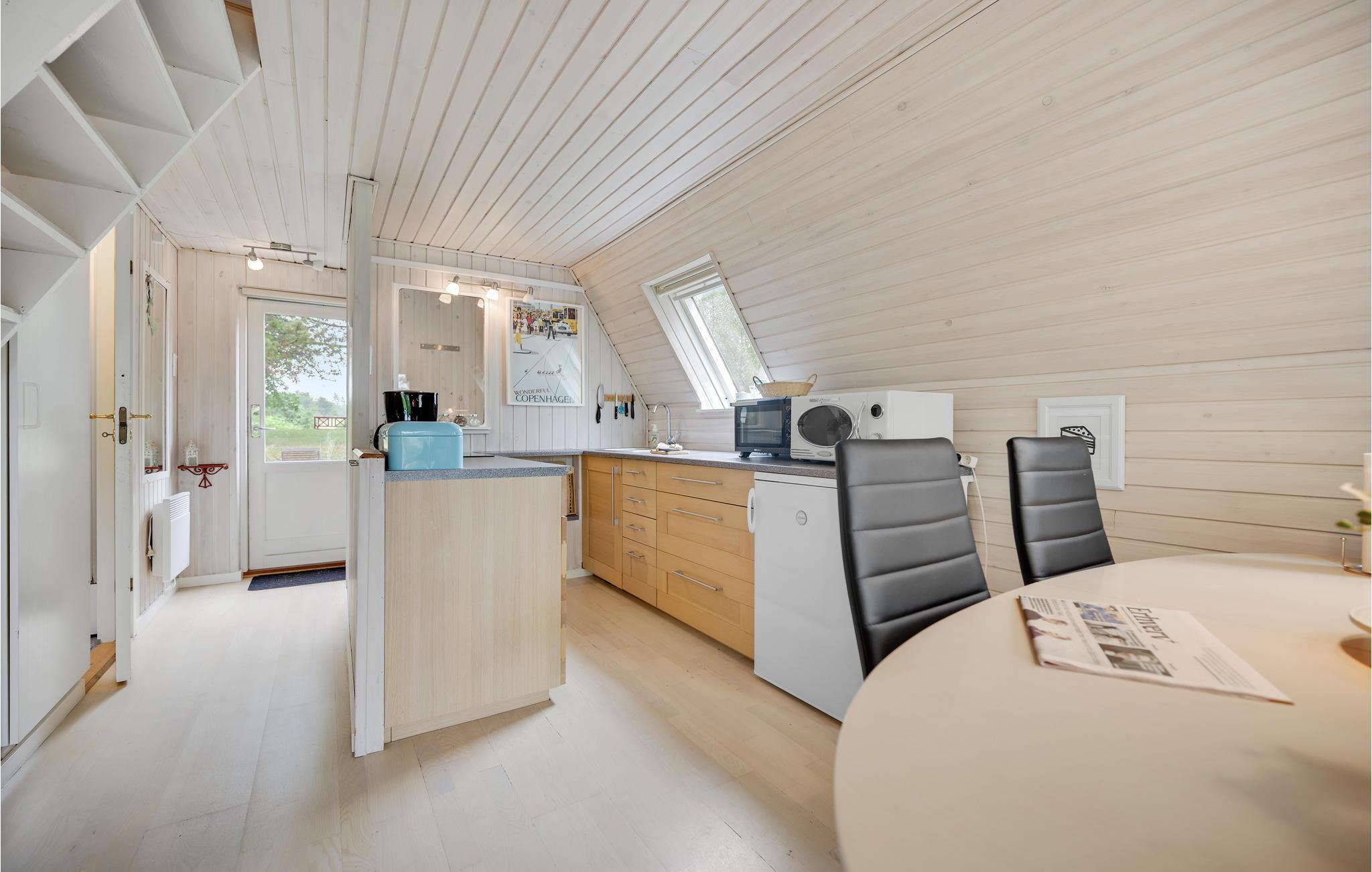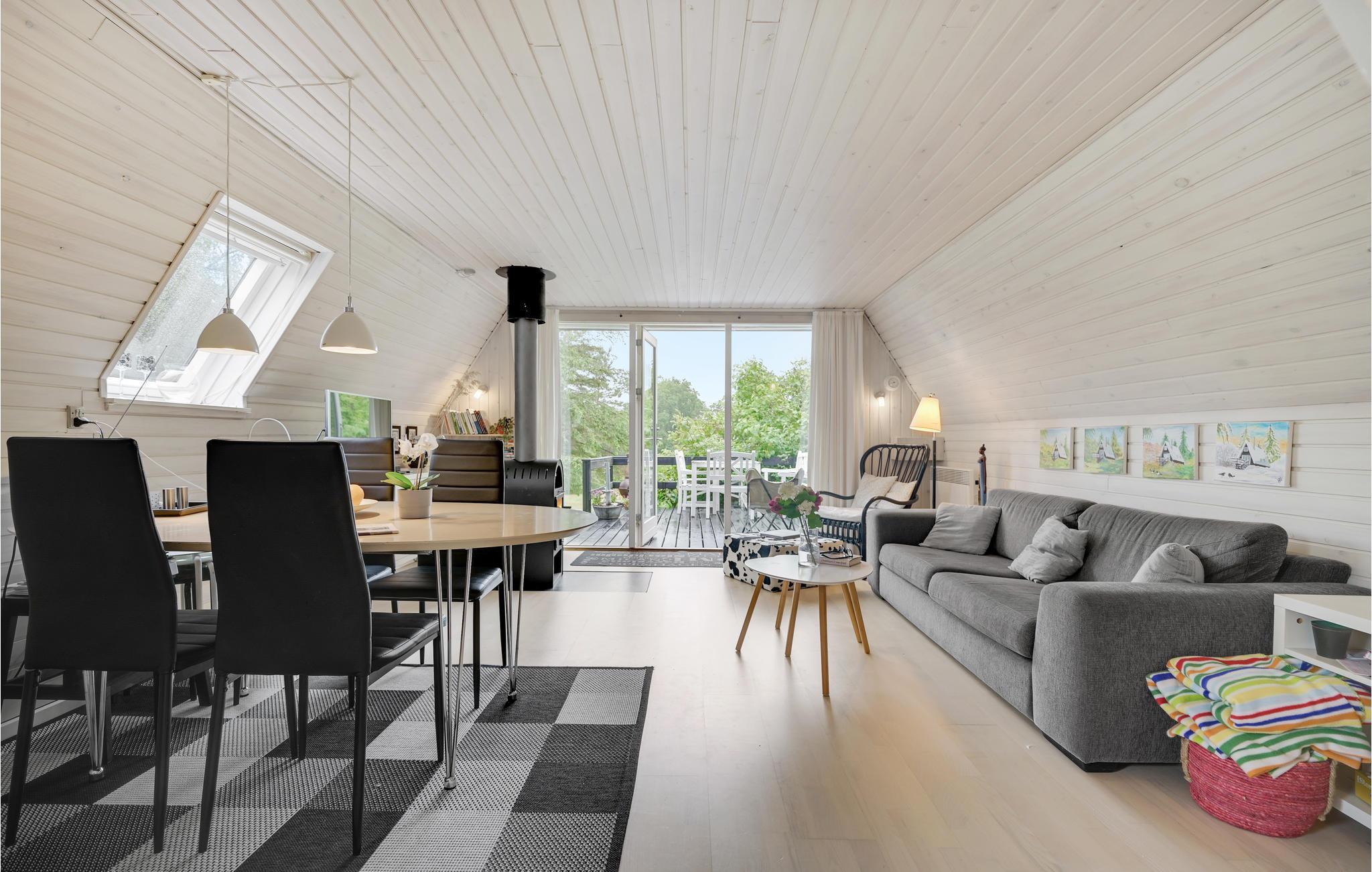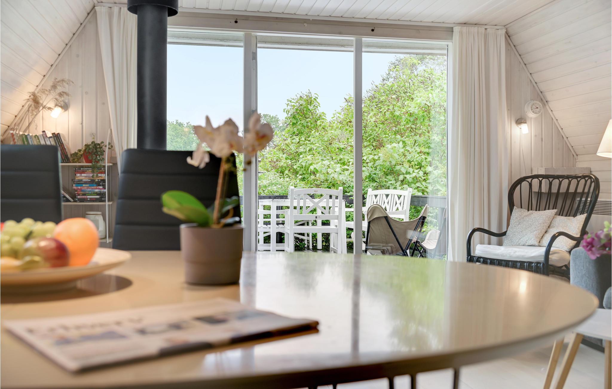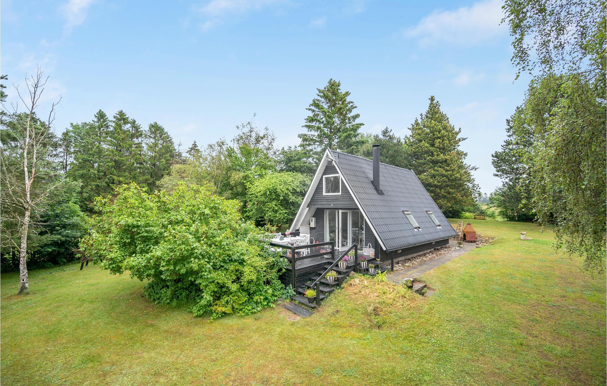 Lidt tilbagetrukket fra stranden og strandvejen ligger dette feriehus for enden af en stille sommerhusvej, så her er ro og fred. Huset er renoveret hele vejen rundt og fremstår i dag lyst og venligt at komme til og med en pæn møblering. Sovepladserne er på 1. sal, fordelt i to soveværelser. Fra stuen er der udgang til en god træterrasse. Med kun 5 -10 minutters kørsel til Ebeltoft by er det nemt at komme ind og opleve atmosfæren i de små hyggelige gader. Det er også muligt at cykle til Ebeltoft på den anlagte sti. Der kan ligeledes overnattes i det flotte shelter, der har en flot udsigt over markerne bag ved sommerhuset.