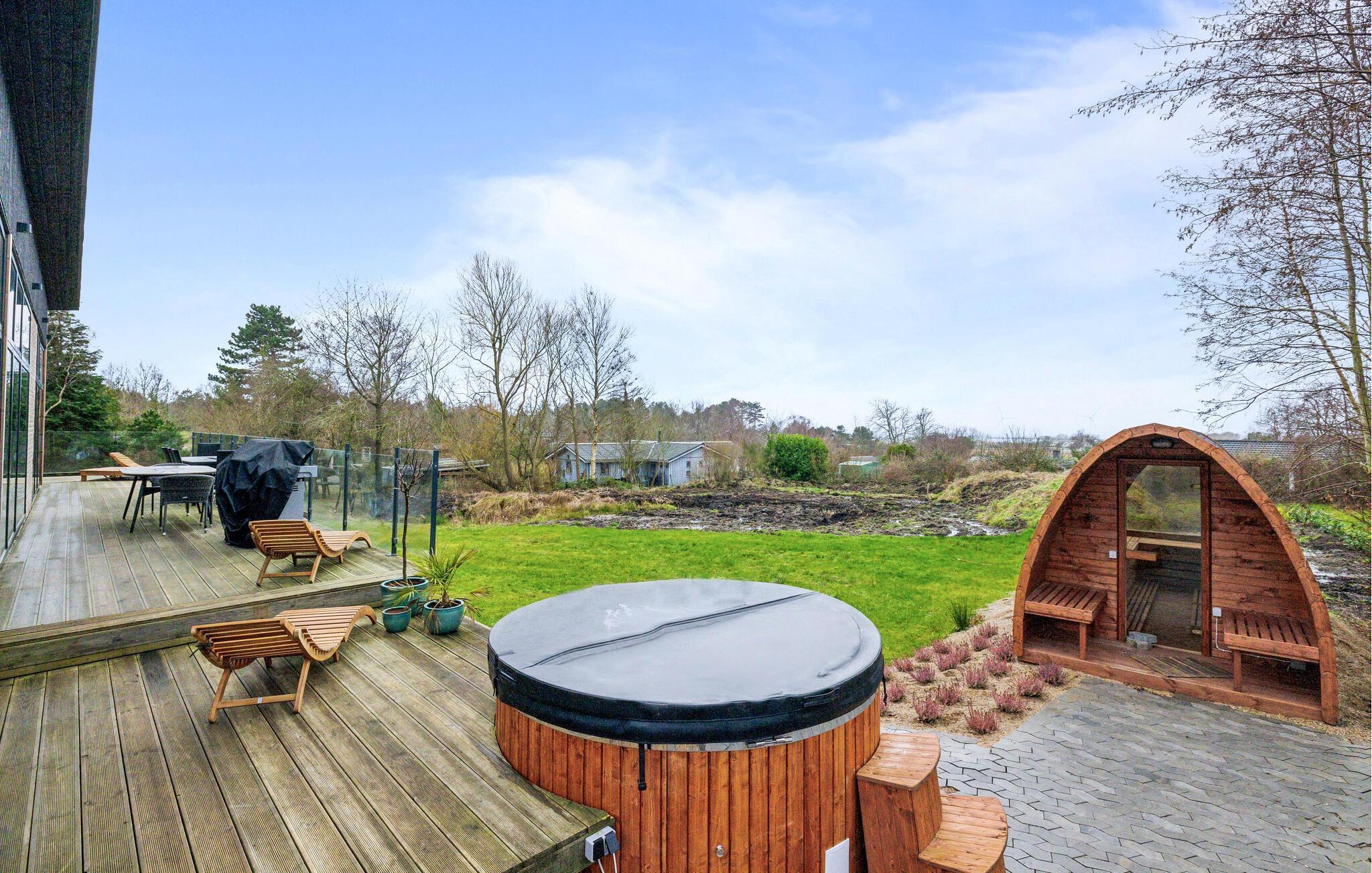 Rummeligt luksushus med havudsigt, indendørs pool og wellness på Øer Strand, perfekt til familieferie på Djursland.