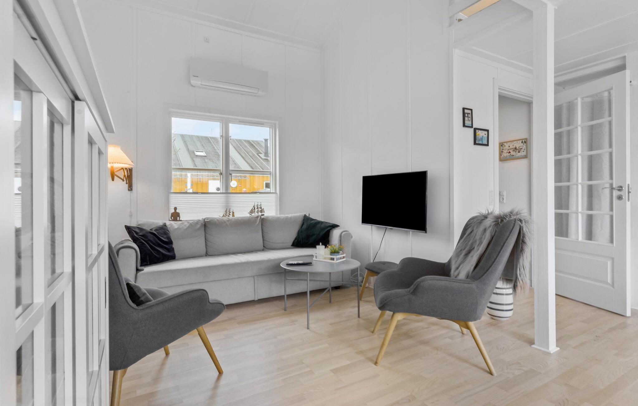 Hyggeligt feriehus ved Øer Strand med panoramaudsigt over havnen og moderne indretning.