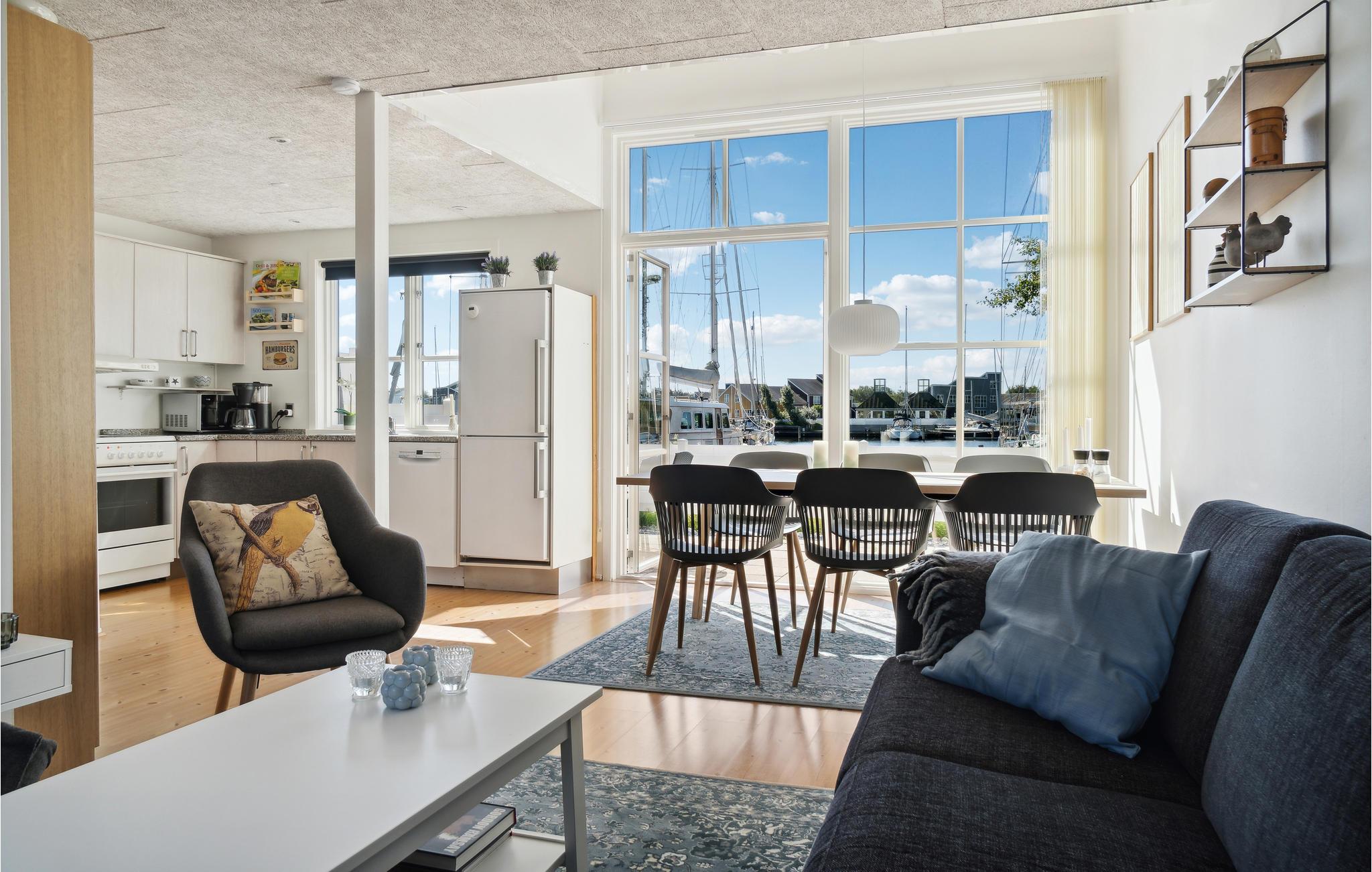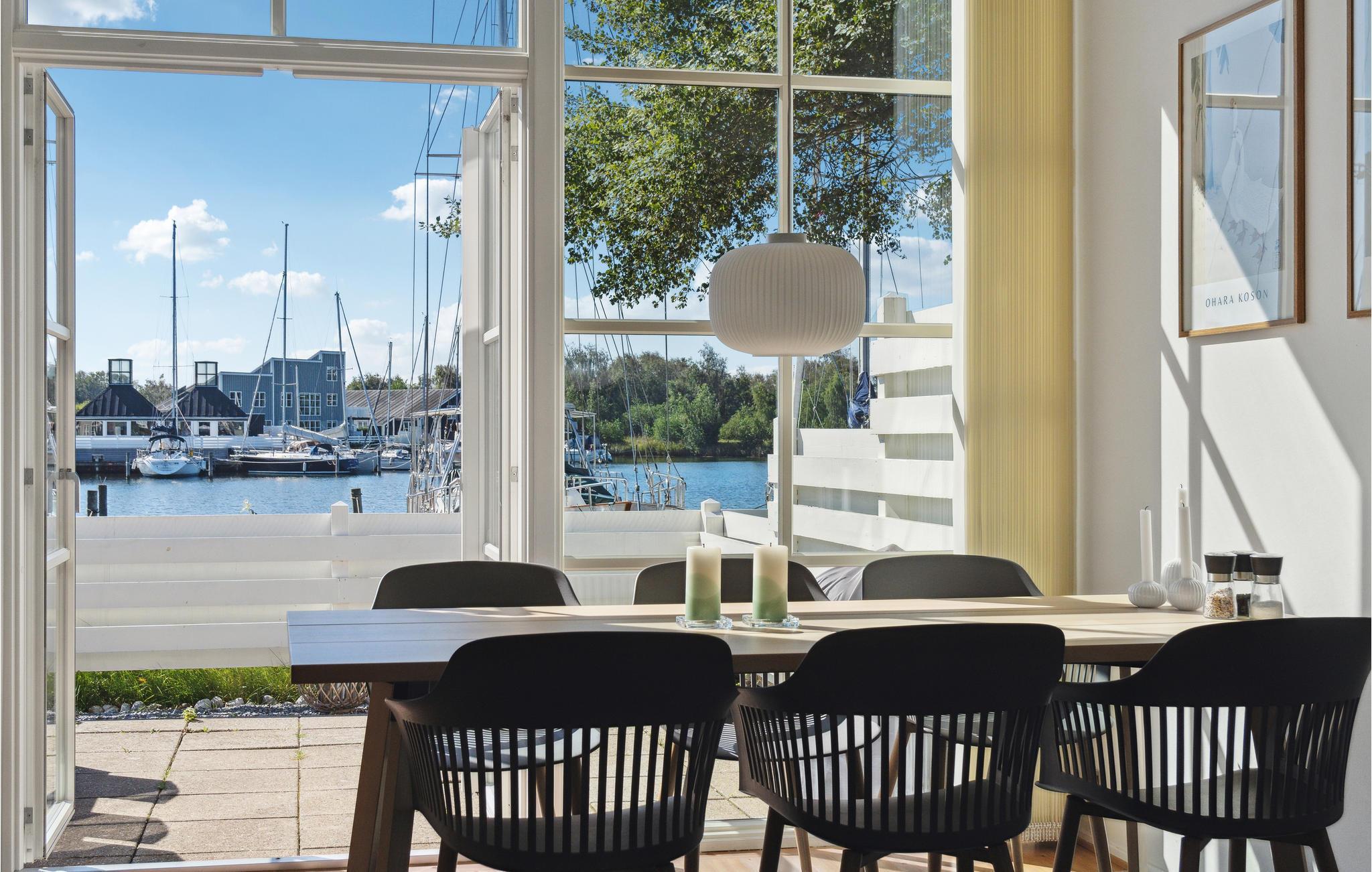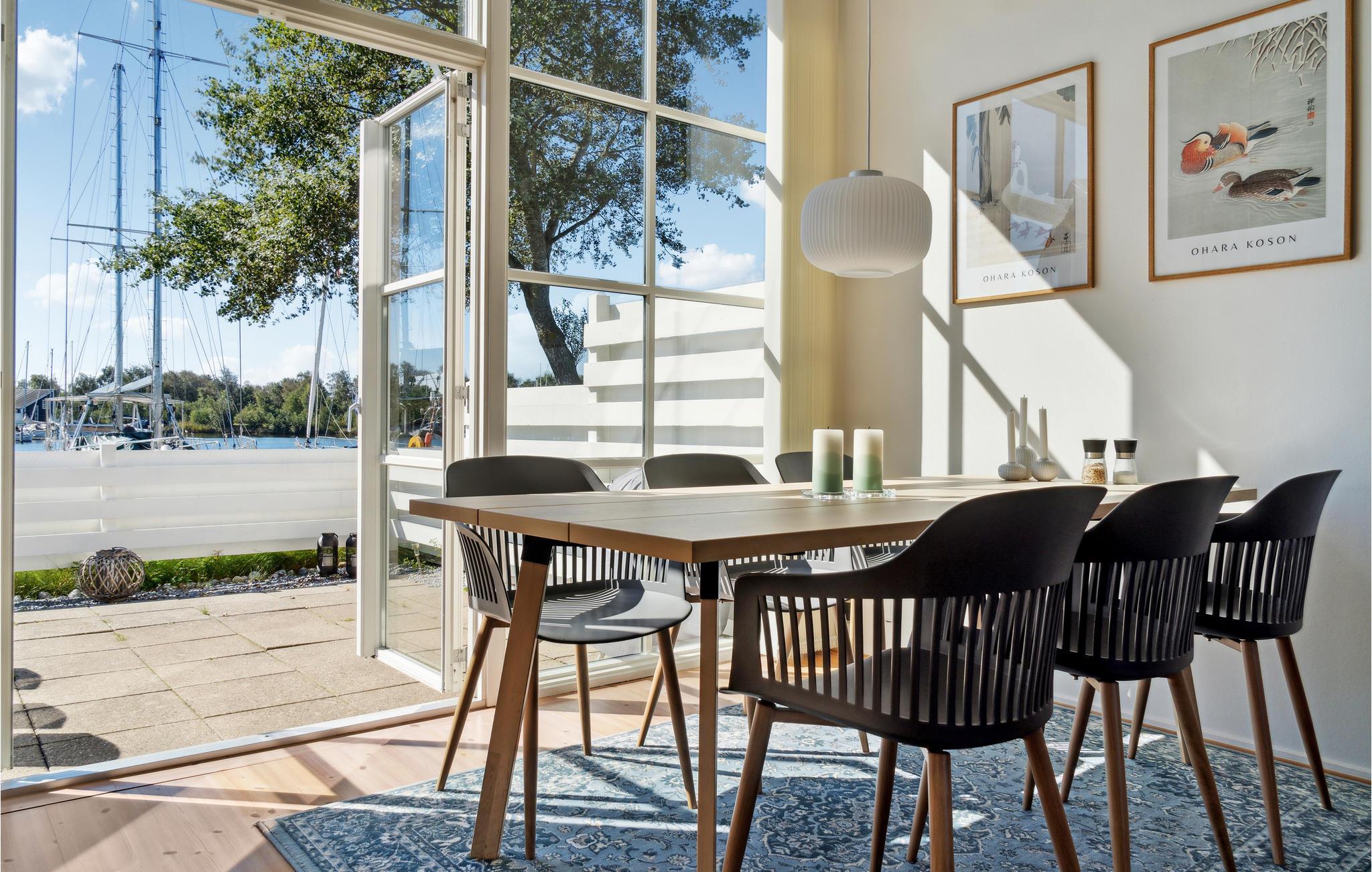 Det store spisebord bliver midtpunkt for feriens hyggelige måltider og lange spilaftener. Udendørs venter der en lille, lun terrasse, som har fantastisk udsigt til det helt specielle område, naturen og lystbådehavnen.