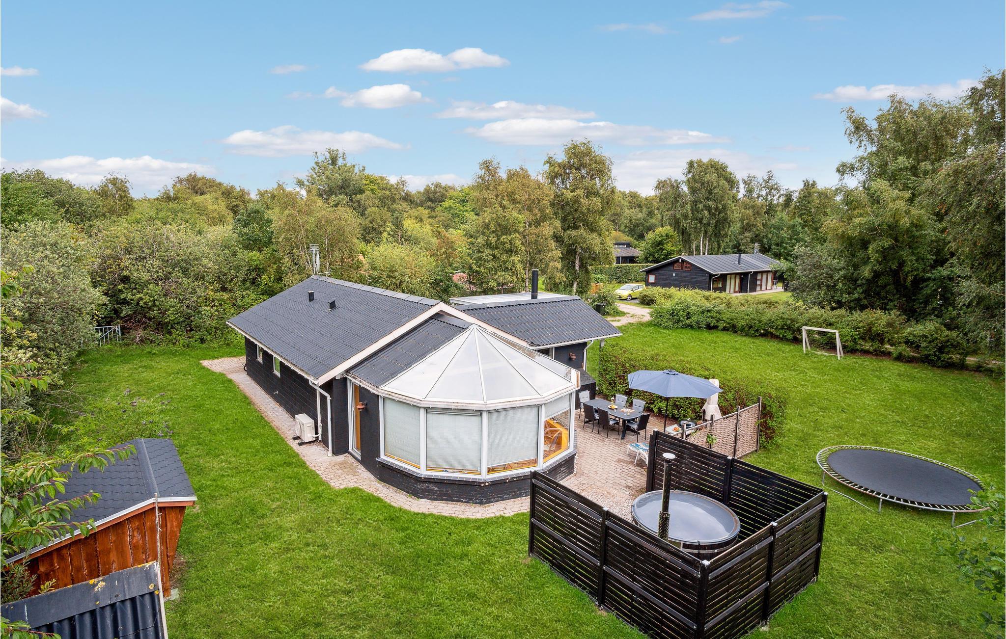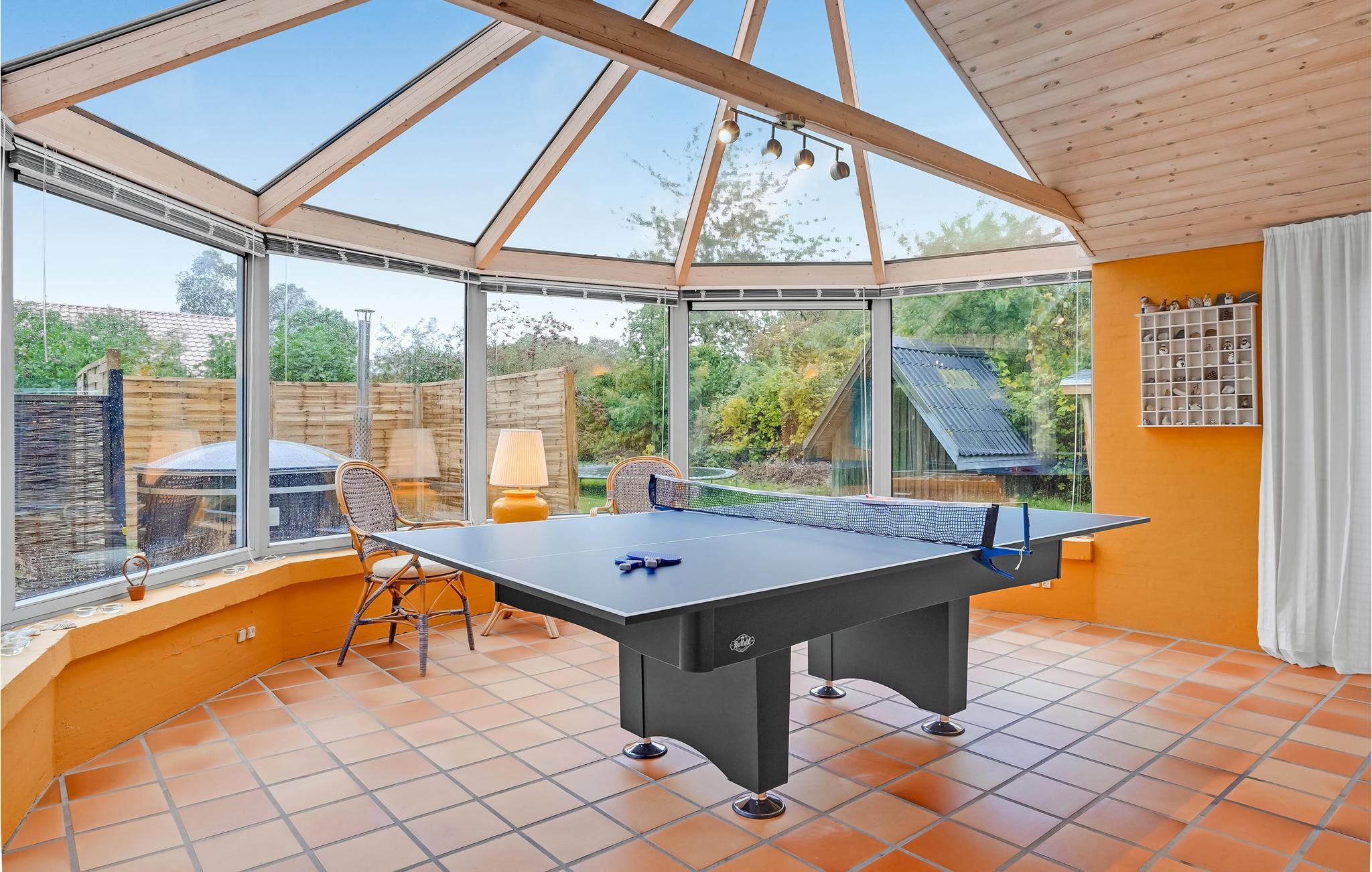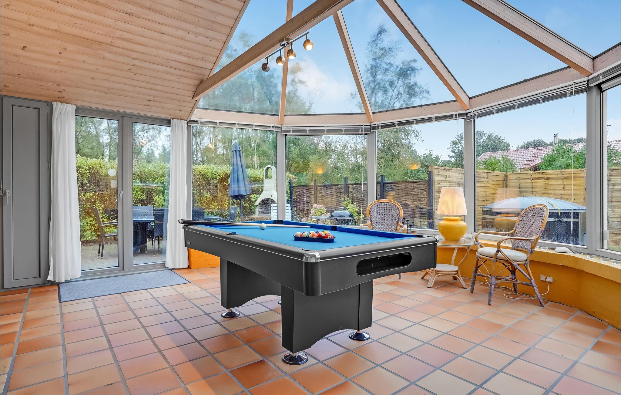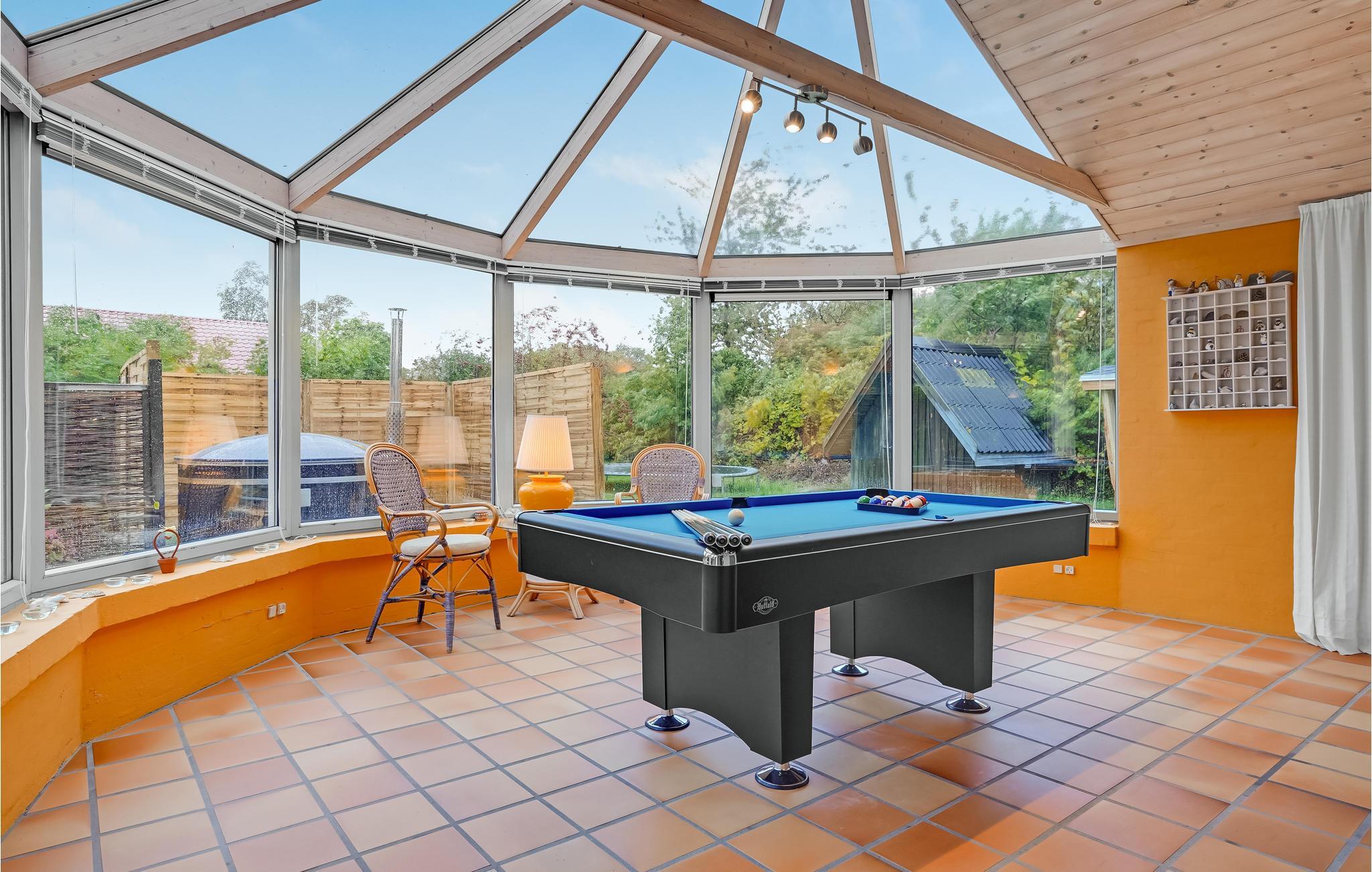 Udestuen er husets omdrejningspunkt, for her er der et dejligt lys året rundt, lige som I kan dyste ved poolbordet. På husets grund er der masser af plads til leg og boldspil, og hvis I trænger til at slappe af, kan I sætte jer i vildmarksbadet.