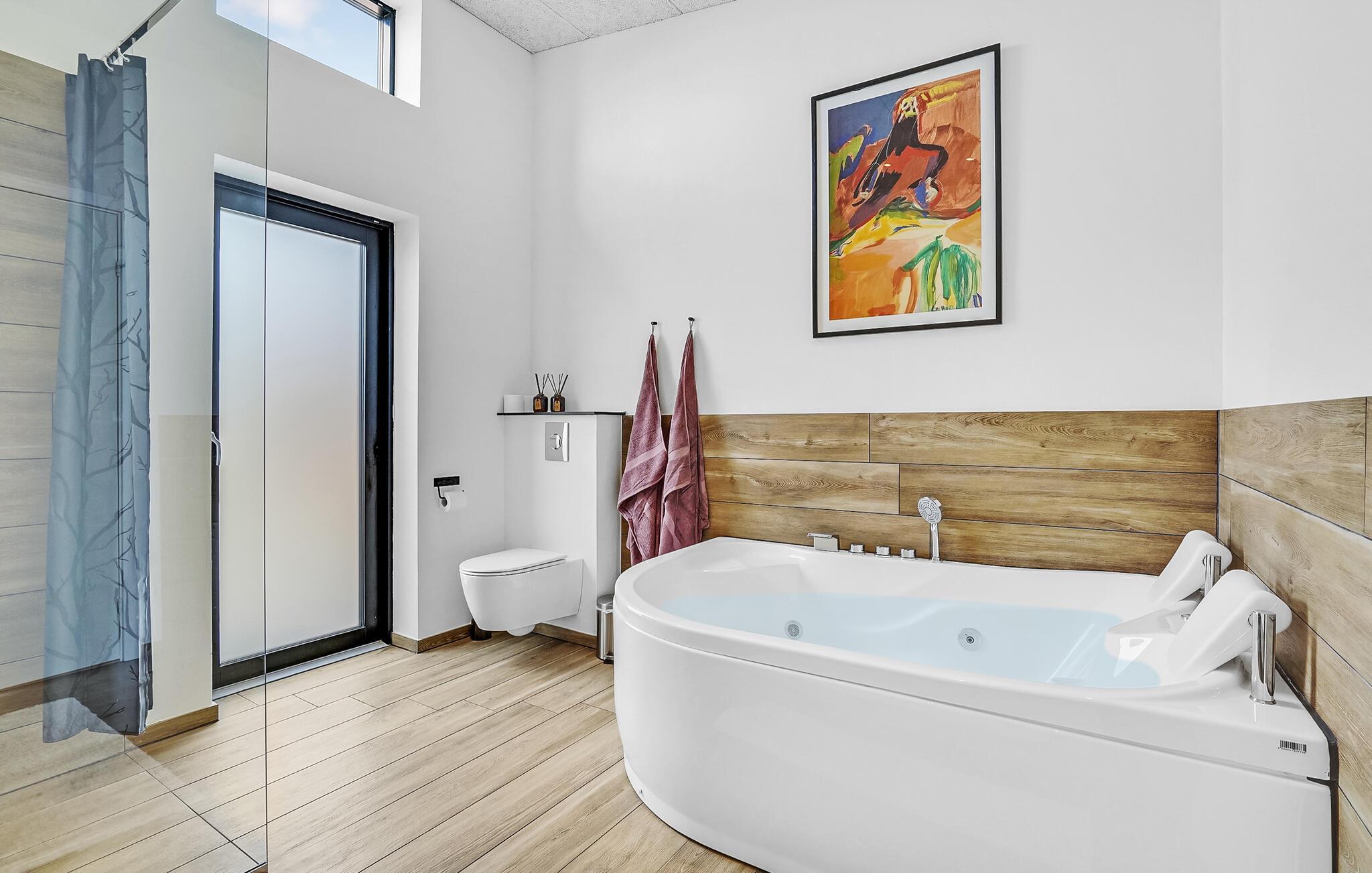 I kan godt begynde at glæde jer til dette yderst velindrettede og komfortable sommerhus, som har højt til loftet og velvalgte finesser i alle rum. Det lækre opholdsrum bliver det naturlige sted at samles, for her kan I både sammensætte alle menuerne, give jer god tid ved spisebordet og flade ud foran fjernsynet. Huset er indrettet med fem soveværelser og to badeværelser, hvor I også kan læne jer tilbage i spabadet eller få varmen i saunaen.