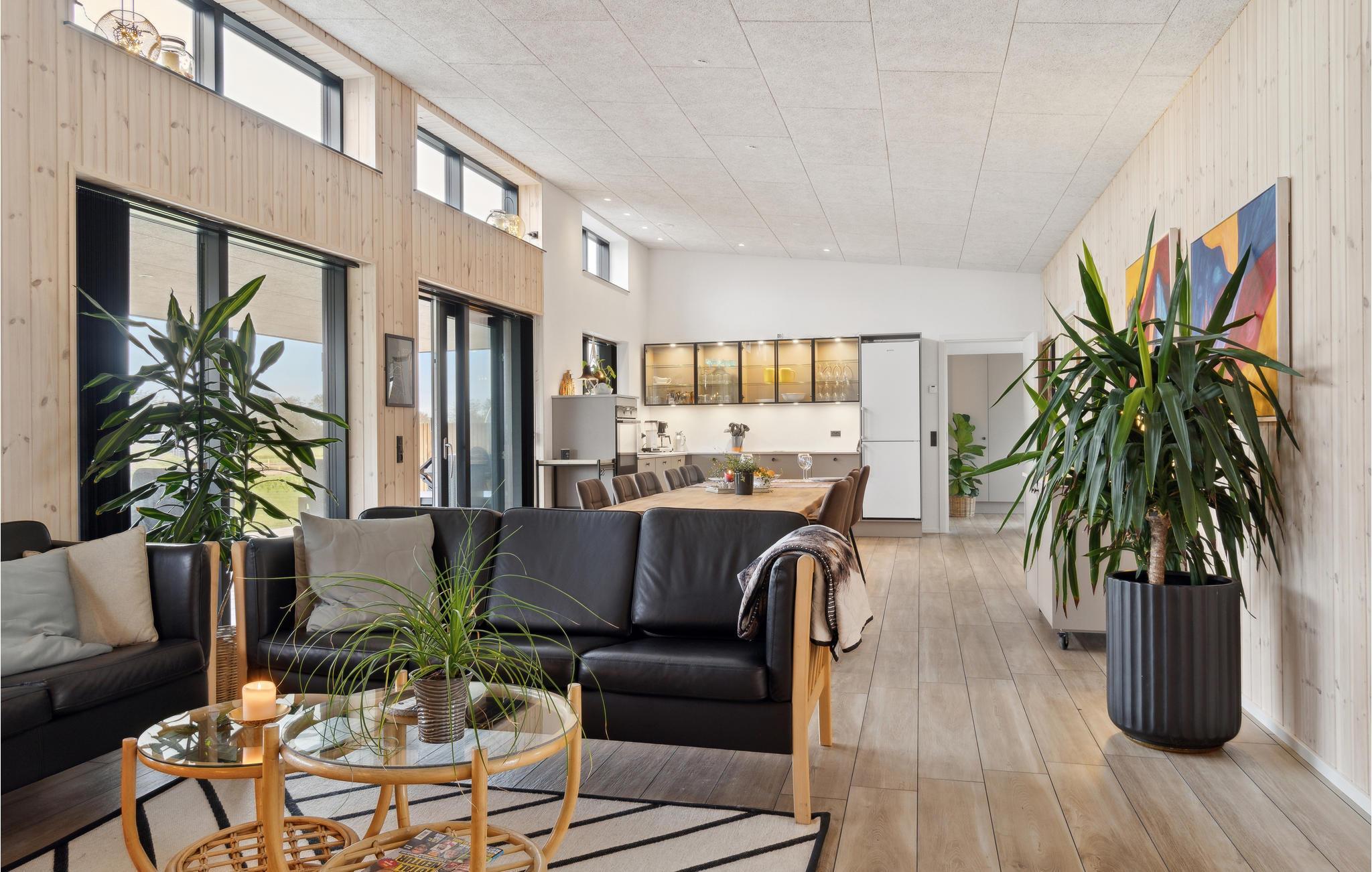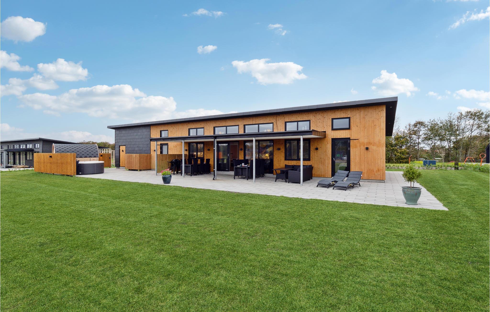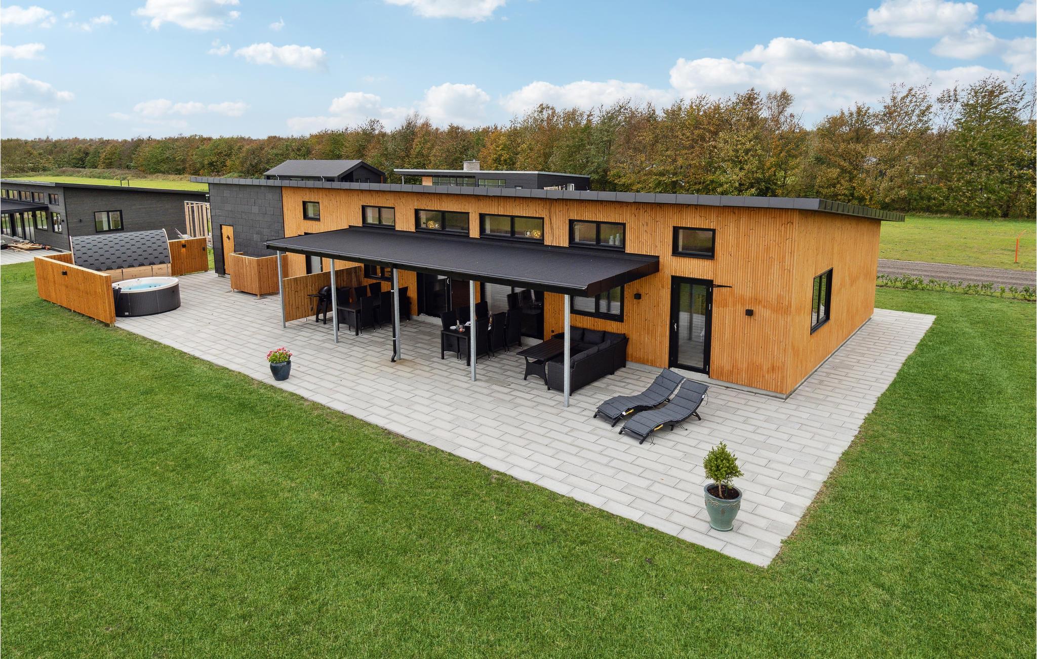 Ønsker I en afslappende familieferie i et feriehus med ekstra høj komfort og smagfuldt, gennemført design? Så er I havnet det rette sted. Her venter en dejlig tid med jeres store familie eller flere venner, og I vil sikkert ikke have lyst til at tage hjem! Den store stue kombinerer på smart vis madlavning, spisning, leg og hygge og nyder masser af dagslys gennem de store og talrige vinduespartier. Indtag sammen en lækker morgenmad og friskbrygget kaffe på den overdækkede terrasse. Terrassen strækker sig rundt om huset og giver jer masser af plads til hyggeligt samvær, leg og spas samt ren afslapning. Mens jeres børn leger i haven eller udforsker den nærliggende legeplads, kan I slappe af i spabadet eller tøndesaunaen og lægge jeres hektiske hverdag bag jer.