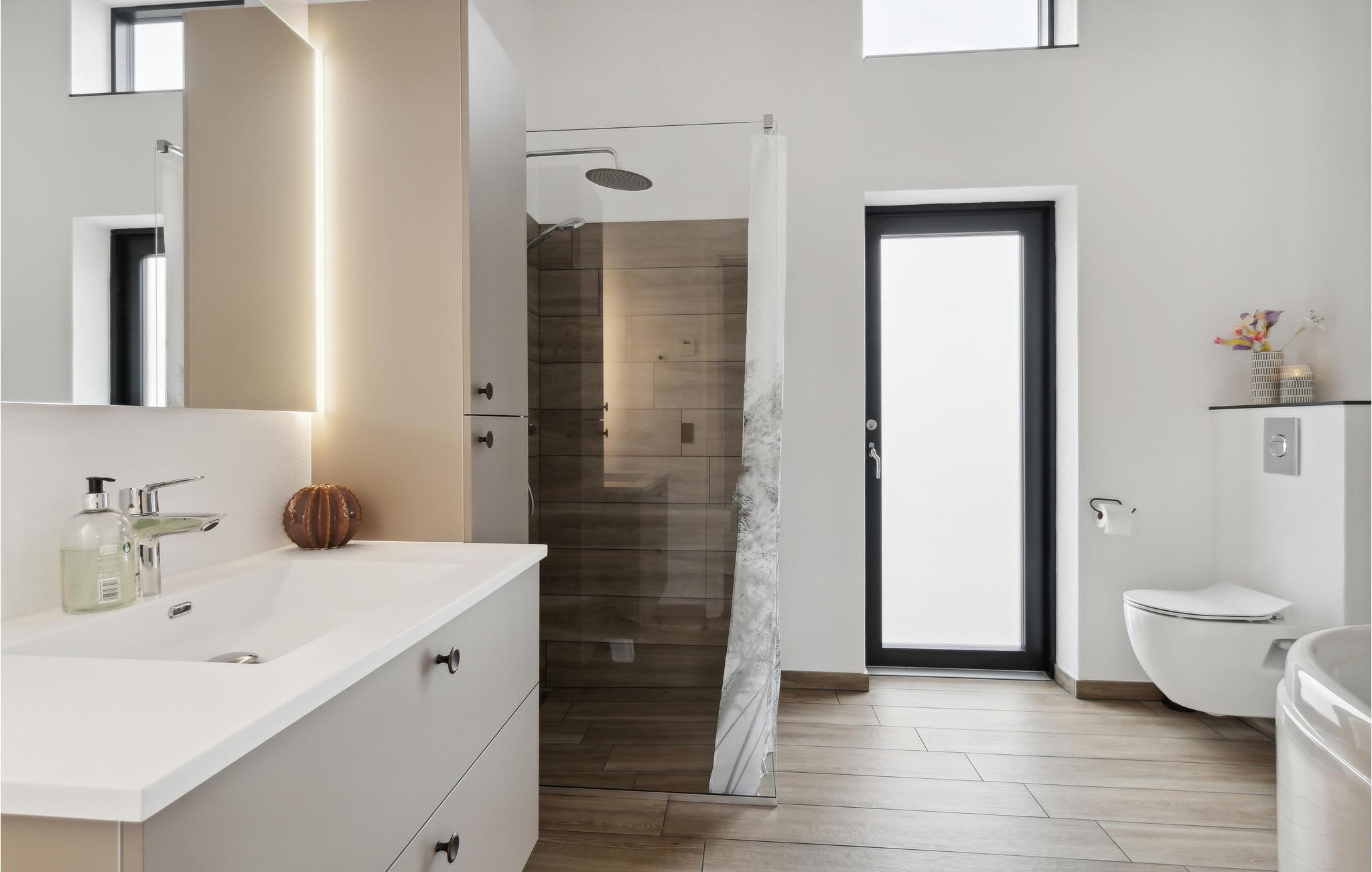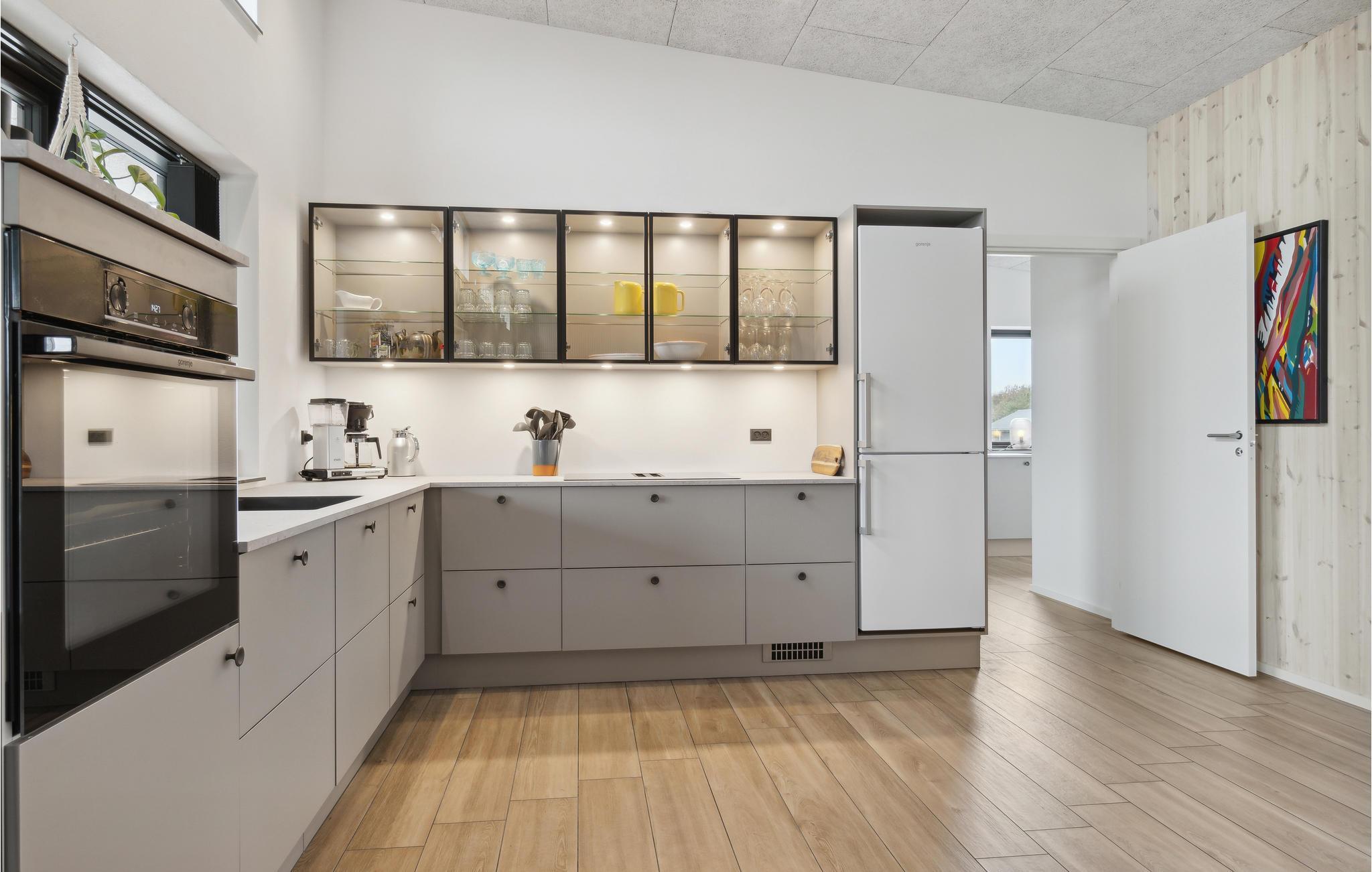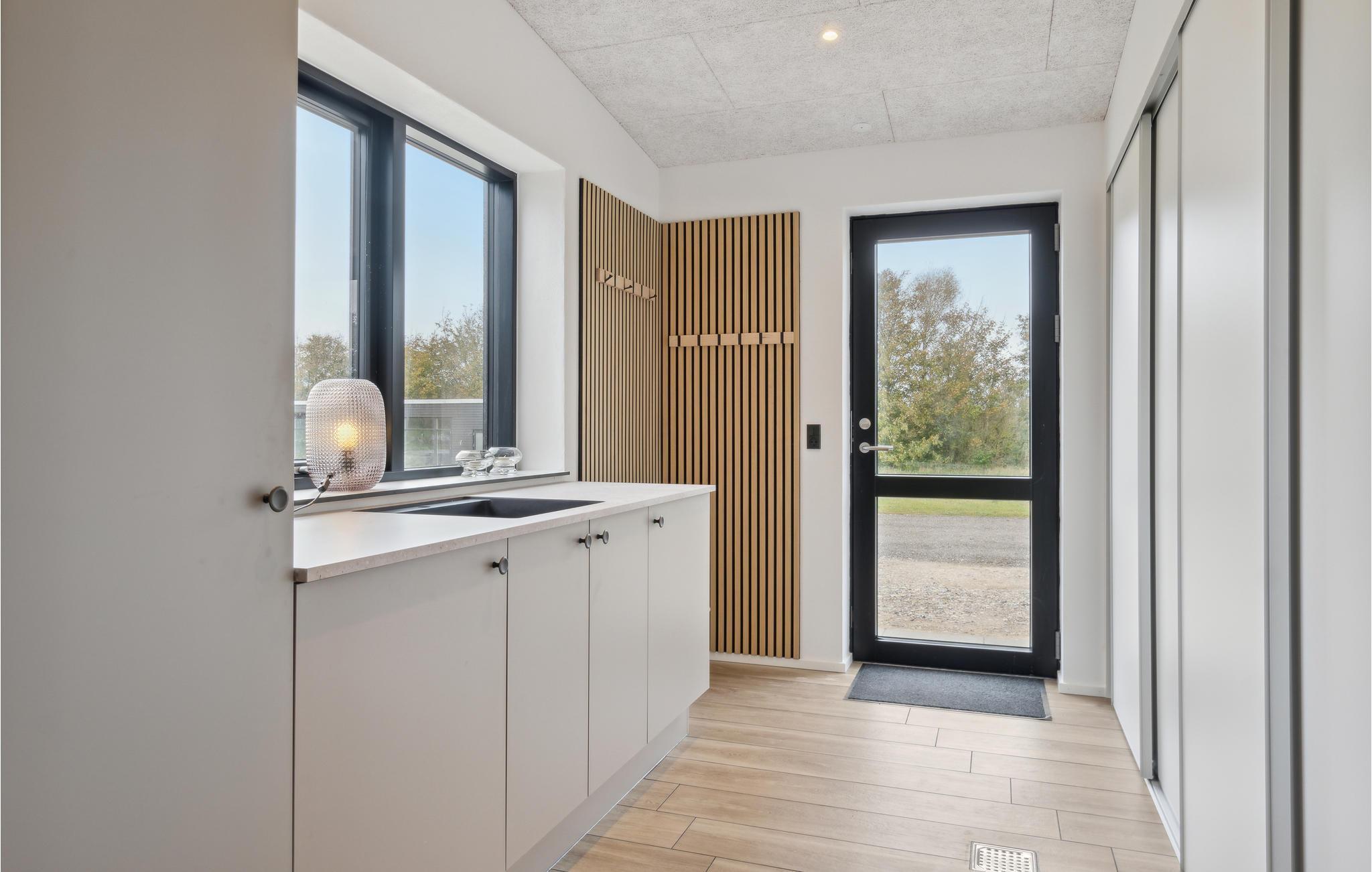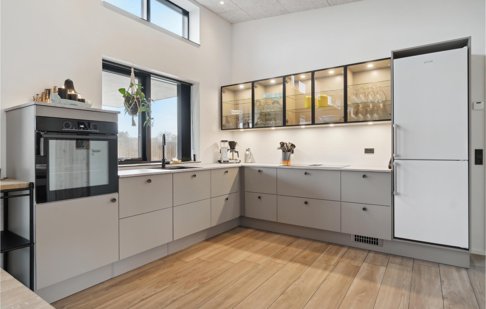 Ønsker I en afslappende familieferie i et feriehus med ekstra høj komfort og smagfuldt, gennemført design? Så er I havnet det rette sted. Her venter en dejlig tid med jeres store familie eller flere venner, og I vil sikkert ikke have lyst til at tage hjem! Den store stue kombinerer på smart vis madlavning, spisning, leg og hygge og nyder masser af dagslys gennem de store og talrige vinduespartier. Indtag sammen en lækker morgenmad og friskbrygget kaffe på den overdækkede terrasse. Terrassen strækker sig rundt om huset og giver jer masser af plads til hyggeligt samvær, leg og spas samt ren afslapning. Mens jeres børn leger i haven eller udforsker den nærliggende legeplads, kan I slappe af i spabadet eller tøndesaunaen og lægge jeres hektiske hverdag bag jer.