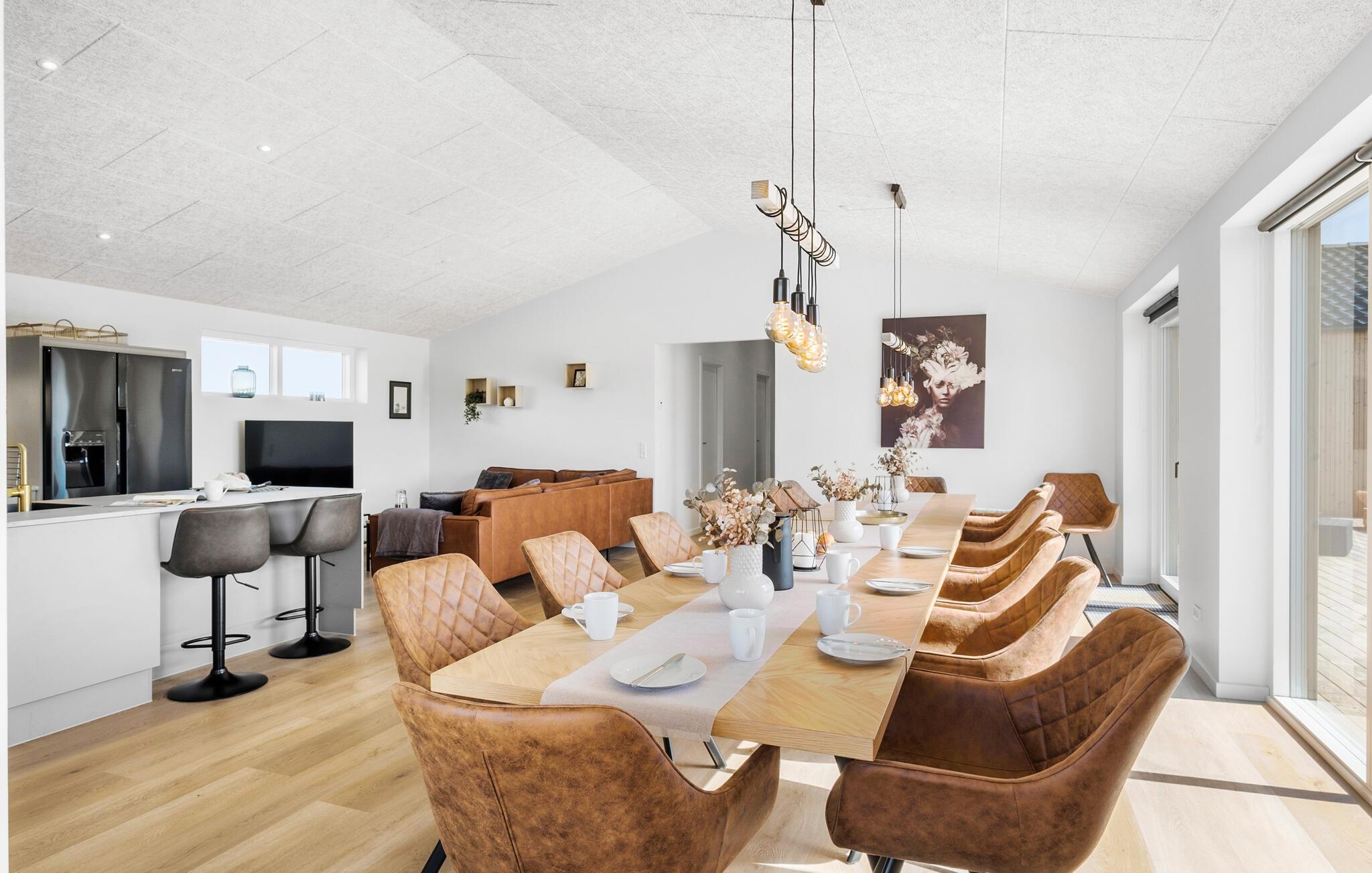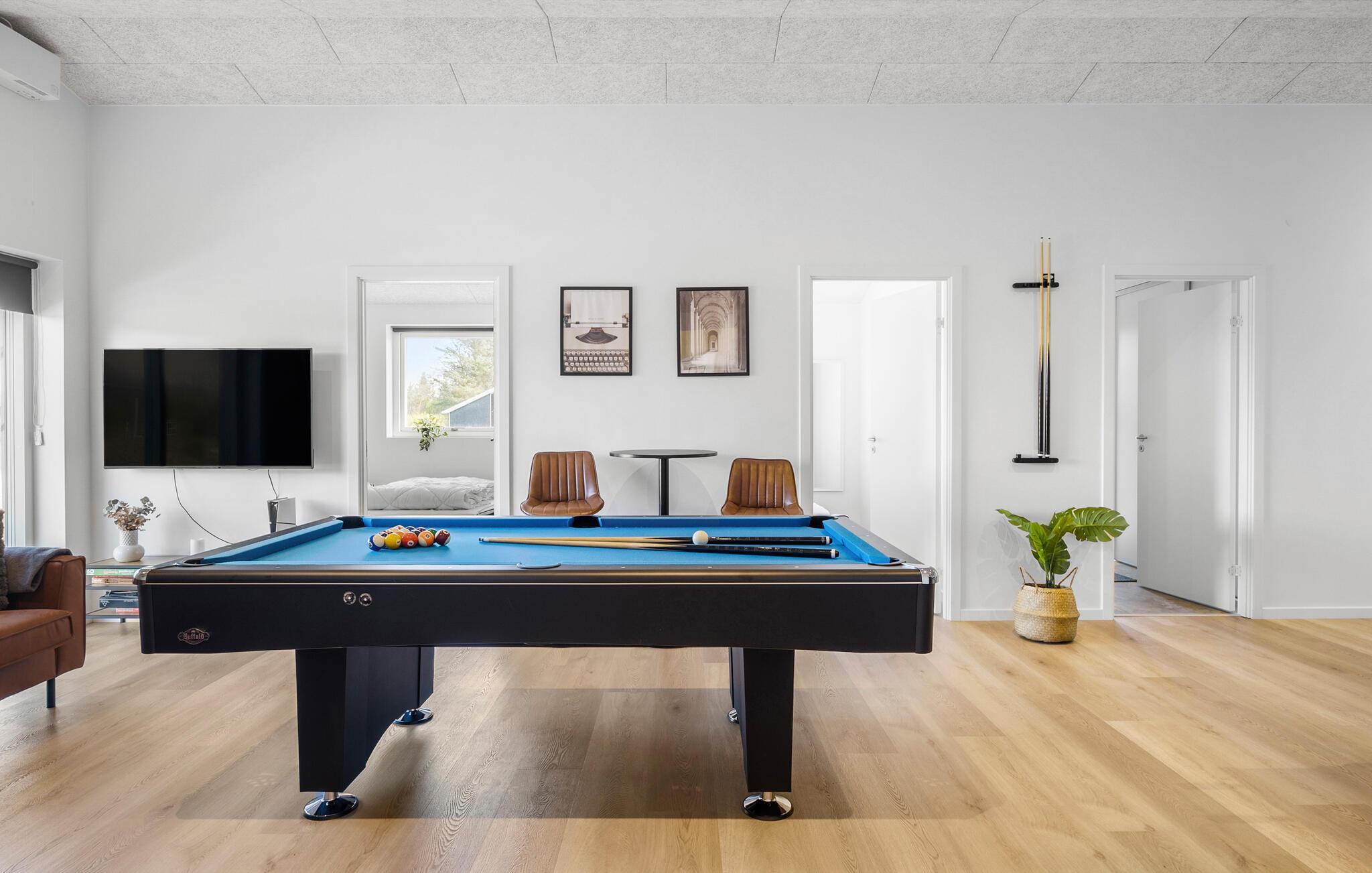 Velkommen til dette vidunderlige hus, hvor I får den perfekte base til årets store sammenkomst med hele familien på tværs af generationerne. Indretningen fremtræder flot og stilrent over hele linjen med dé faciliteter, I behøver for at kunne tilberede nogle lækre måltider og nyde dem ved det lange spisebord med plads til alle. Ingen kommer til at kede sig her, ej heller på en gråvejrsdag. Børnene kan plaske rundt i den indendørs pool, mens andre duellerer i et spil dart, pool eller bordfodbold. Og måske I skal runde dagen af med en tur i spabadet eller tøndesaunaen?