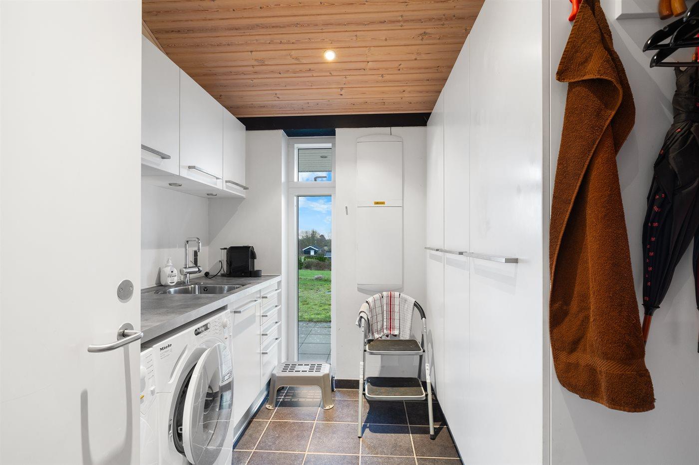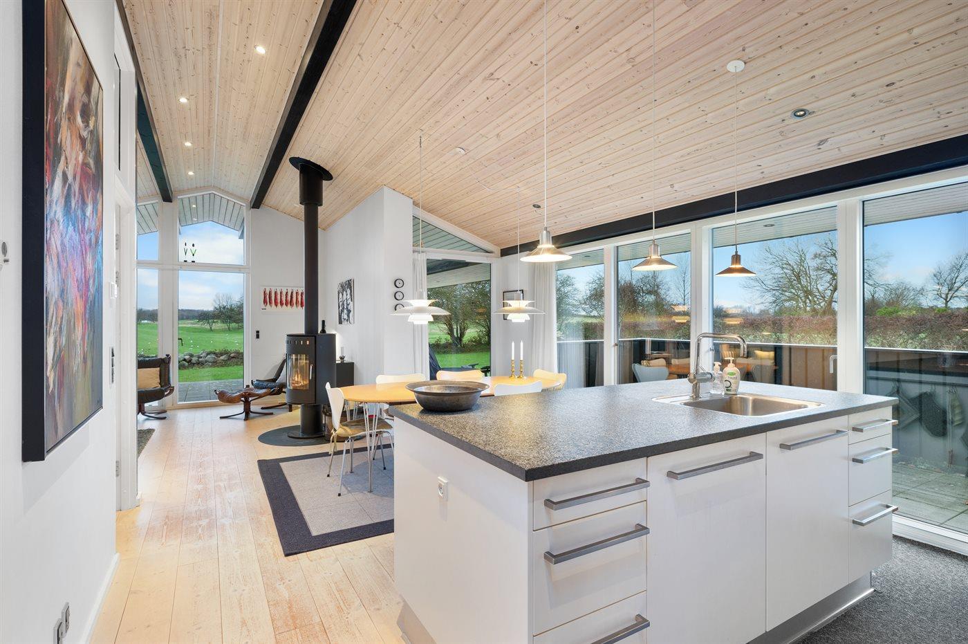 Køkkenet er udstyret med 1 køleskab. Der er 4 induktionskogeplader, varmluftovn samt opvaskemaskine.