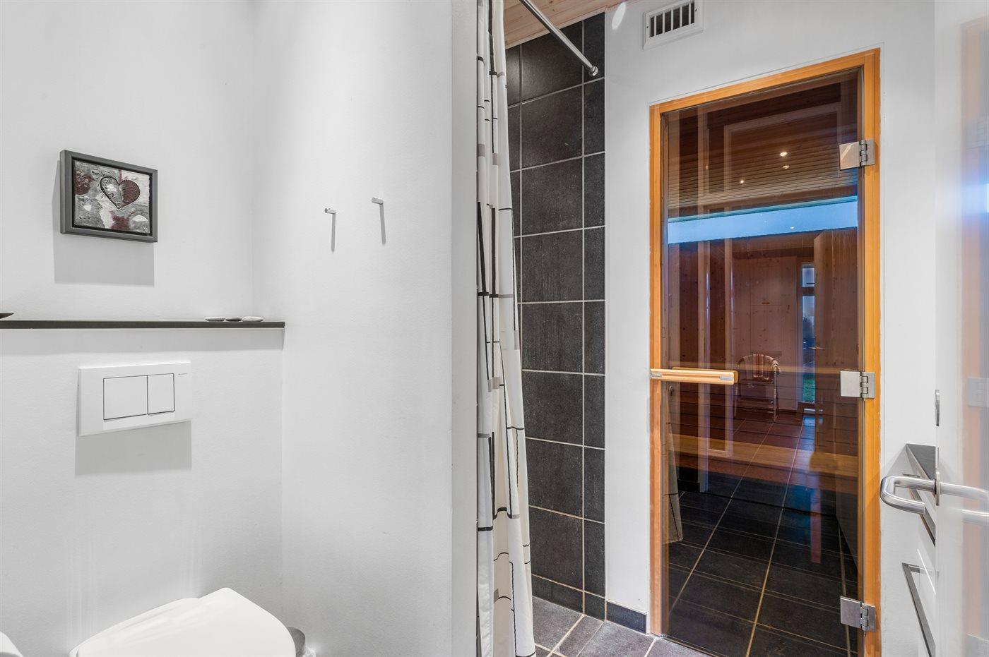 Der er 2 badeværelser med bruseniche og 2 toiletter. Der er gulvvarme på 2 badeværelser. I saunaen er der mulighed for afslapning.