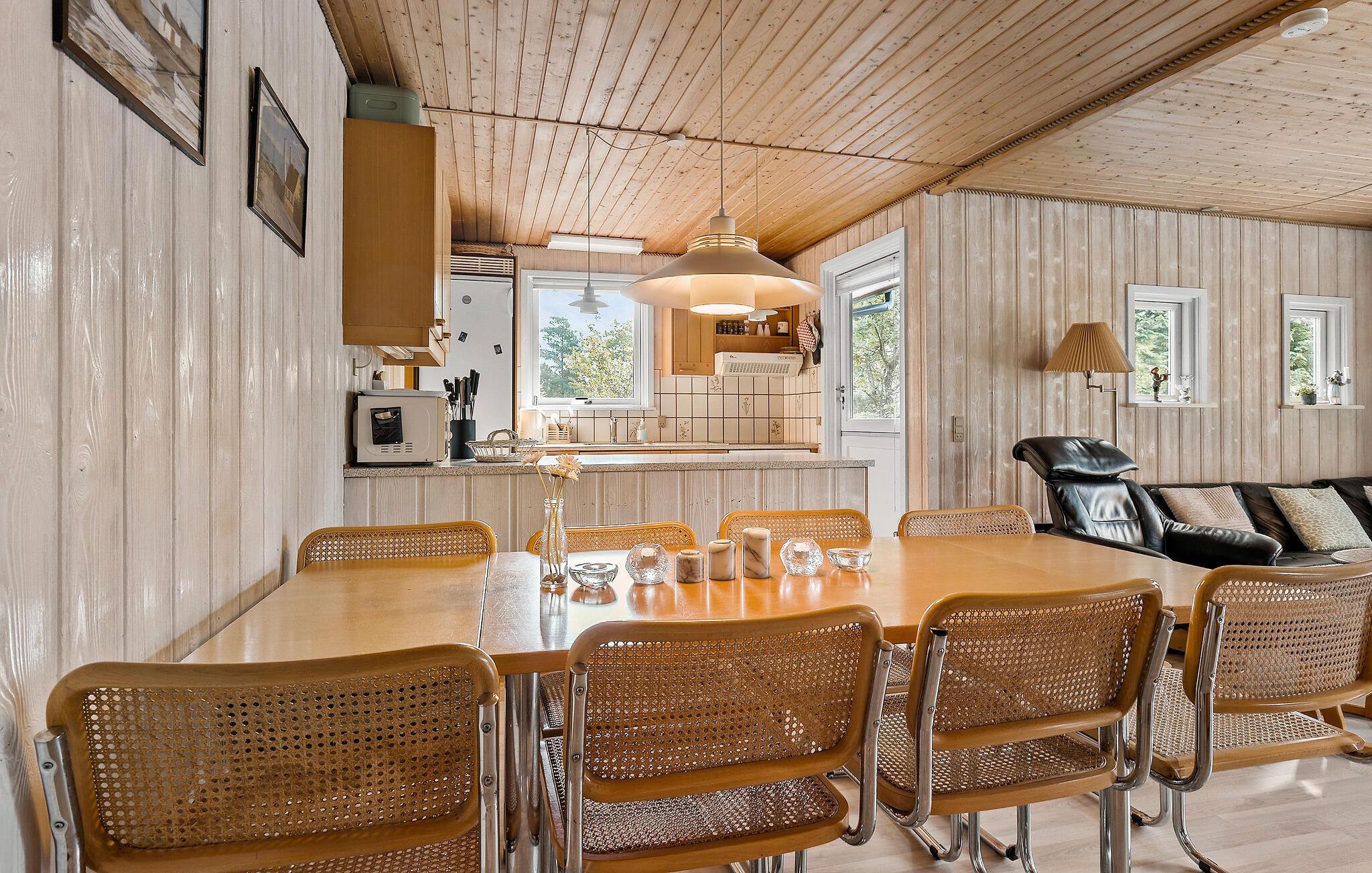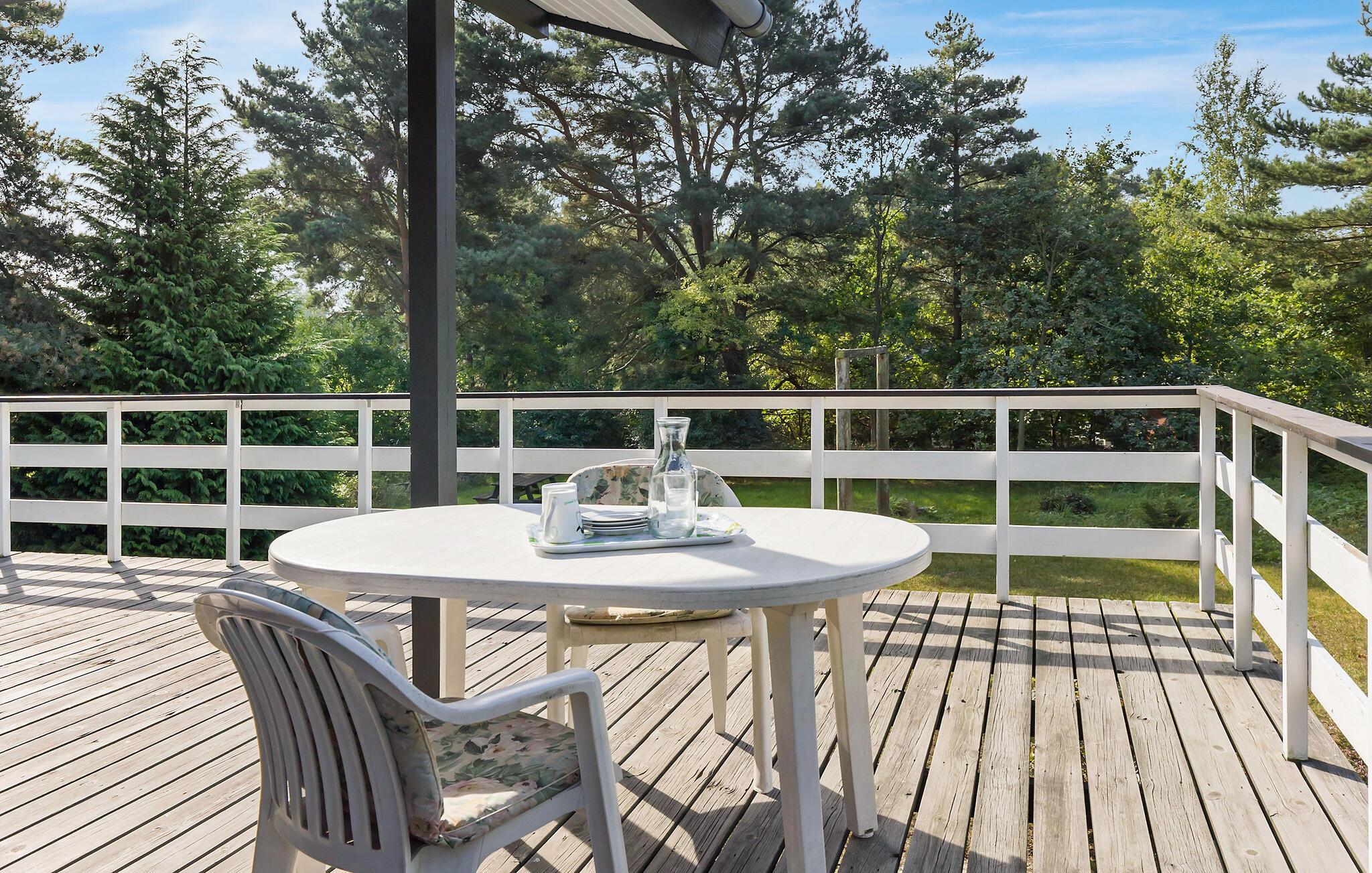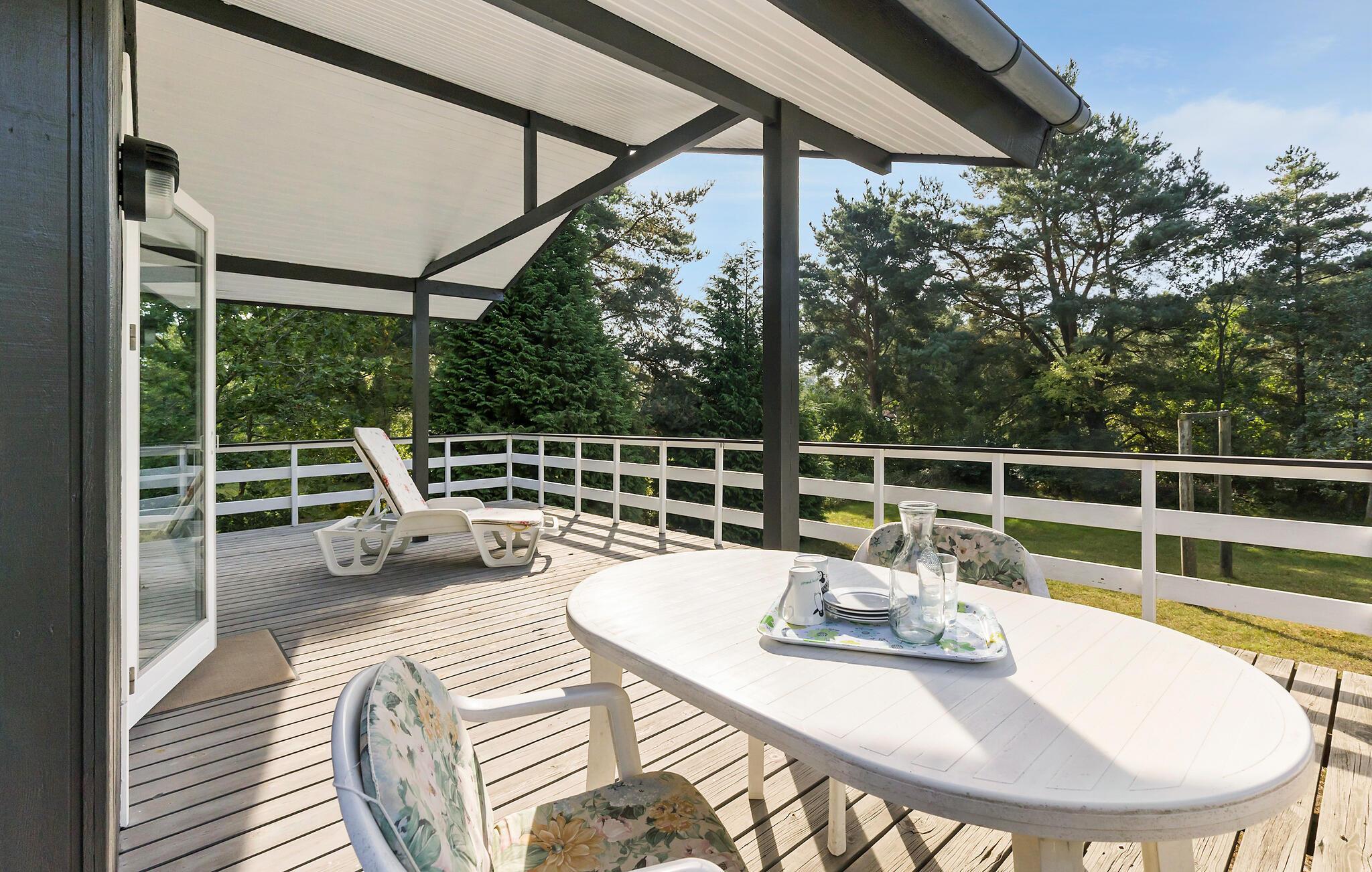 Hyggeligt træsommerhus i roligt område nær strand med stor terrasse og brændeovn.