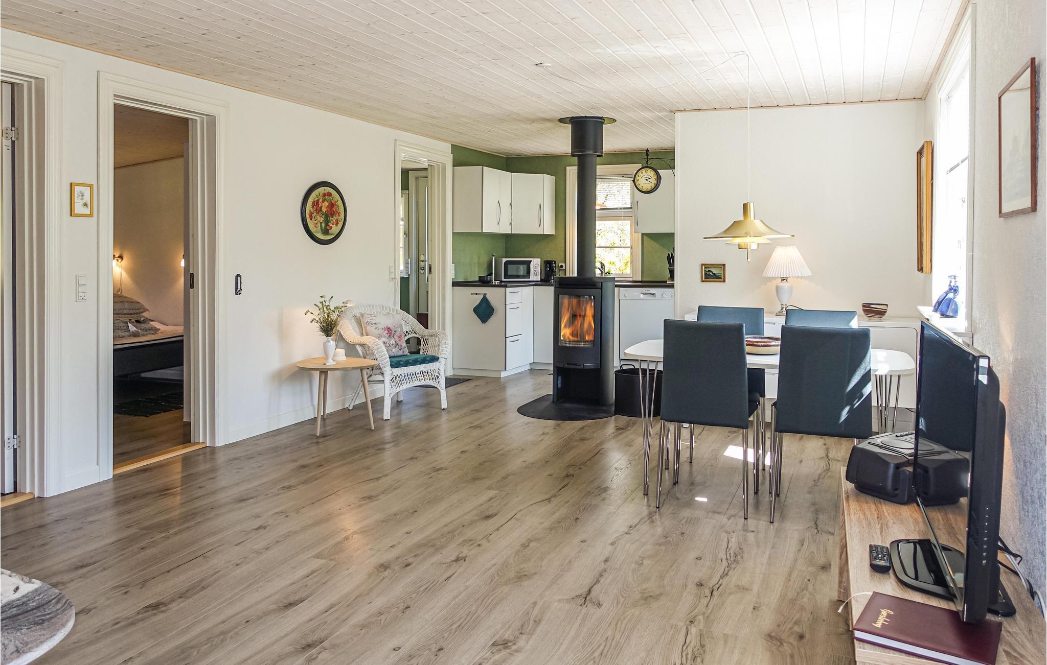 Hyggeligt sommerhus kun 300 meter fra børnevenlig sandstrand med brændeovn og delvis overdækket terrasse.