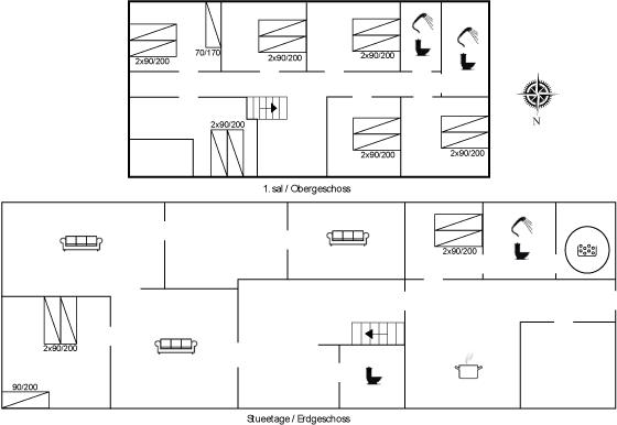 Ejendommen indeholder 8 soveværelser – 2 i stueetagen og 6 på 1. sal. Således kan I trække jer tilbage til den rolige overetage selv om aktiviteterne fortsætter nedenunder. Sengepladserne er fordelt på 17 sengepladser og 6 madrasser på hemse.