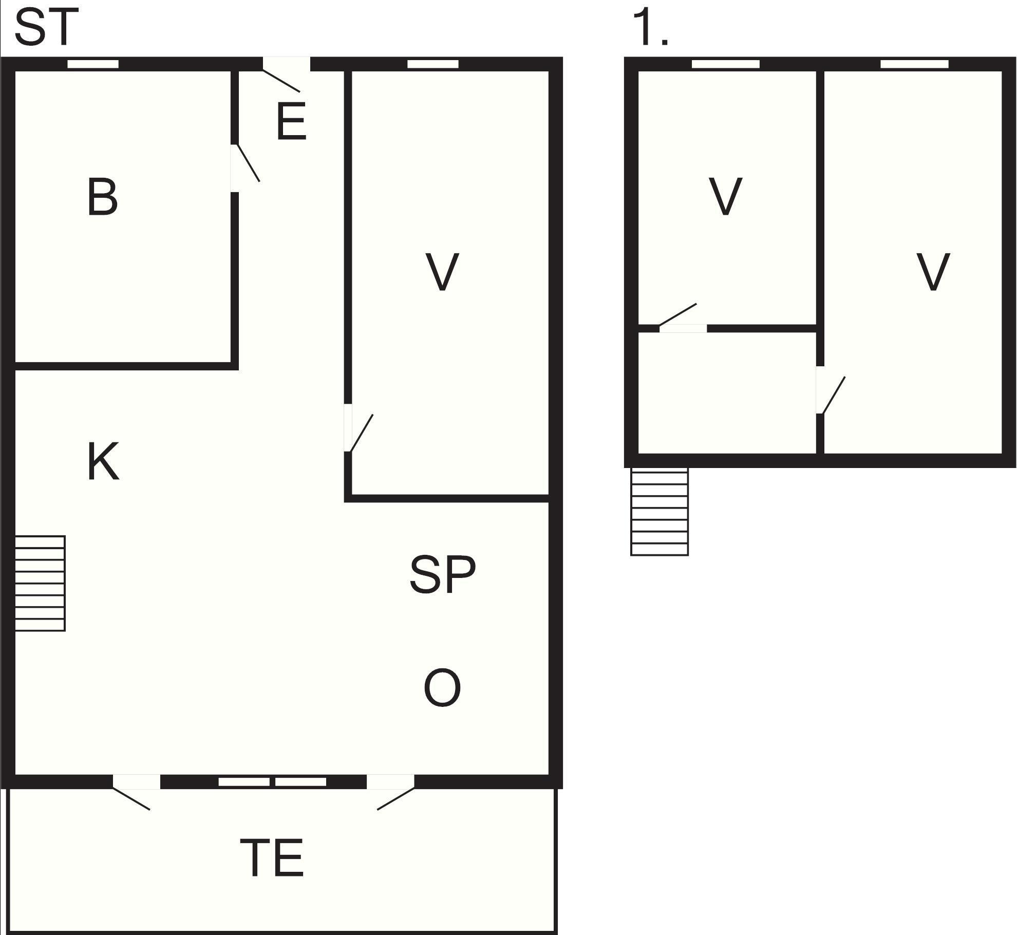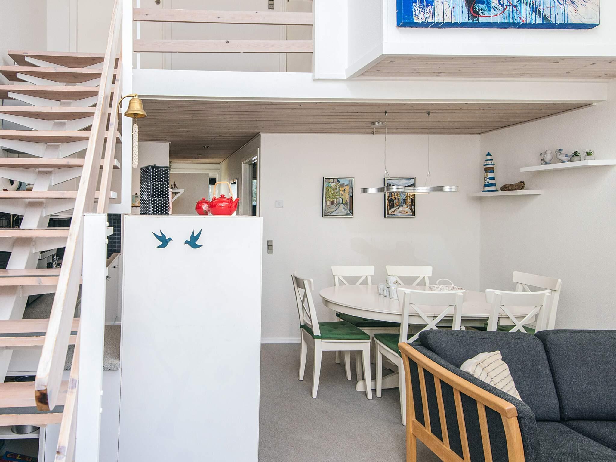 I hjertet af lejligheden er det åbne køkken og opholdsstue, et indbydende rum, hvor madlavning, spisning og afslapning naturligt flyder sammen. Stuens skråloft skaber en luftig og rummelig atmosfære, forstærket af generøse terrassedøre, der fylder rummet med naturligt lys. Herfra har du direkte adgang til terrassen, komplet med en spiseplads til at nyde måltider i den friske havluft eller blot slappe af efter en dag med eventyr.