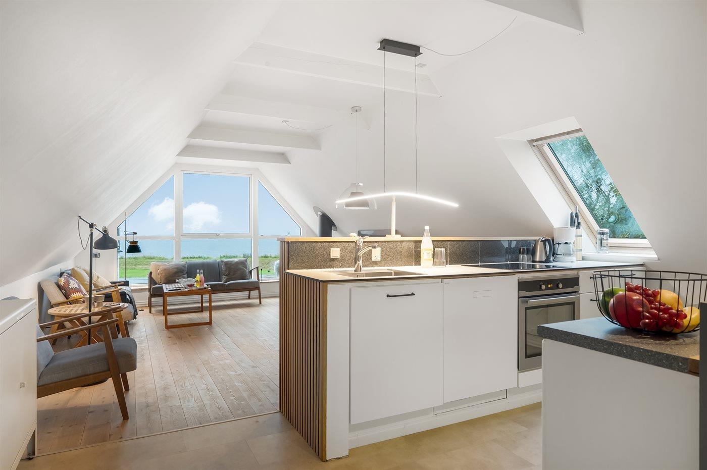 Køkkenet er udstyret med 1 køleskab. Der er 4 induktionskogeplader, varmluftovn, mikrobølgeovn samt opvaskemaskine.