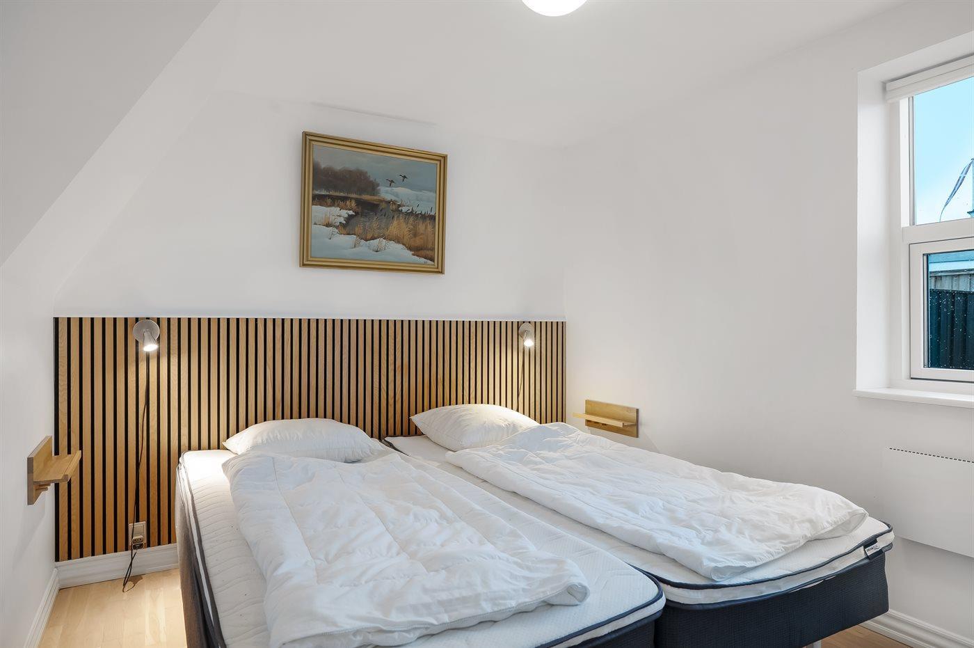 Der er i alt 3 soveværelser. Sovepladserne fordeler sig på: 6 sovepladser i dobbeltsenge. 2 sovepladser i enkeltsenge. Derudover er der 1 stk. barneseng.