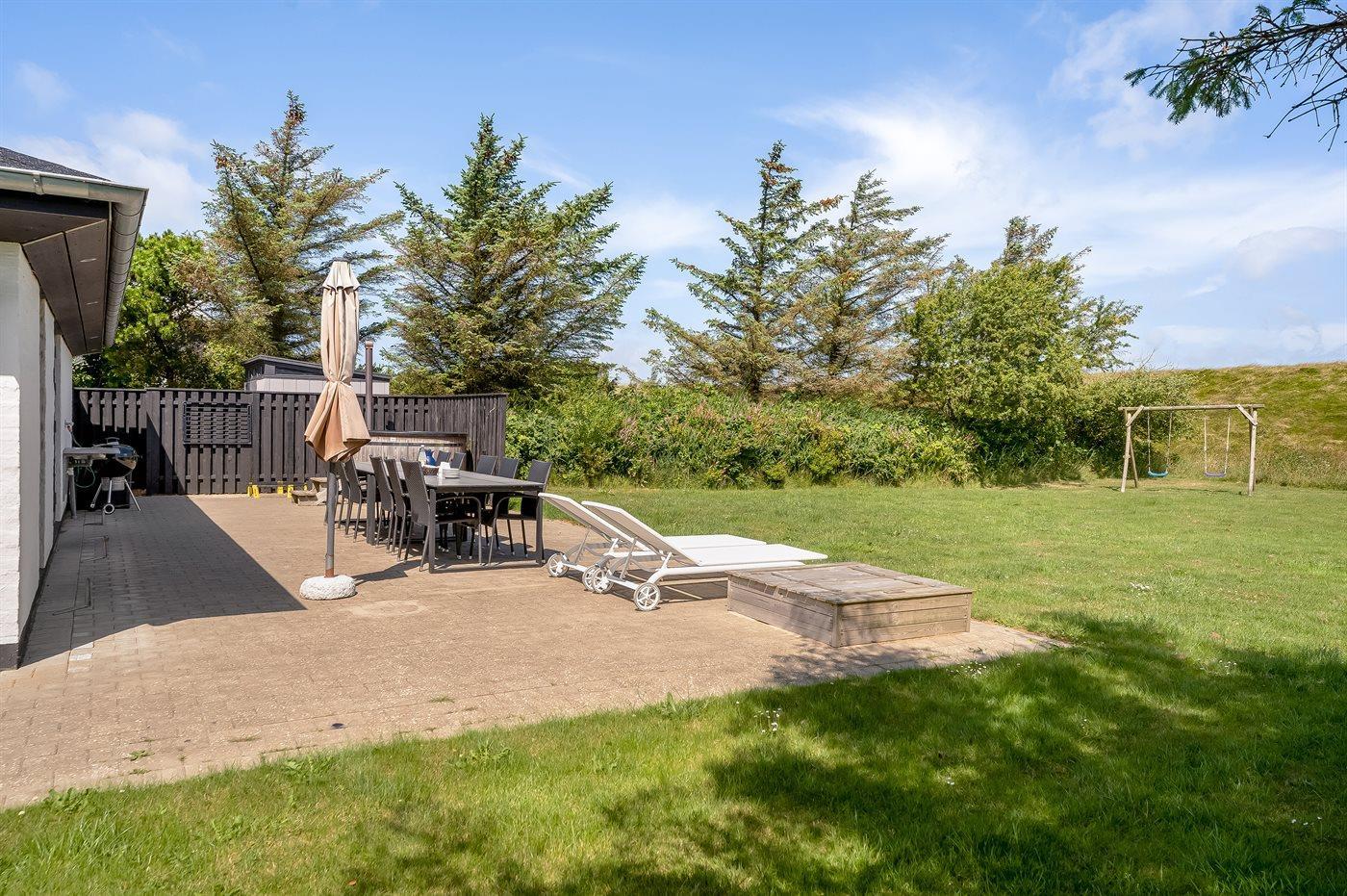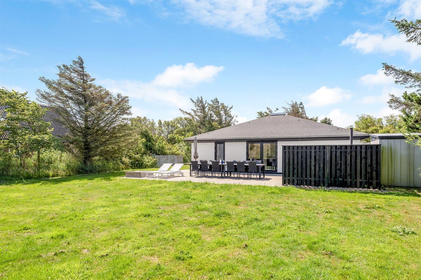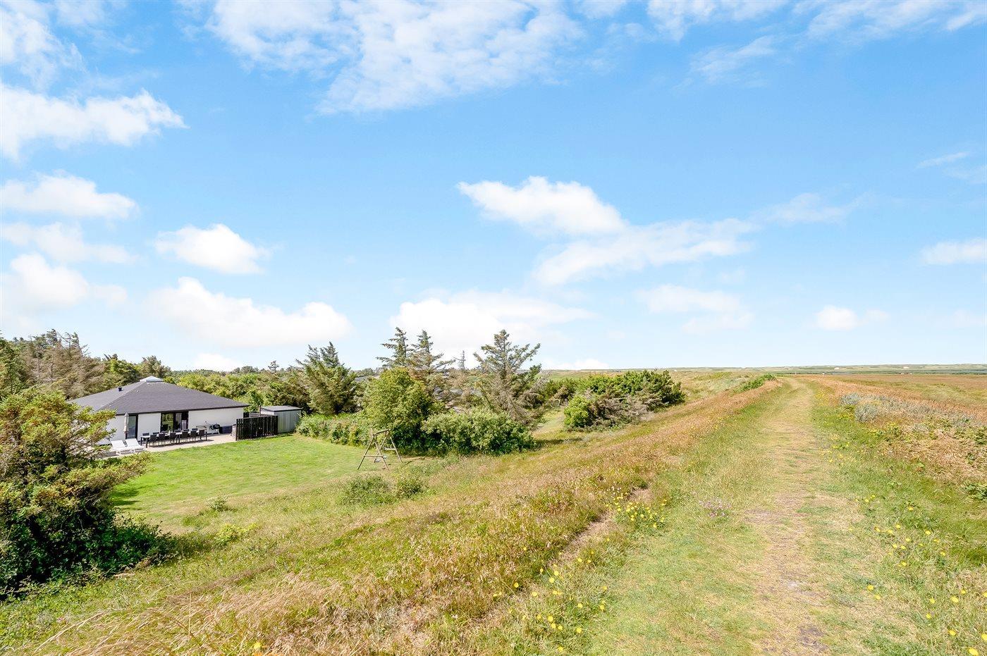 Ferieboligen er beliggende på en 1250 m² stor naturgrund. Der er 800 m til havet. Der er 500 m til fjorden. Der er en sø i en afstand af 40 m. Nærmeste forretning er beliggende i en afstand af 800 m. Der er en golfbane i en afstand af 12000 m. Til ferieboligen hører åbent terrasseareal. Gynge. Sandkasse. Grill til rådighed. Der er installeret stik til opladning af elbil. Parkering ved ferieboligen.