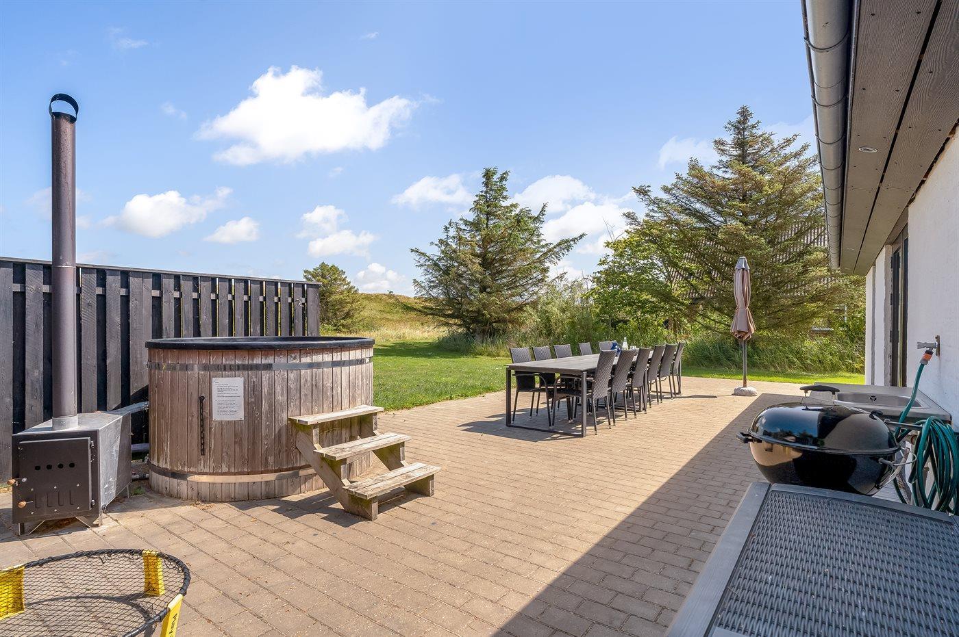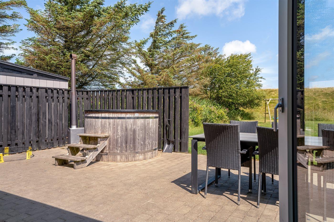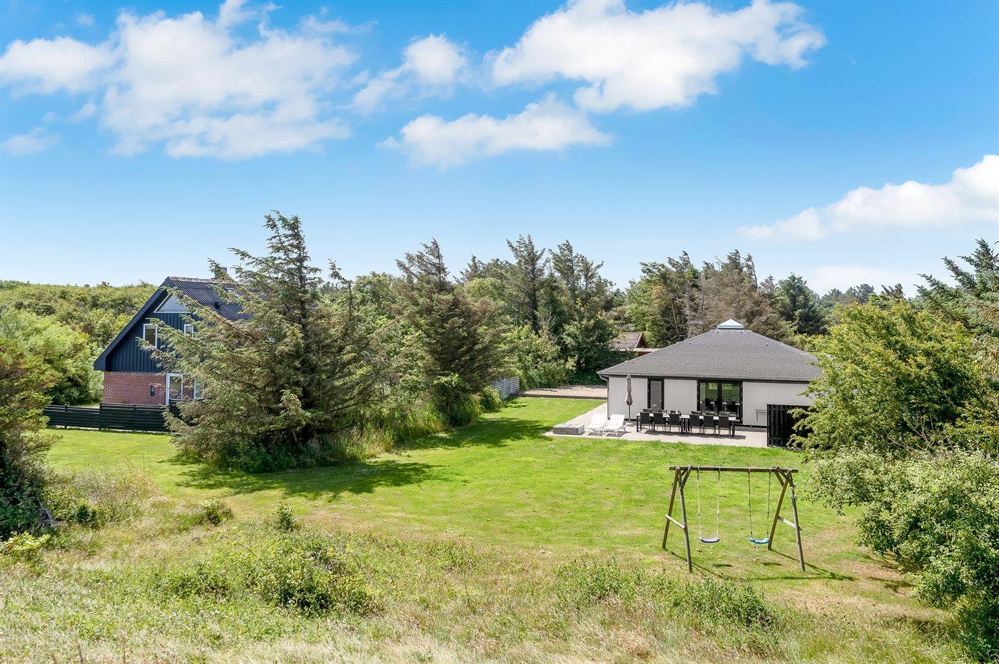 Ferieboligen er beliggende på en 1250 m² stor naturgrund. Der er 800 m til havet. Der er 500 m til fjorden. Der er en sø i en afstand af 40 m. Nærmeste forretning er beliggende i en afstand af 800 m. Der er en golfbane i en afstand af 12000 m. Til ferieboligen hører åbent terrasseareal. Gynge. Sandkasse. Grill til rådighed. Der er installeret stik til opladning af elbil. Parkering ved ferieboligen.