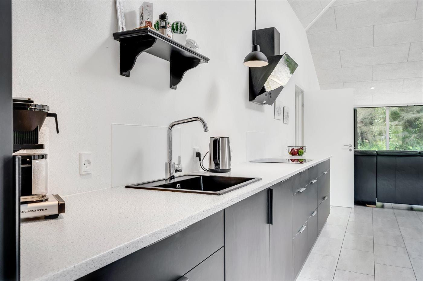 Køkkenet er udstyret med 1 køleskab. Der er 4 elkogeplader, varmluftovn, mikrobølgeovn samt opvaskemaskine.