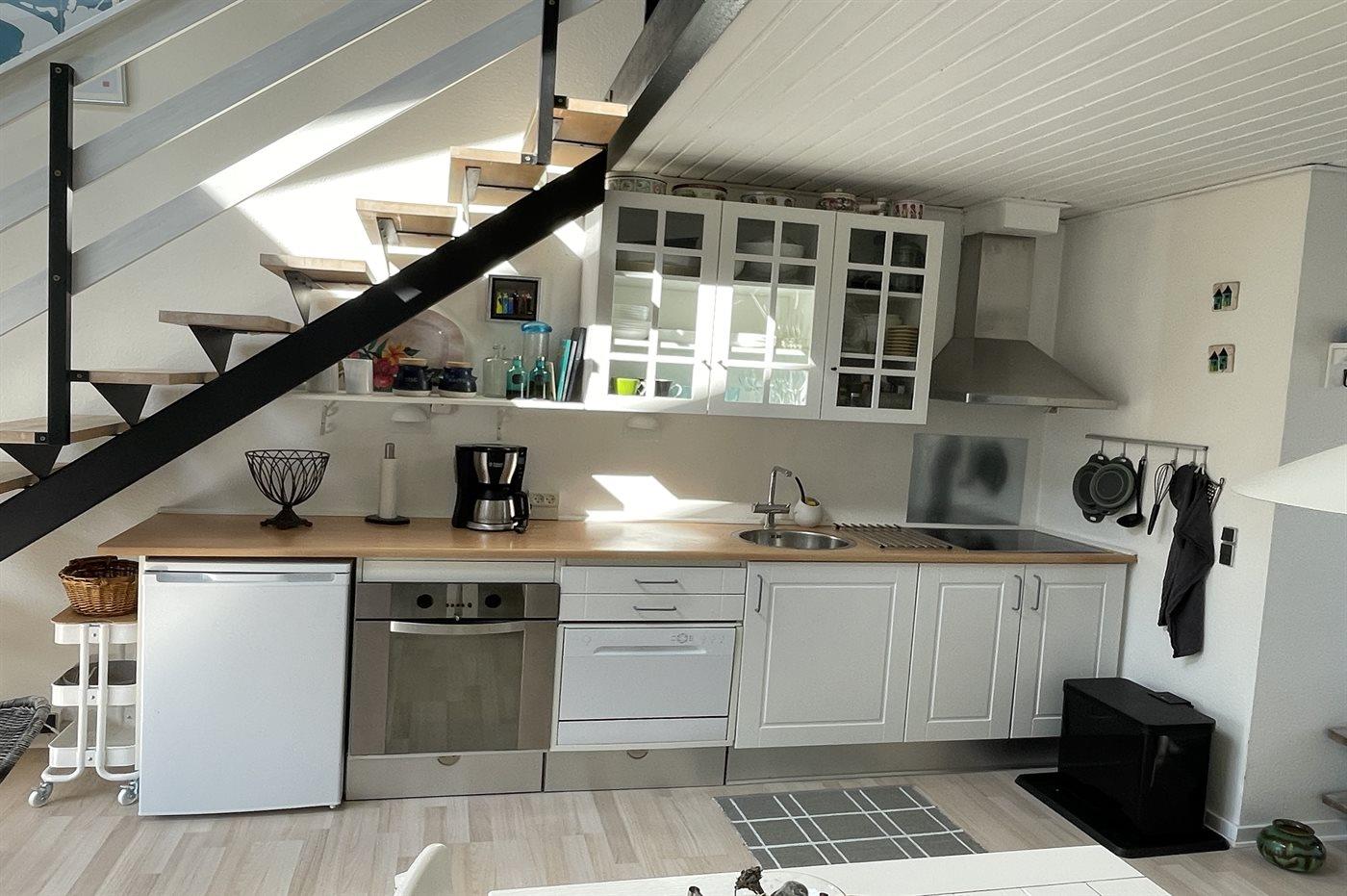 Køkkenet er udstyret med 1 køleskab. Der er 4 keramiske kogeplader, varmluftovn samt opvaskemaskine.
