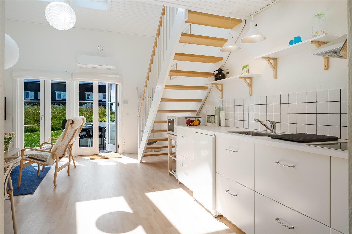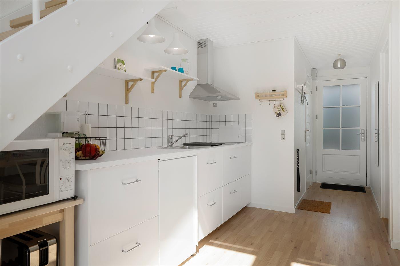 Køkkenet er udstyret med 1 køleskab. Der er 4 keramiske kogeplader, varmluftovn, mikrobølgeovn.