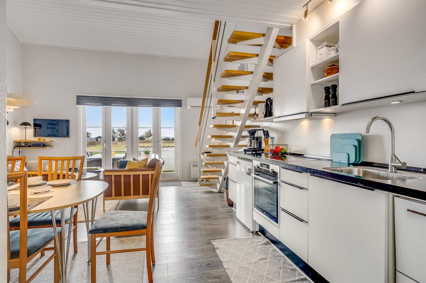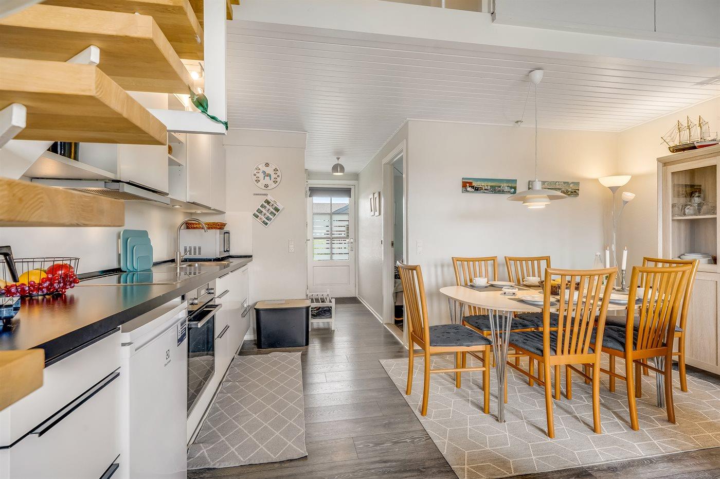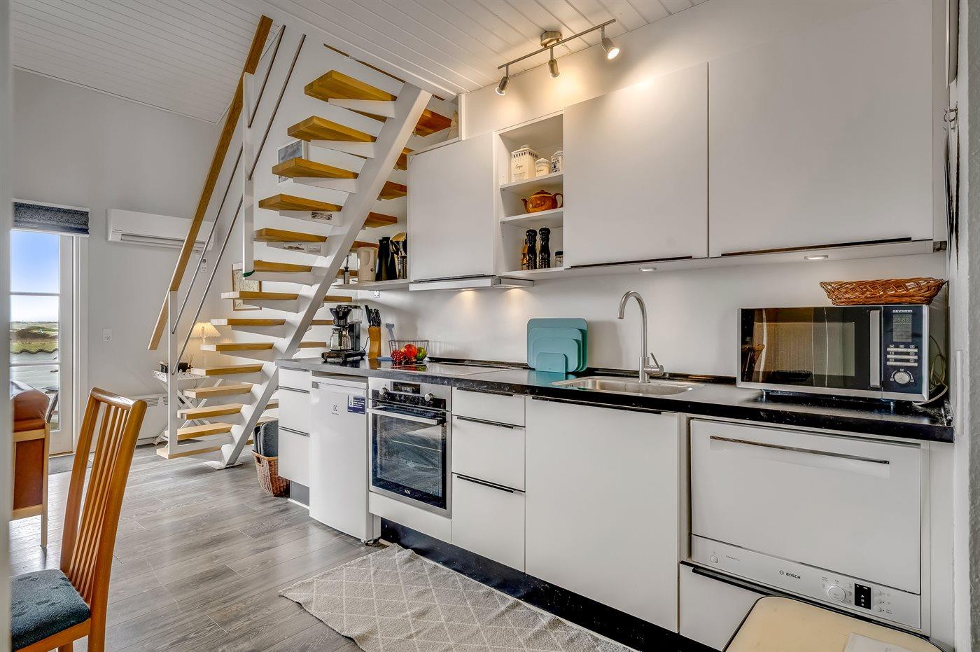 Køkkenet er udstyret med 1 køleskab. Der er 4 induktionskogeplader, varmluftovn, mikrobølgeovn samt opvaskemaskine.