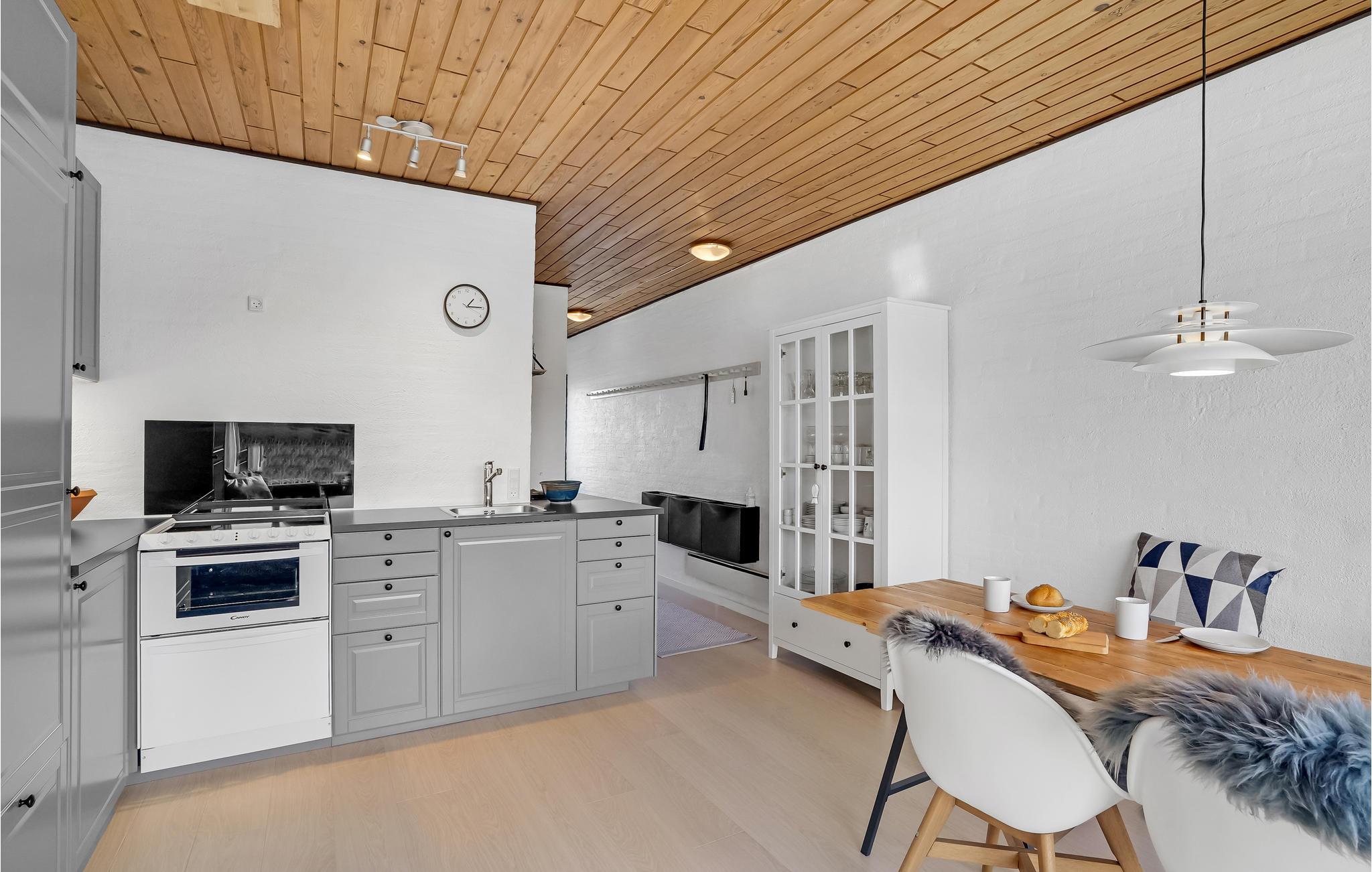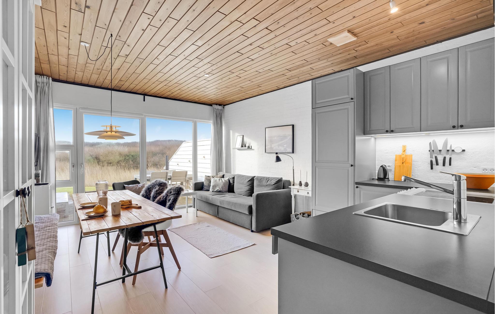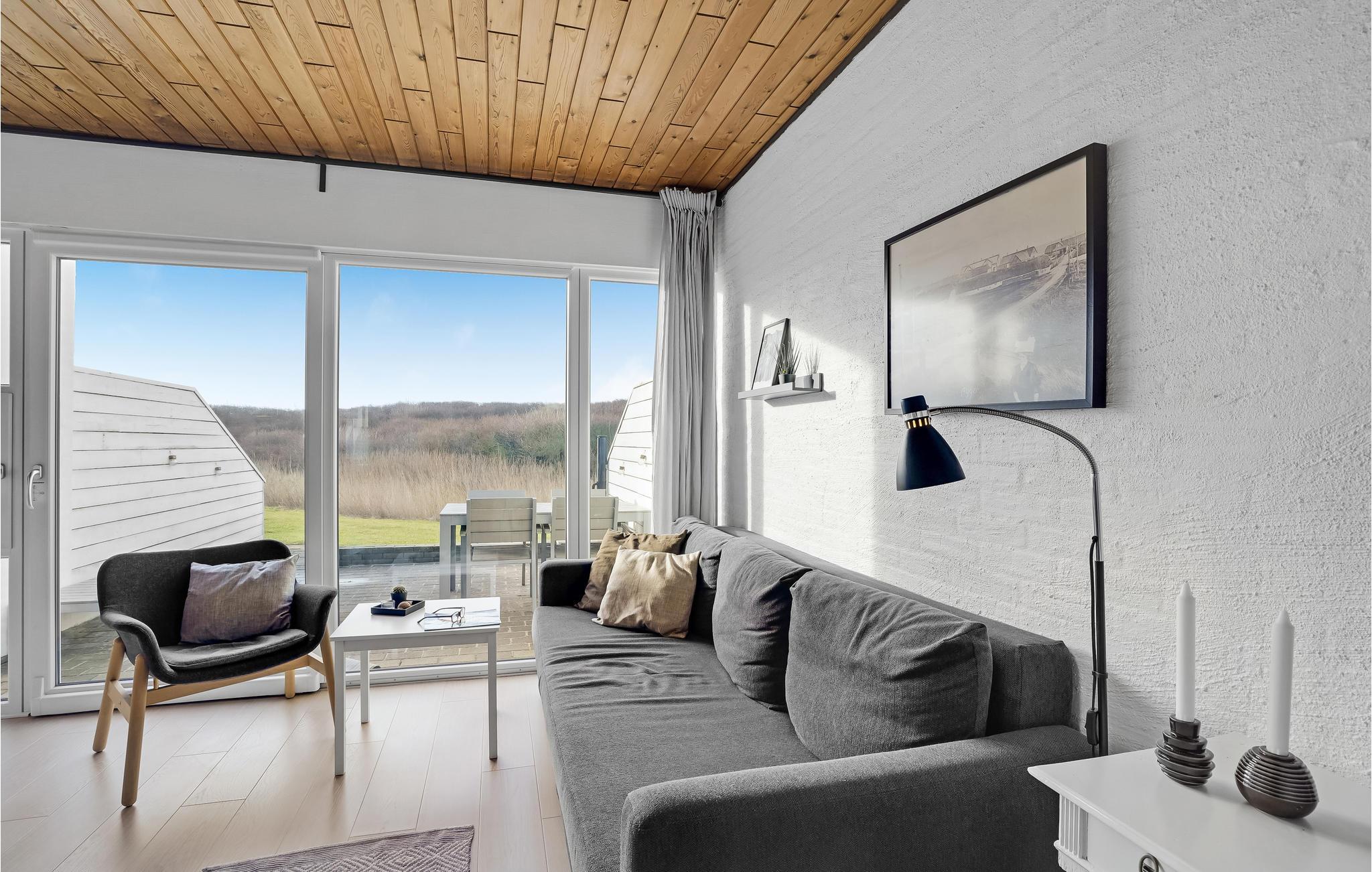 Lejligheden er indrettet til 4 personer med soveværelse med dobbeltseng samt 2 sovepladser i stuen på en sovesofa. Køkkenet er kombineret med stuen. Der TV i stuen med programmer fra Altibox med bla. DR, TV2, flere tyske og skandinaviske programmer. Der er desuden Chromecast og lynhurtig fiber internetforbindelse, så gæsterne kan streame deres egen tv-pakker. Der er pænt badeværelse med bordarrangement med håndvask, toilet og bruseniece. Der er dejligt terrasse med udsigt til naturområdet. Feriecentret er beliggende kun 100 meter fra det brusende Vesterhav og badestranden.