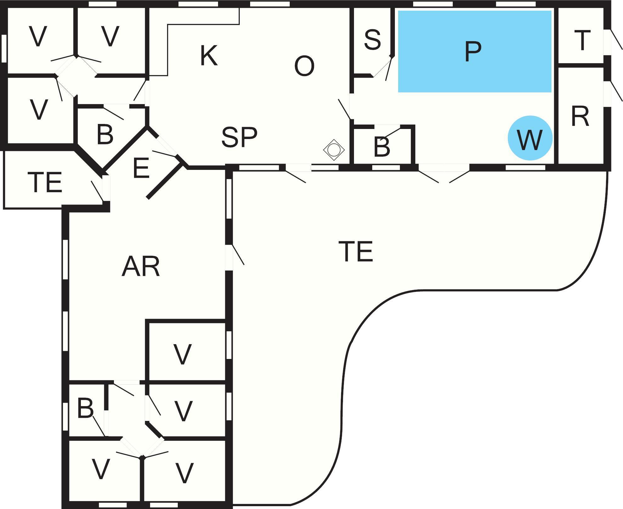 Huset er yderst rummeligt og veldimensioneret og bygget op omkring 2 separate soveafdelinger. Hver afdeling har 1 badeværelse og ekstra badeværelse i forbindelse med poolafdelingen. I alt 3 badeværelser, der selvfølgelig alle har varme i gulvene.