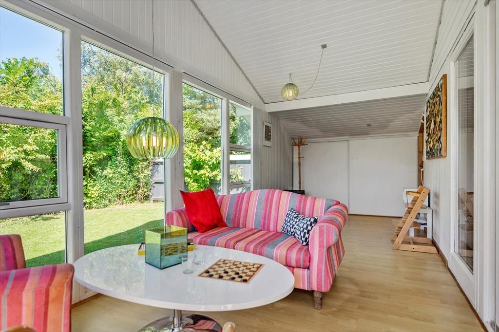 Indenfor møder du et lyst og åbent rum, der elegant lader naturens grønne farver trænge ind gennem de store vinduer. Her er gode rammer til både smilede samtaler og stille stunder, hvor du kan trække vejret dybt og lade tankerne falde til ro. Som et ekstra hjerterum finder du den hyggelige udestue, der hurtigt bliver et favoritsted. Her kan du sætte dig med en bog, lytte til regnen, lade lyset omfavne dig eller blot nyde udsigten til haven, mens dagen glider roligt afsted. Materialerne i hele huset er varme, stemningen indbydende, og når aftenen falder på, er det let at finde en ro der fylder hele huset med feriefølelse.