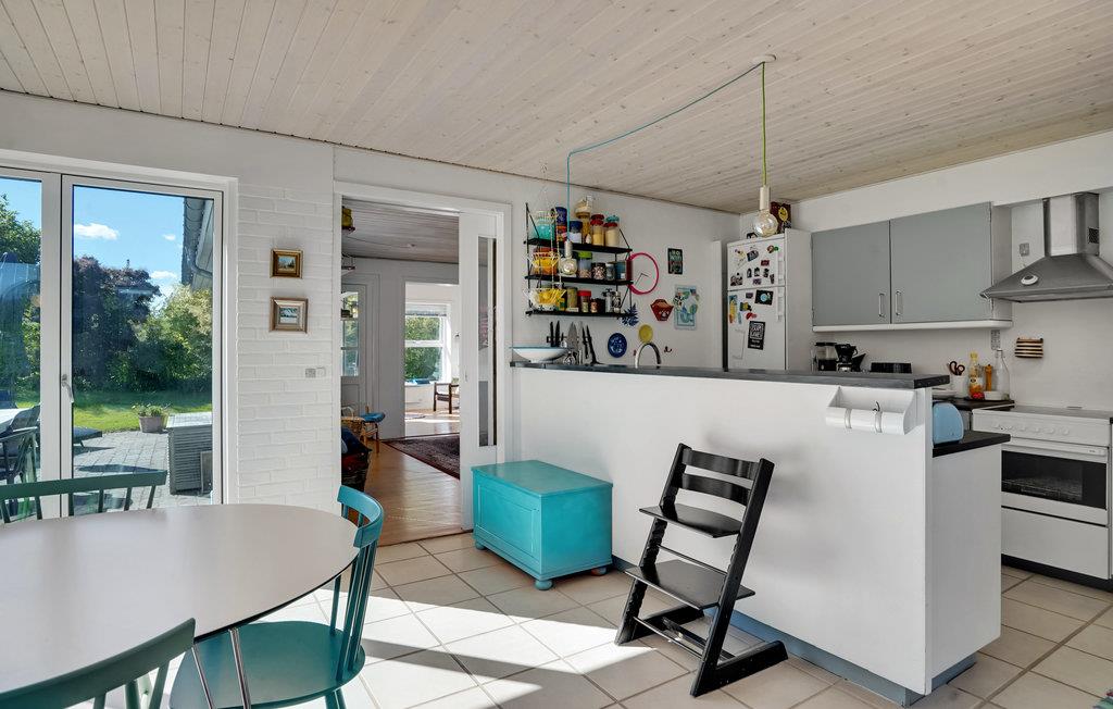 Dette flotte, indbydende feriehus i Ajstrup Strand bliver en skøn ramme om jeres ferie i det østjyske. Her kan I se frem til en skøn bolig fyldt med stil og charme, hvor det er nemt at slappe af. Det store køkken bliver centrum for eftermiddagshyggen, hvor I kan hygge jer med madlavningen, mens børnene tegner eller spiller brætspil rundt om det store spisebord. I vinterhalvåret kan I tænde op i brændeovnen i morgentimerne. Når dagen er forbi, kan I læne jer tilbage i sofaerne.
