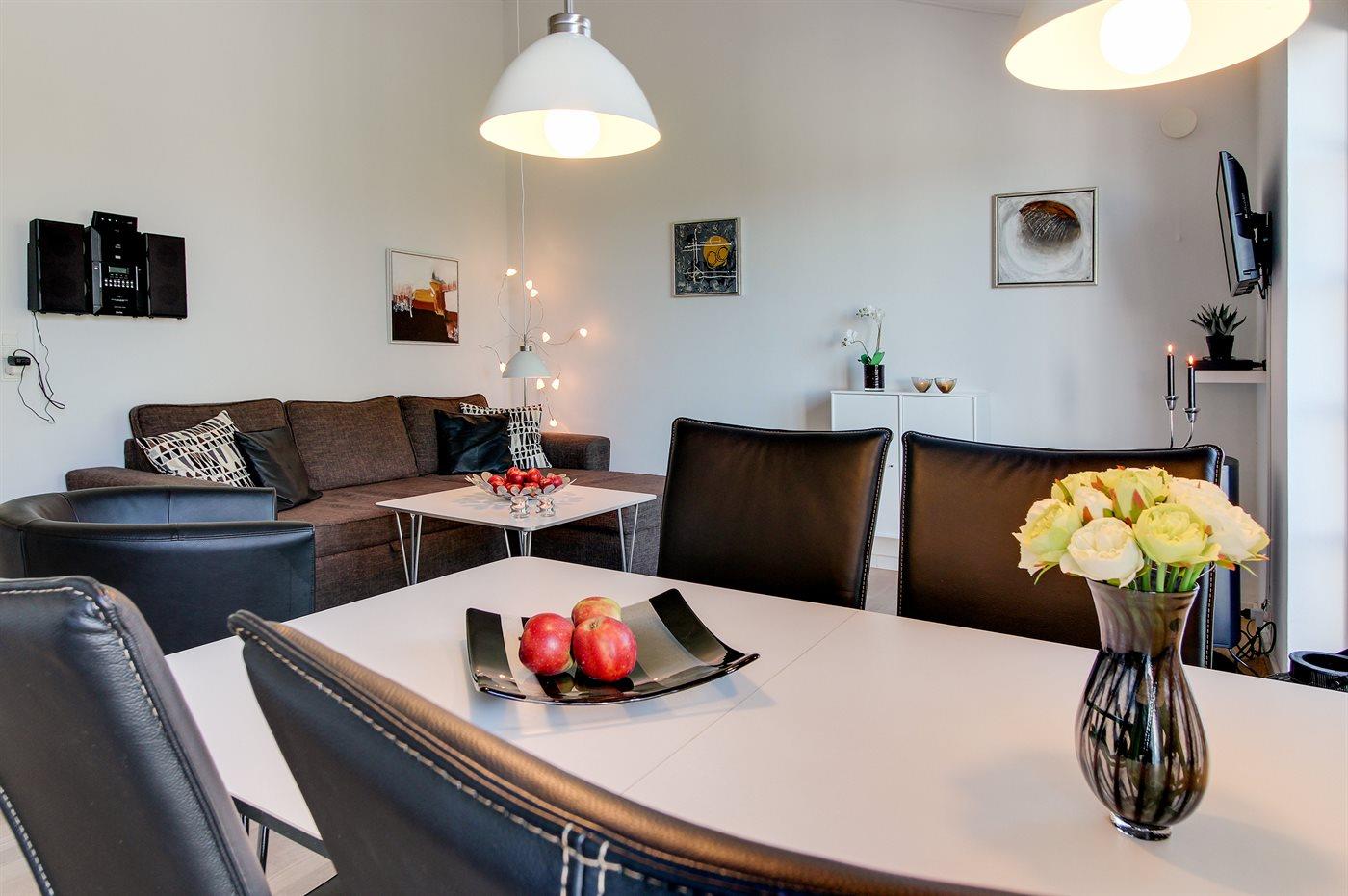 Lys og renoveret ferielejlighed i Sandkås med havudsigt og fælles opvarmet swimmingpool.