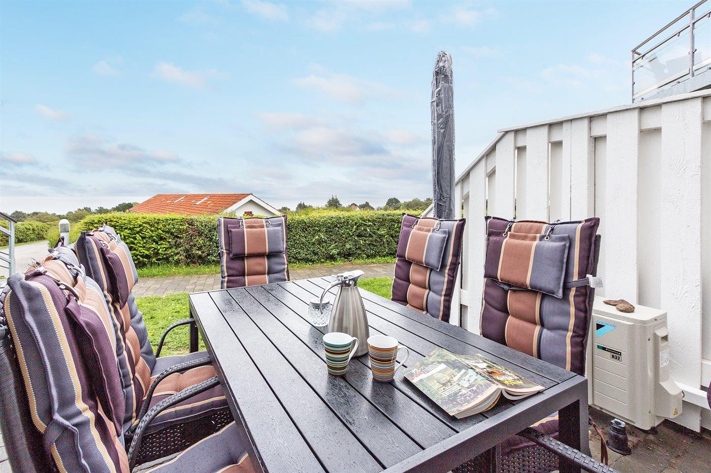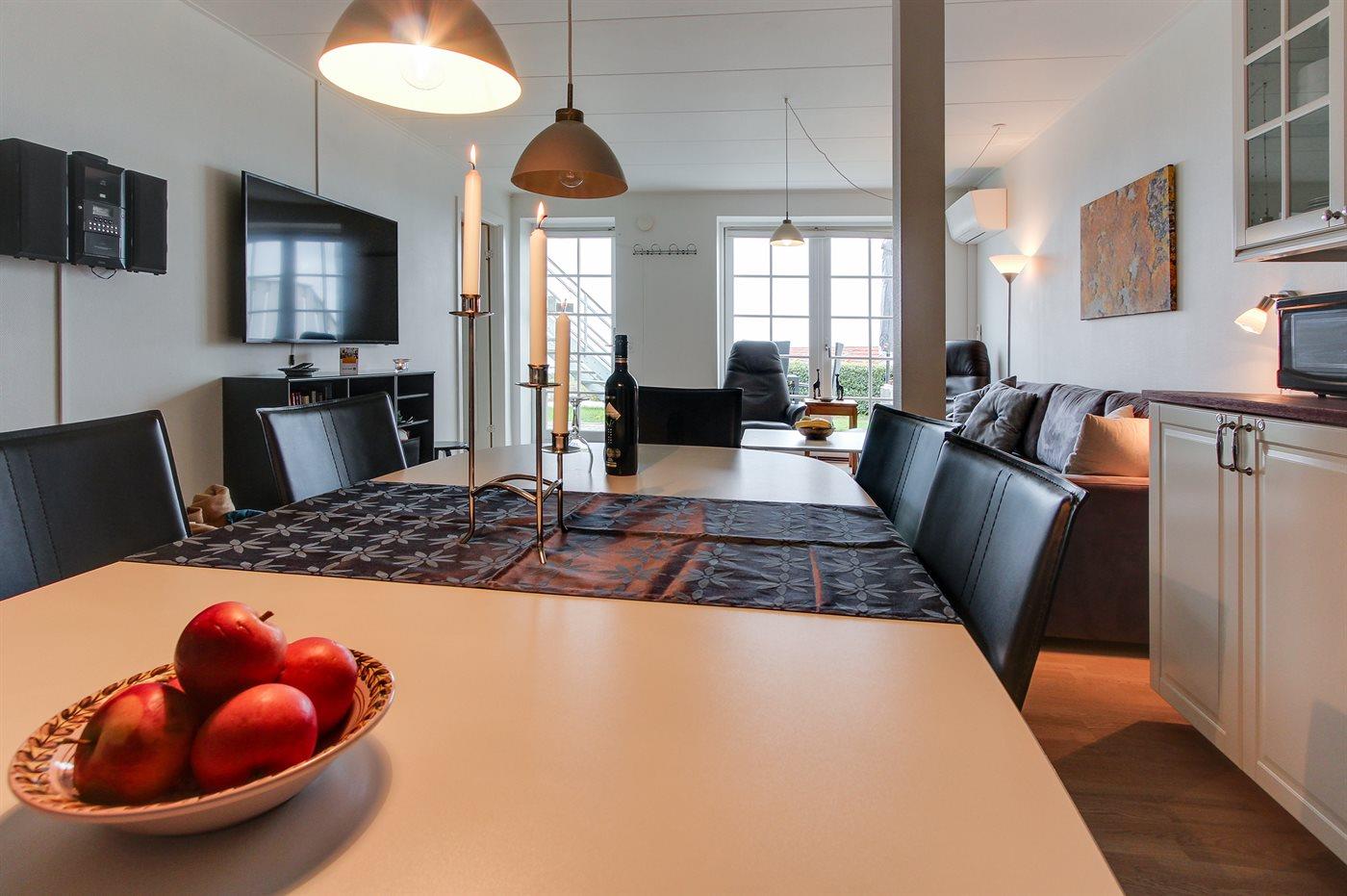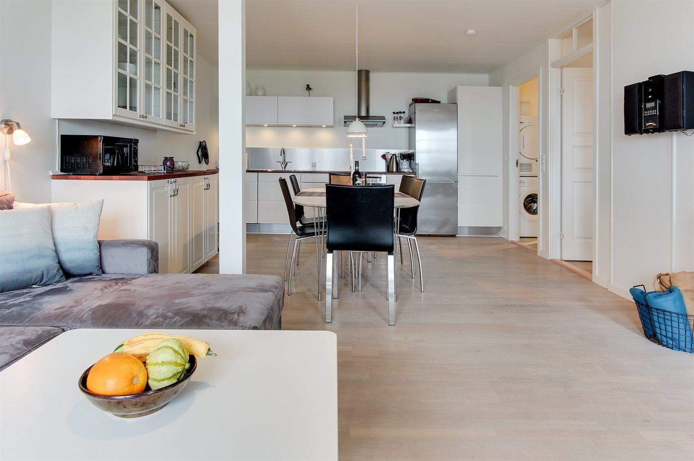 Rummelig, lys ferielejlighed med havudsigt, terrasse og adgang til opvarmet pool i naturskønne Sandkås.