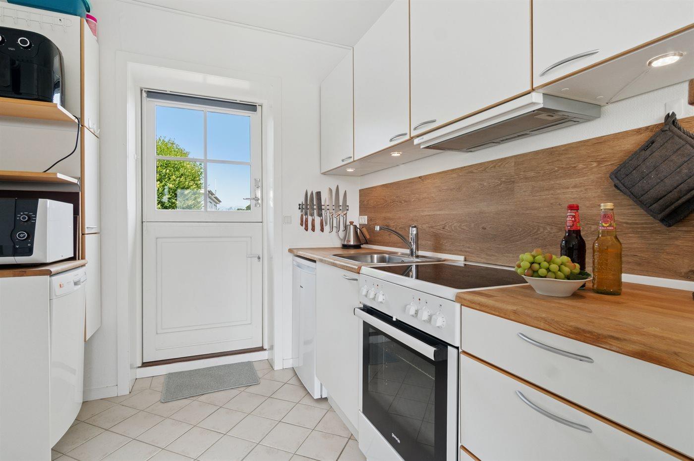 Køkkenet er udstyret med 1 køleskab. Der er 4 keramiske kogeplader, varmluftovn, mikrobølgeovn samt opvaskemaskine Der er gulvvarme i køkkenet.