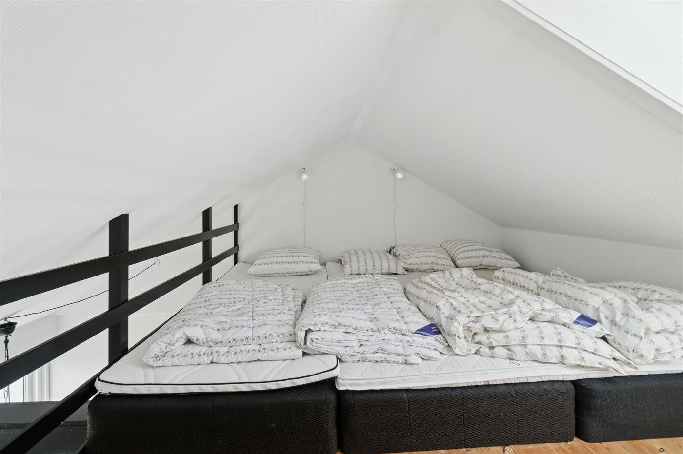 Sovepladserne fordeler sig på: 3 sovepladser i enkeltsenge. 2 sovepladser i sovesofa (dobbelt). 2 af disse sovepladser befinder sig i opholdsstuen og 2 af dem befinder sig på hemsen.