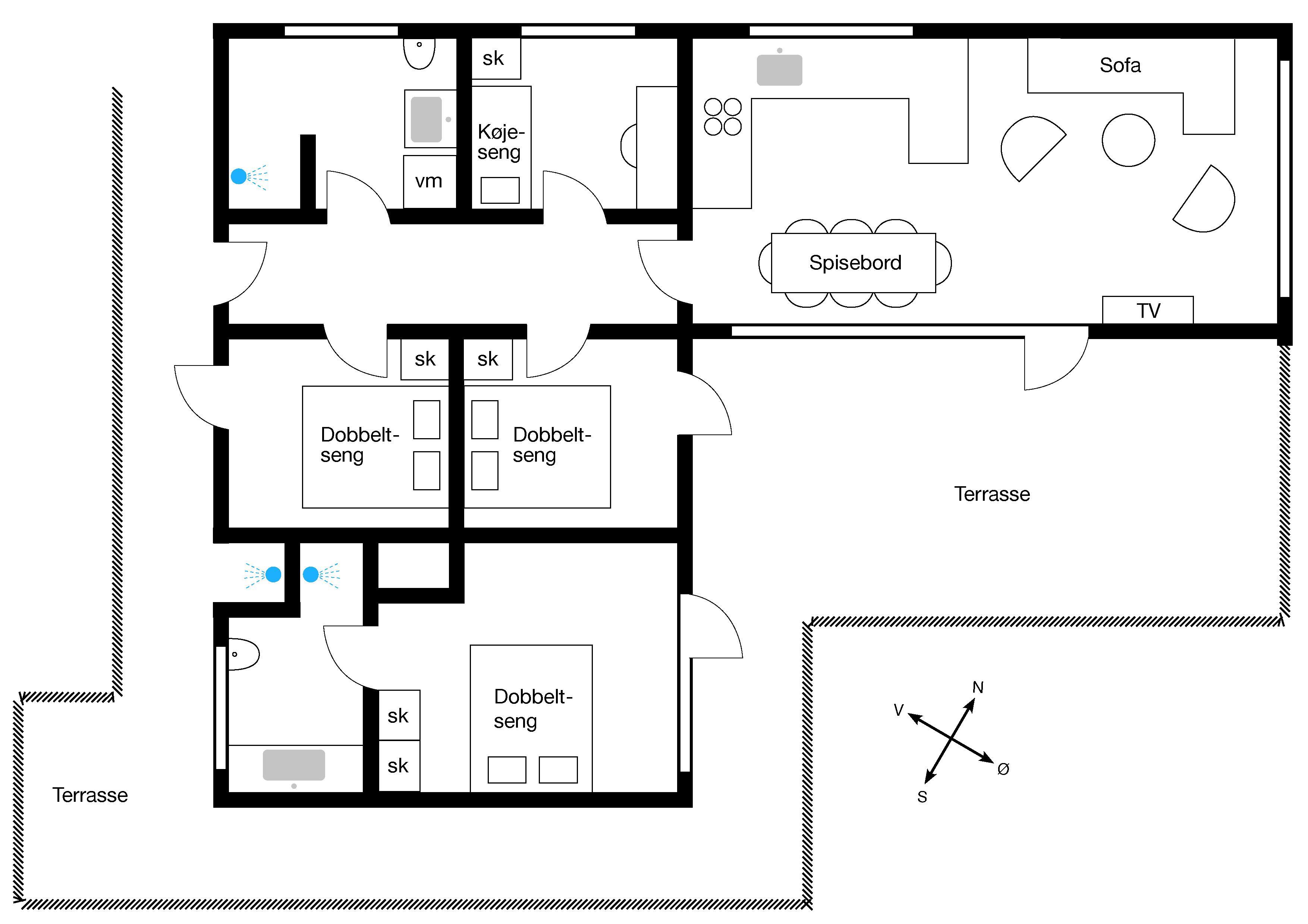 Der er i alt 4 soveværelser. Sovepladserne fordeler sig på: 6 sovepladser i dobbeltsenge. 2 sovepladser i køjeseng.